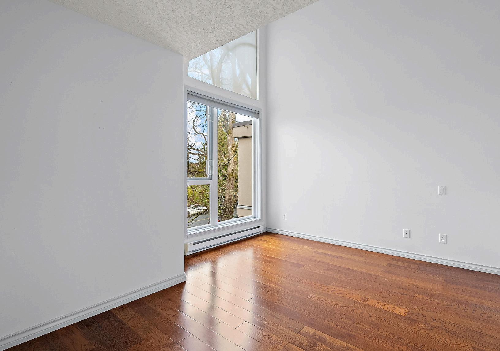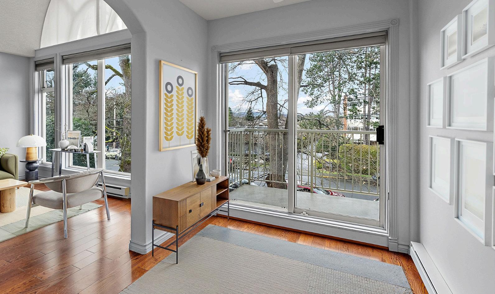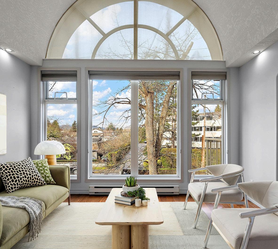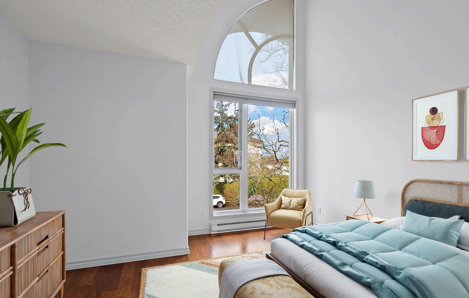 This beautifully updated top-floor unit offers 1,161 sq ft of bright and inviting living space with high vaulted ceilings and impressive floor-to-ceiling windows that fill the home with natural light. The desirable west-facing exposure provides a warm, sunny outlook over the surrounding neighbourhood and lovely sunsets from your private deck.