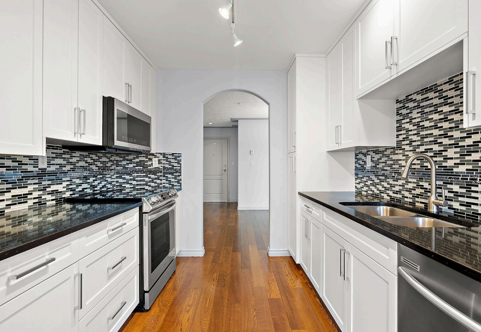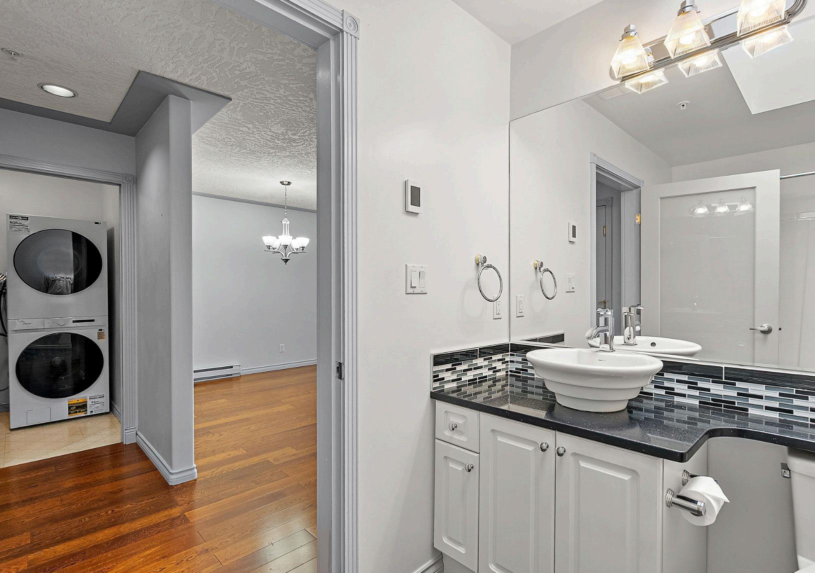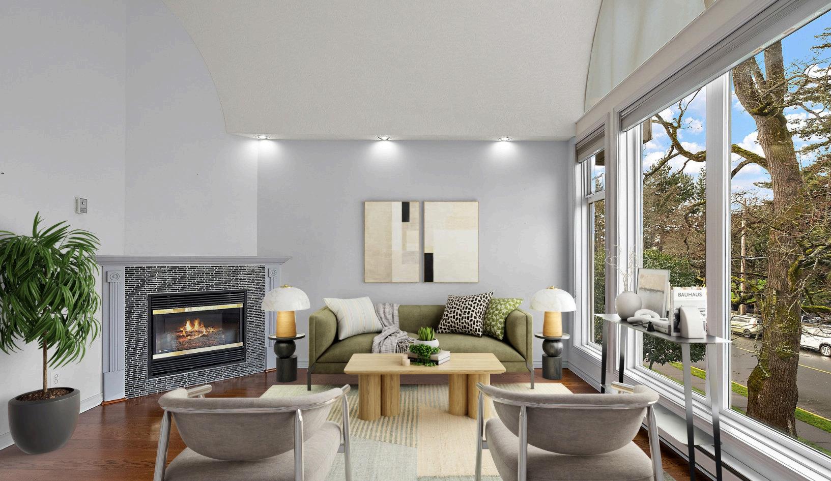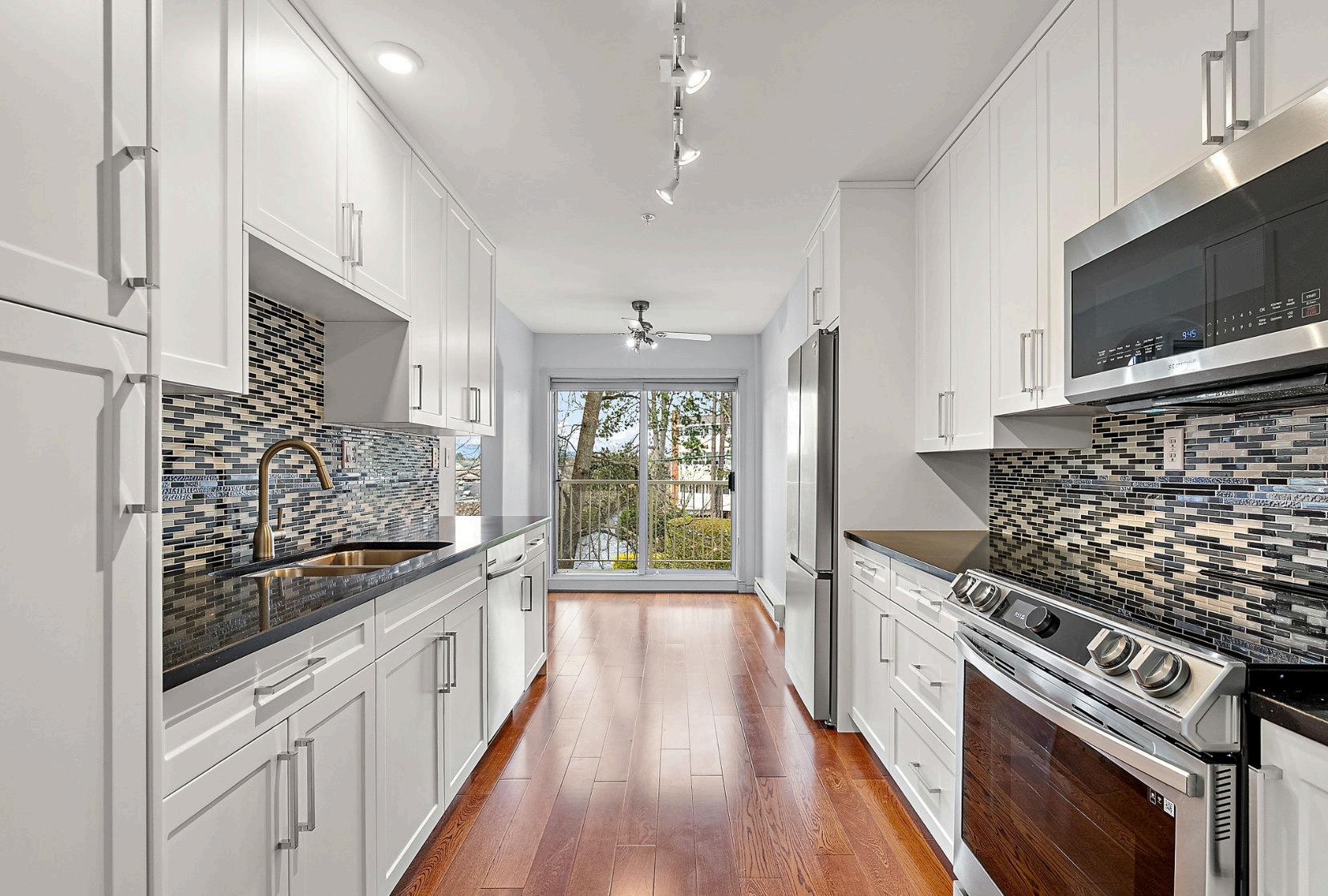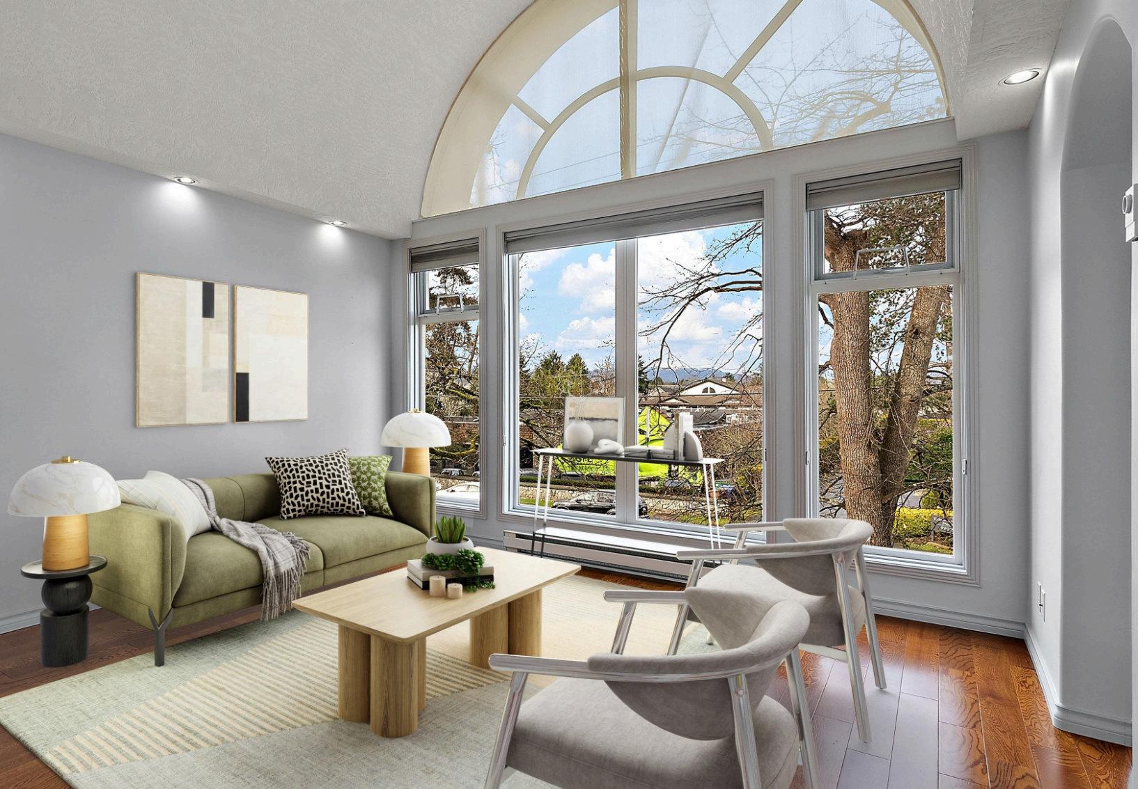 This beautifully updated top-floor unit offers 1,161 sq ft of bright and inviting living space with high vaulted ceilings and impressive floor-to-ceiling windows that fill the home with natural light. The desirable west-facing exposure provides a warm, sunny outlook over the surrounding neighbourhood and lovely sunsets from your private deck.