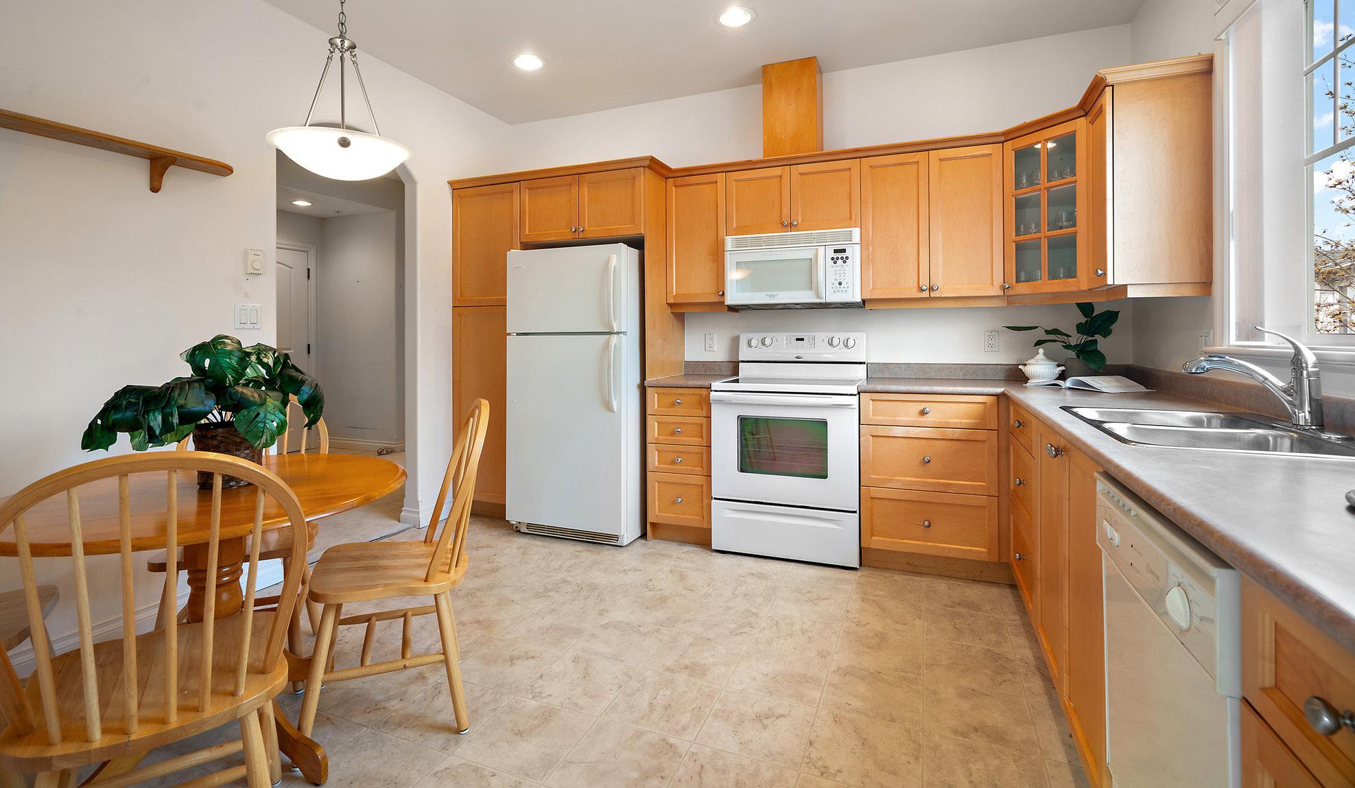 Prepare gourmet meals in the eat-in kitchen, featuring generous counter space & abundant cupboard storage.