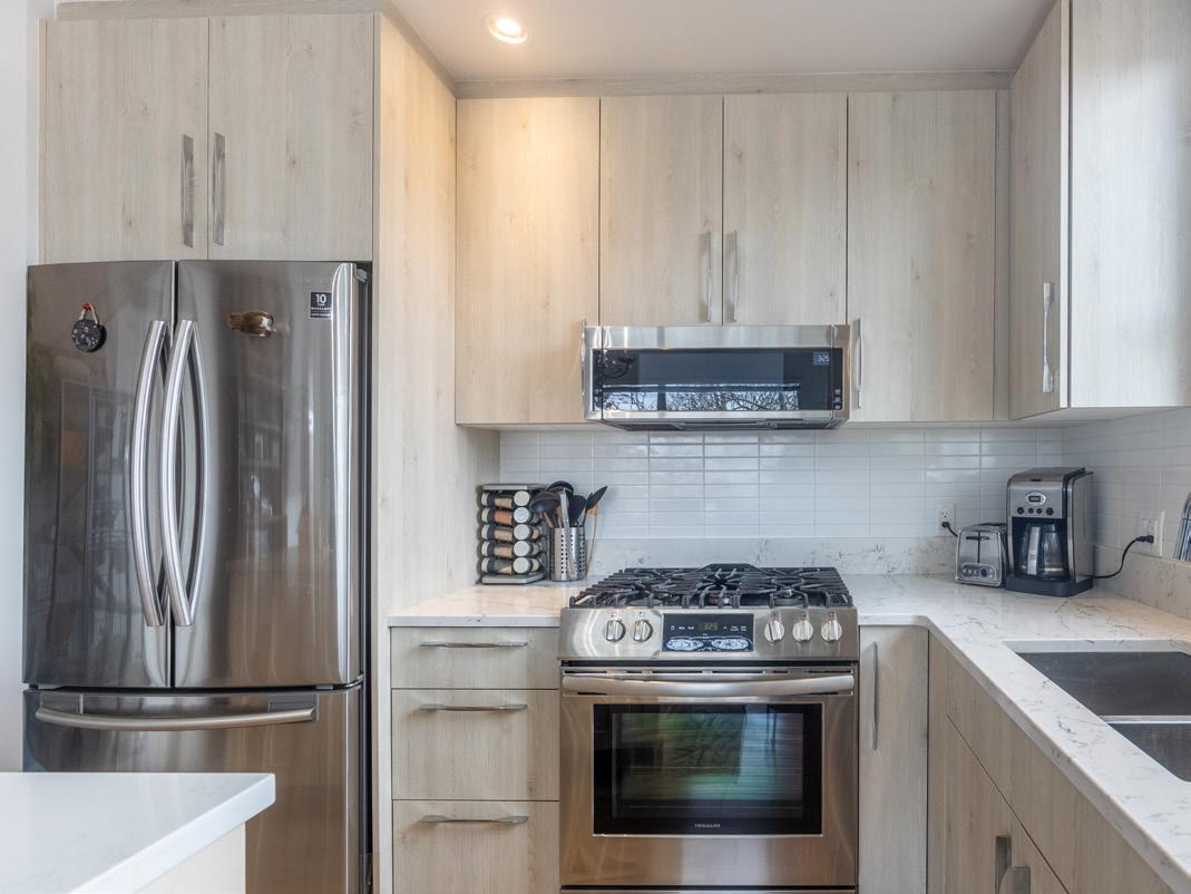 and an incredible view of the sunsets, enhancing the overall charm. The kitchen, a focal point for culinary enthusiasts, boasts quartz countertops, modern stainless steel appliances, and under-cabinet lighting. Step into the living room adorned with exquisite laminate flooring, adding to its aesthetic appeal. The balcony beckons, offering privacy and ocean views. Included is a secured, covered parking