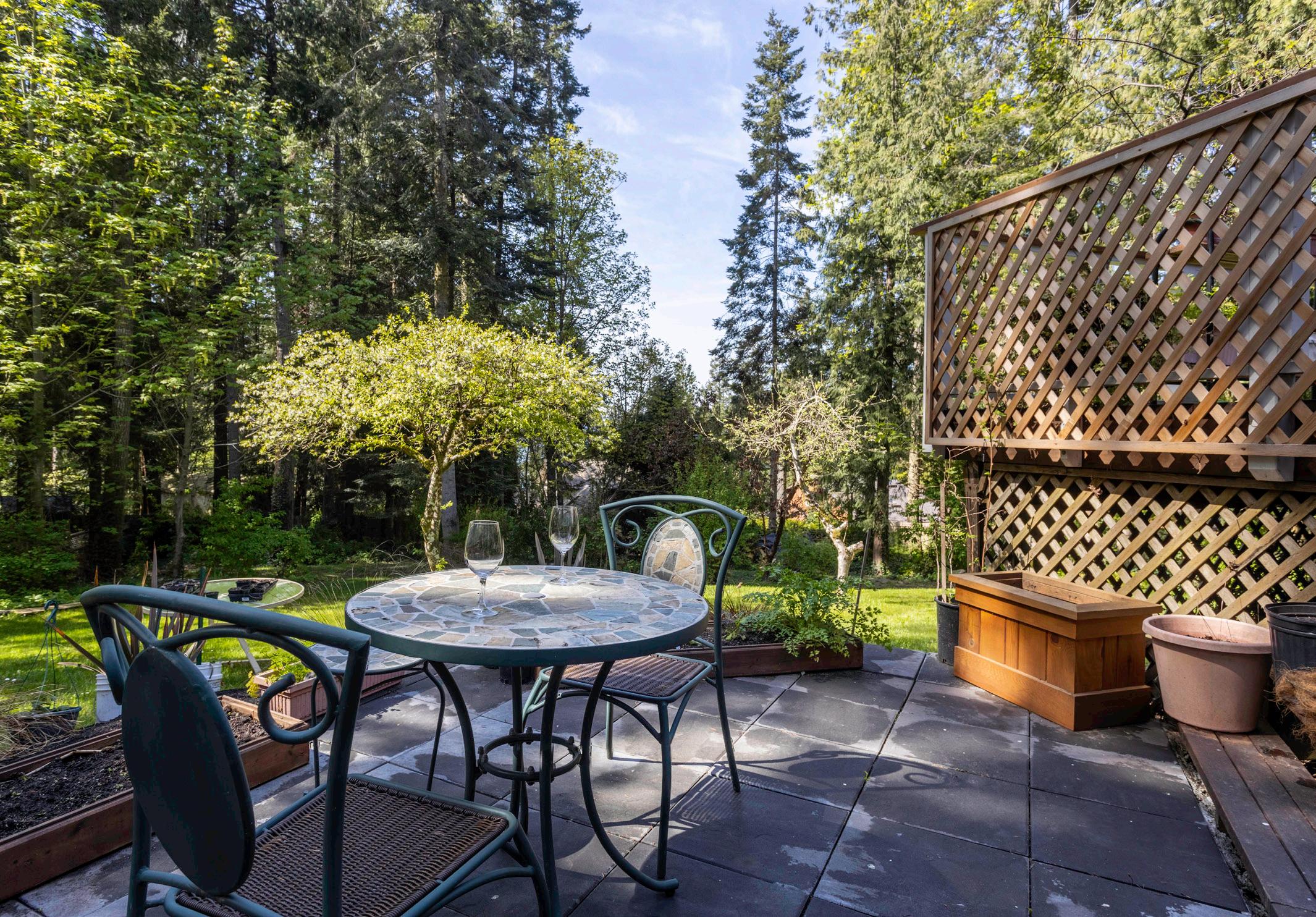 The spacious primary bedroom has its own deck and a spa-like ensuite with two pedestal sinks and a gorgeous soaker tub that looks out over the beautifully landscaped backyard. Spacious media room with a cozy wood stove leads to a private entertainment sized deck with ocean glimpses. hard wood floor throughout most of the main