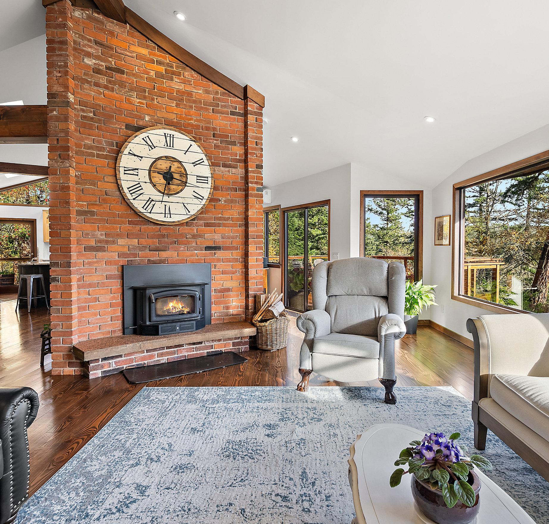 cabinetry—ideal for both entertaining & everyday living. Vaulted ceilings and skylights flood the main level with natural light, while the striking brick fireplace creates a cozy focal point for family gatherings. The deluxe primary suite is a true retreat which includes a spa-inspired ensuite with a soaker tub & walk-in shower. Two additional bedrooms, a full bath and a half bath complete the main level.