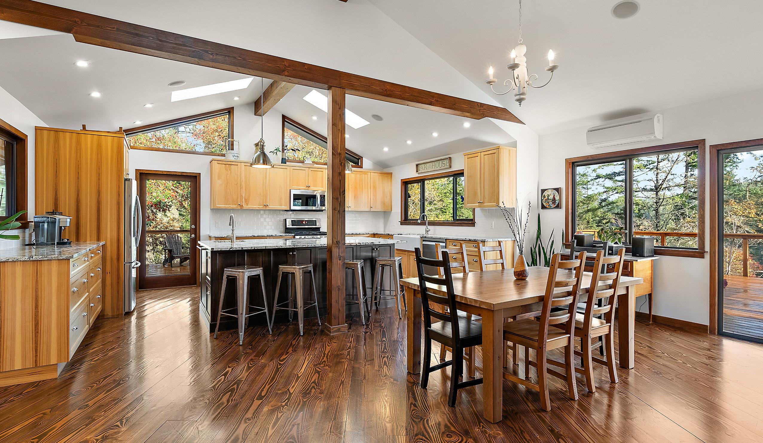 A beautifully renovated residence is perched at the heart of the acreage, showcasing an open-concept design that blends modern comfort with timeless West Coast style. The gourmet chef’s kitchen features gleaming granite countertops, premium stainless-steel appliances, a large island & custom