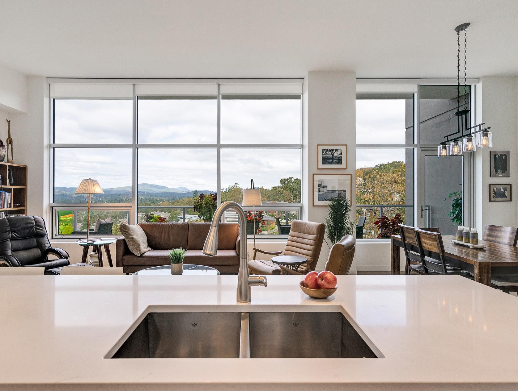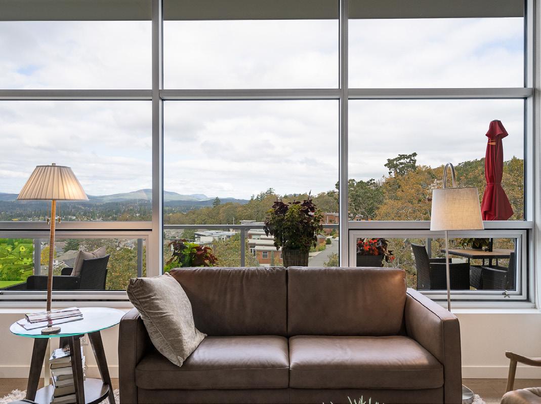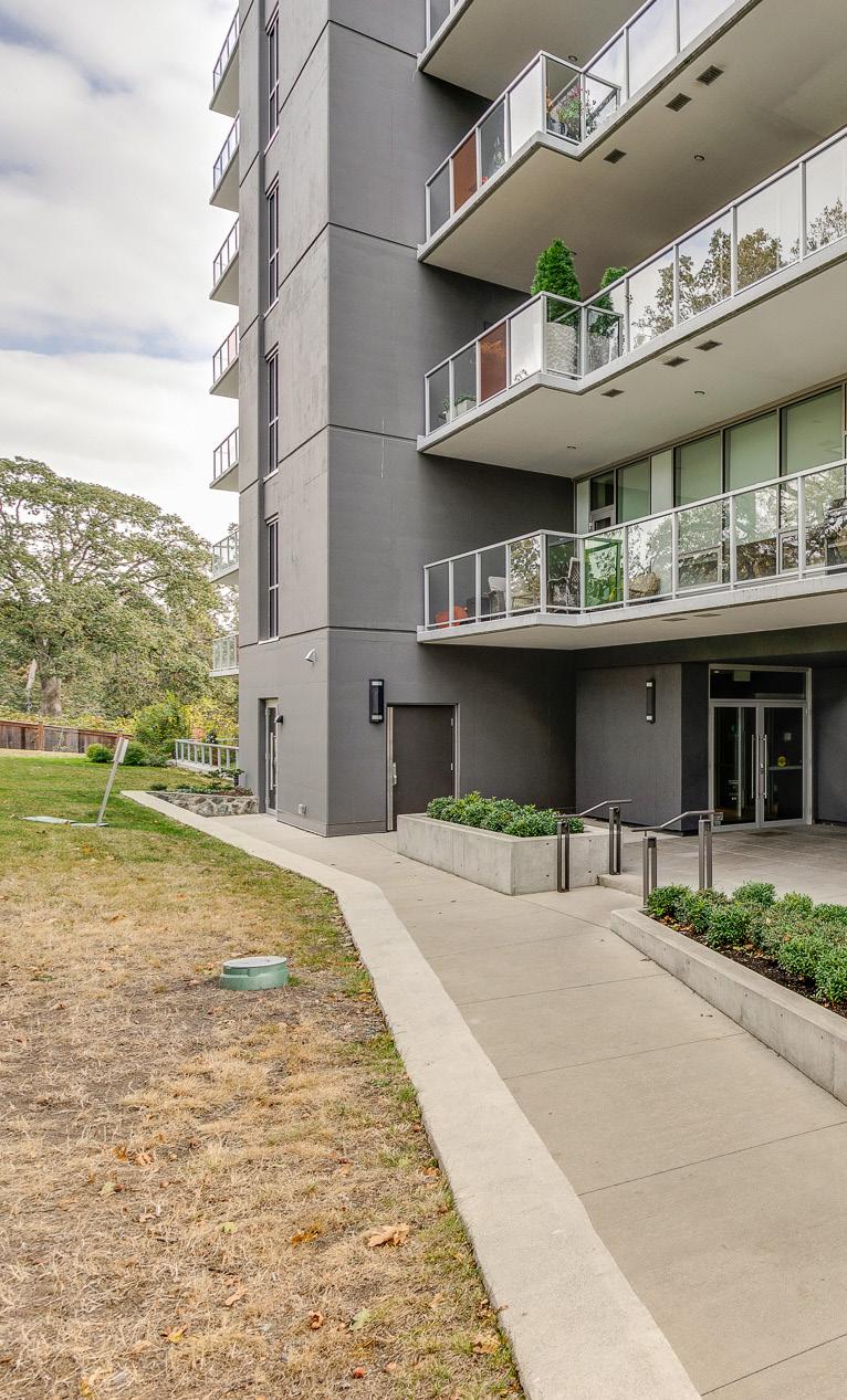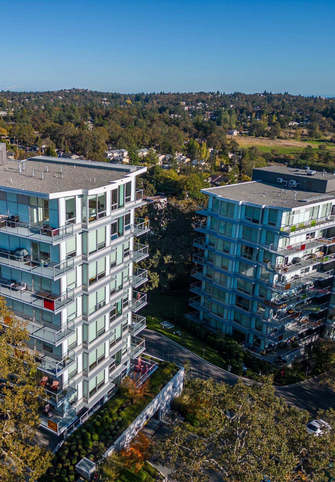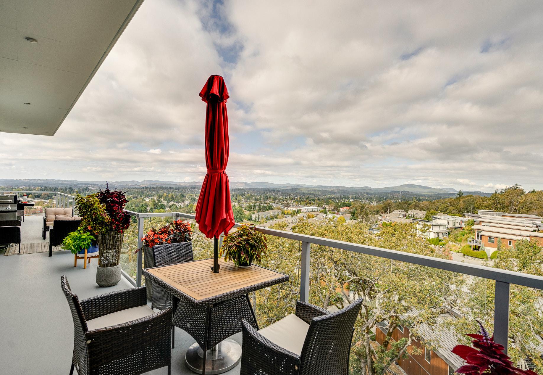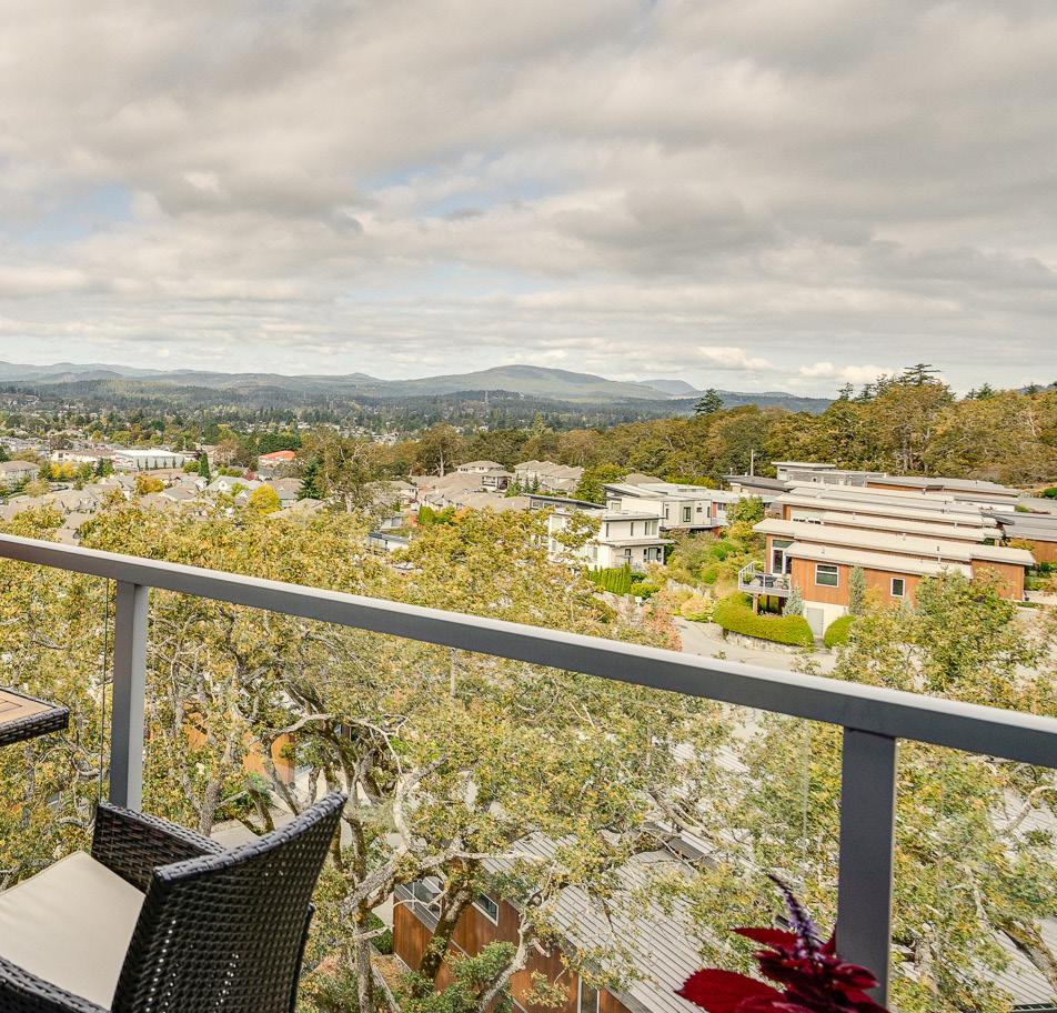 Perched on Christmas Hill, this opulent penthouse is surrounded by breathtaking natural beauty. Its impeccable concrete and steel construction (2020) offers panoramic views of the Olympic Mountains, Sooke Hills, downtown Victoria and Mount Newton. The spacious interior is unsurpassed, and a 362 sq-ft wrap-around balcony invites you to your own private outdoor eyrie, carpeted below with Garry Oaks. With 11’ vaulted ceilings flooded with natural light from floor-to-ceiling windows, this penthouse seamlessly combines