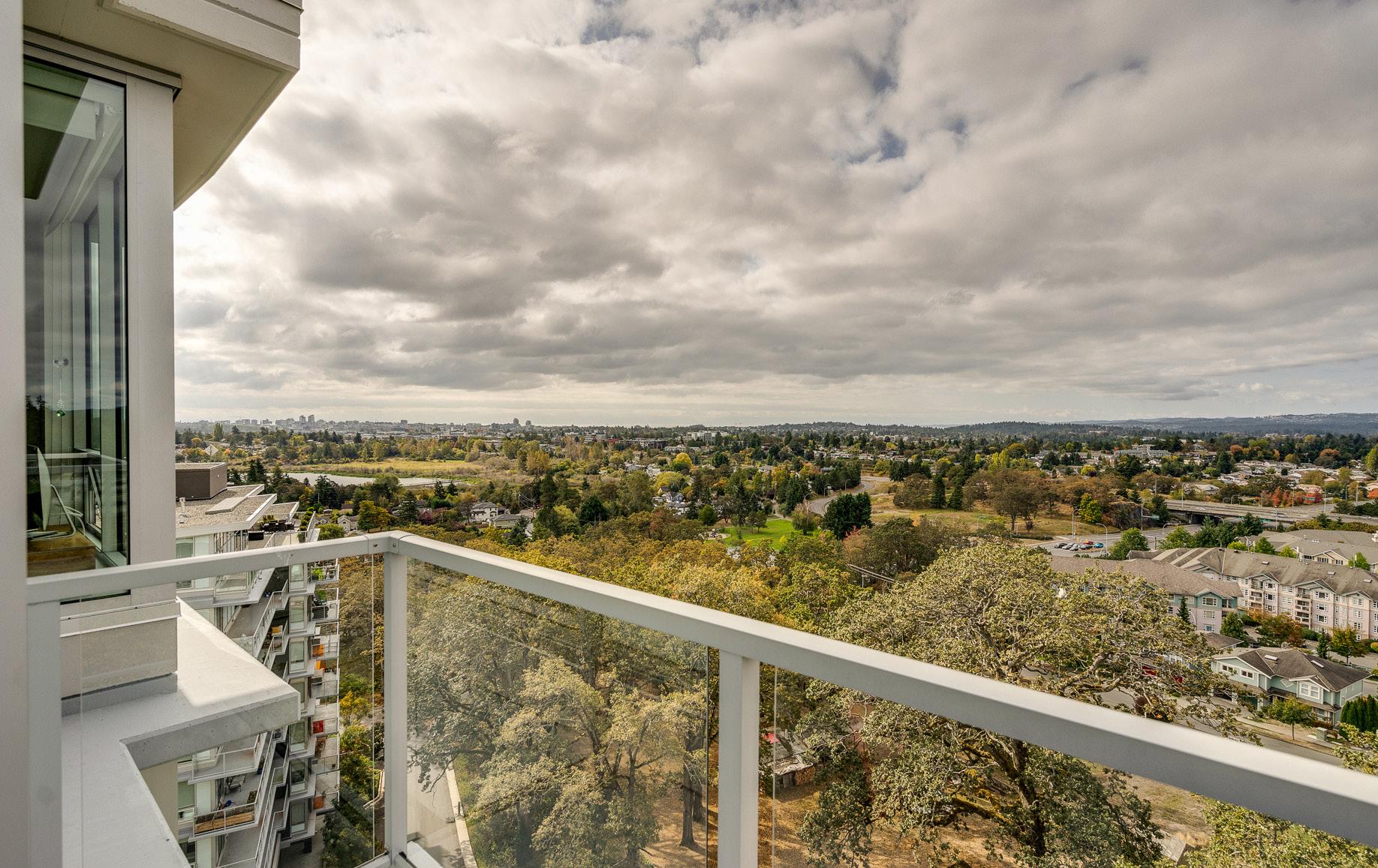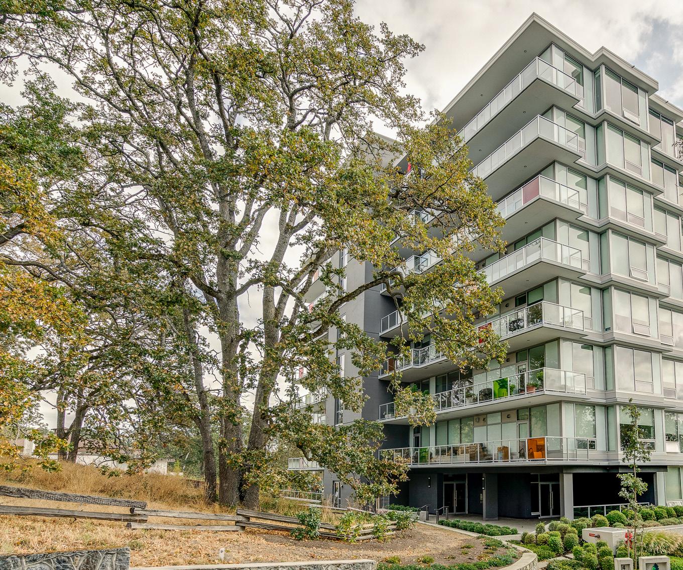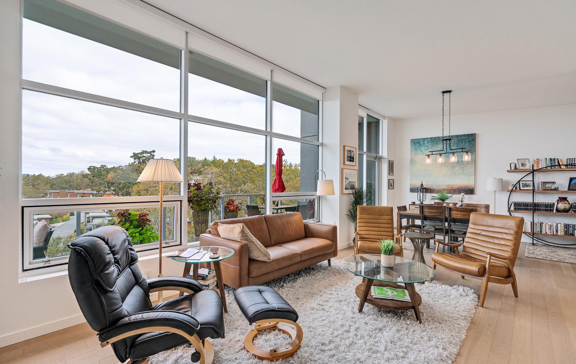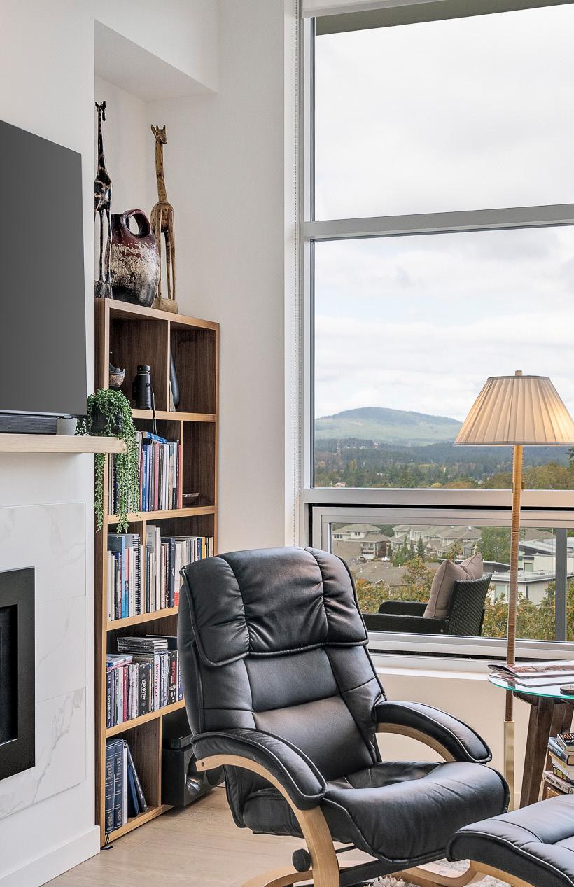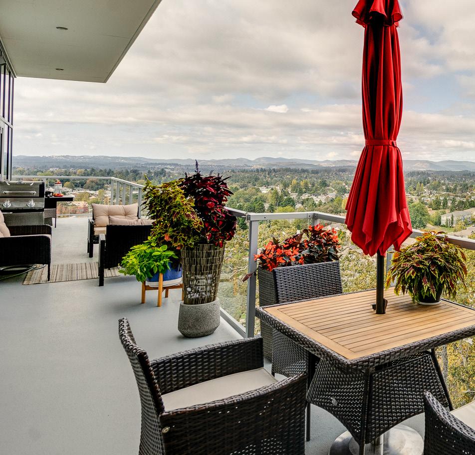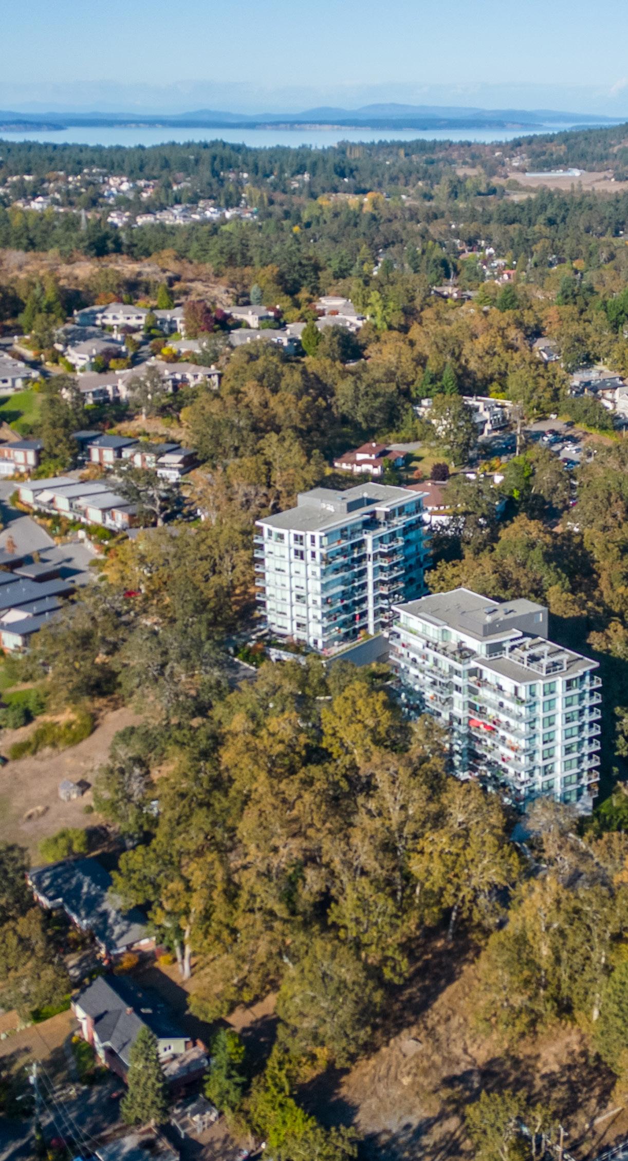 Perched on Christmas Hill, this opulent penthouse is surrounded by breathtaking natural beauty. Its impeccable concrete and steel construction (2020) offers panoramic views of the Olympic Mountains, Sooke Hills, downtown Victoria and Mount Newton. The spacious interior is unsurpassed, and a 362 sq-ft wrap-around balcony invites you to your own private outdoor eyrie, carpeted below with Garry Oaks. With 11’ vaulted ceilings flooded with natural light from floor-to-ceiling windows, this penthouse seamlessly combines
