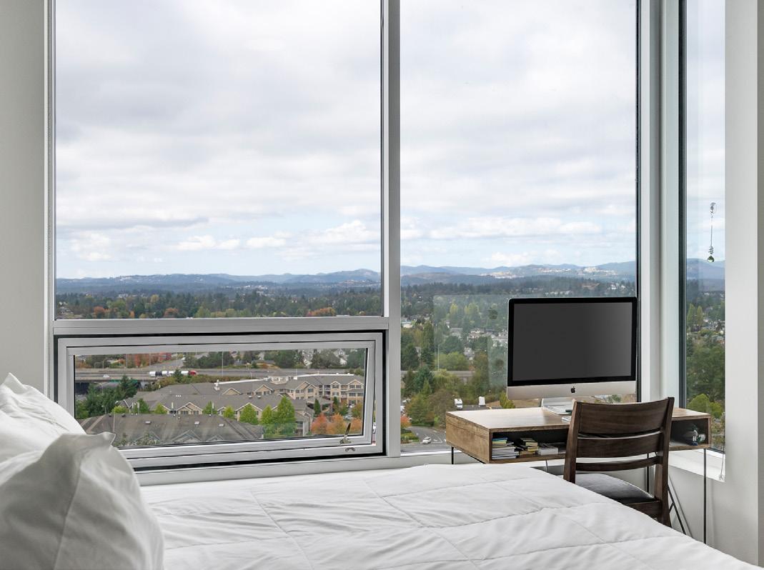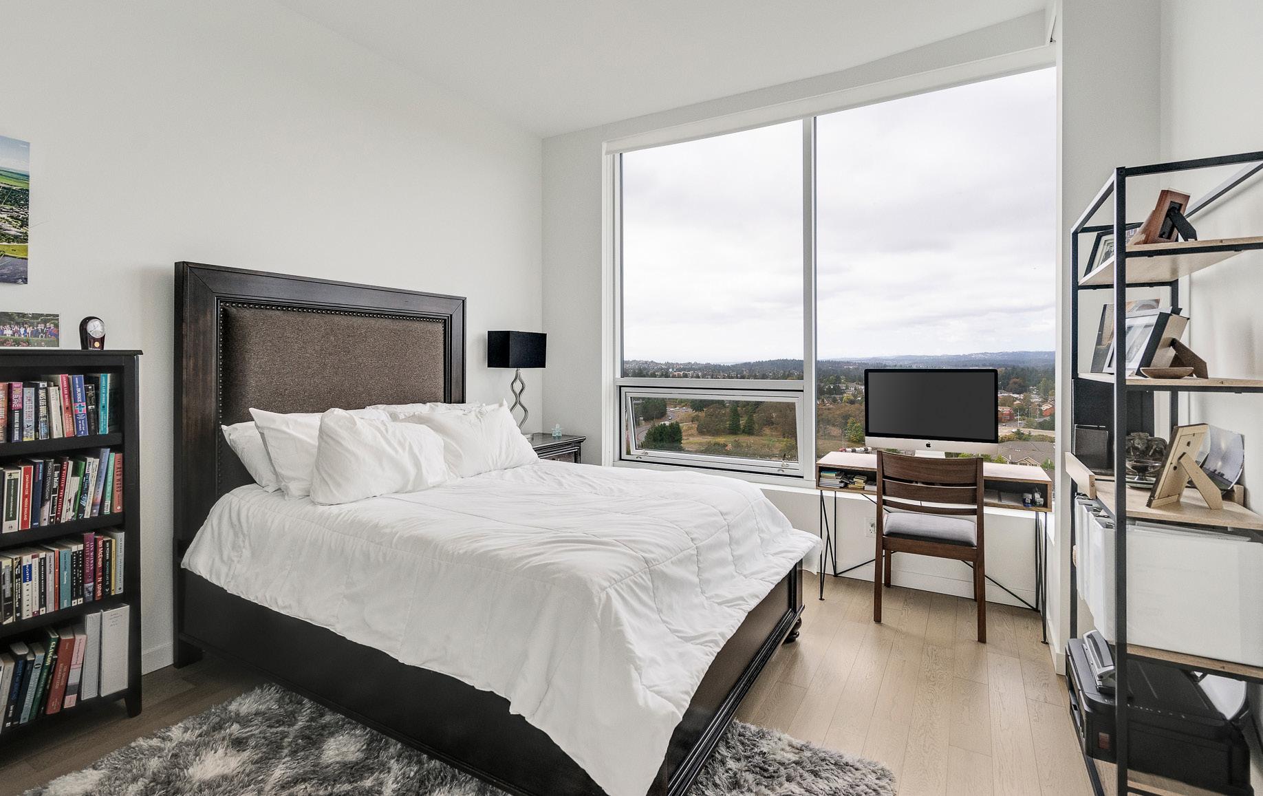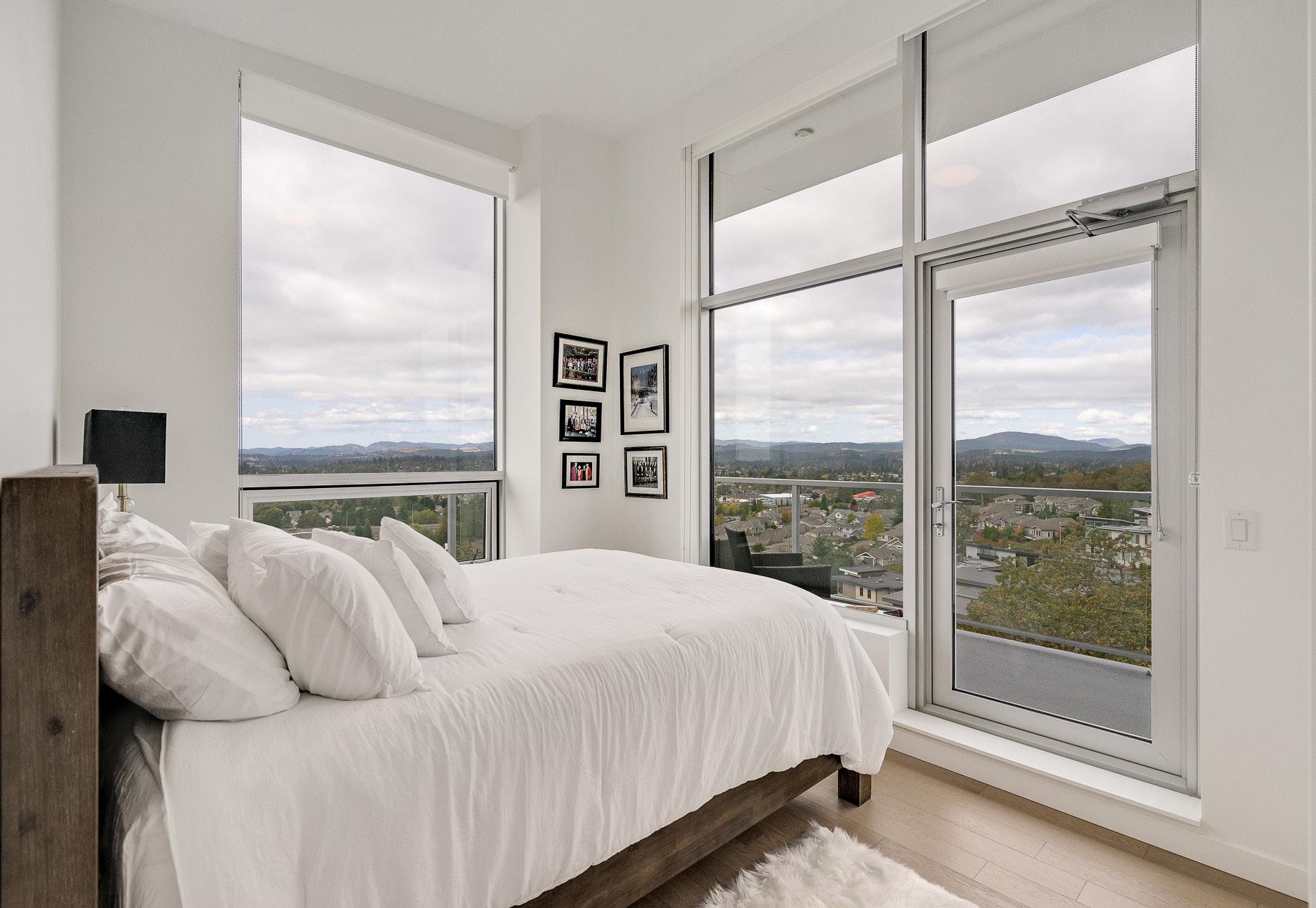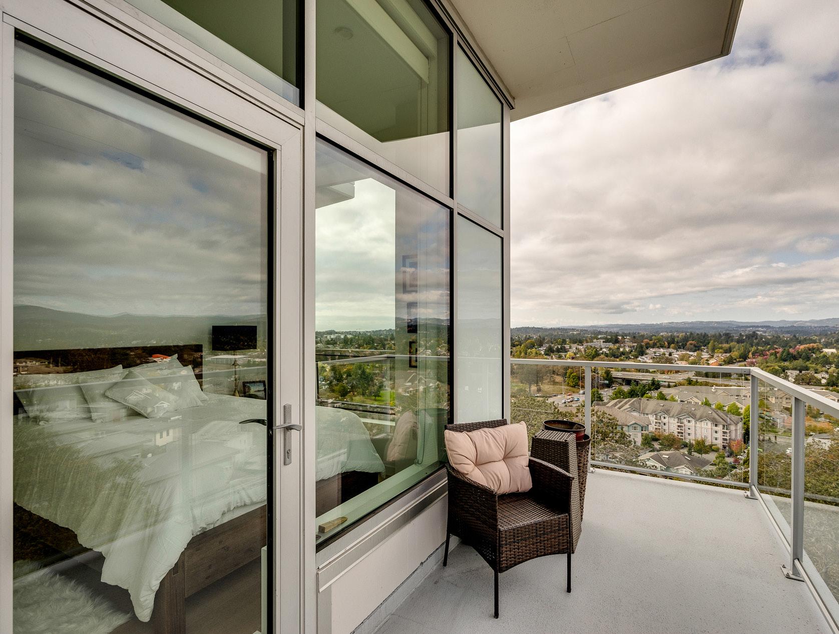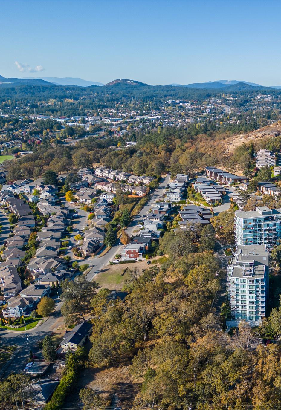 Perched on Christmas Hill, this opulent penthouse is surrounded by breathtaking natural beauty. Its impeccable concrete and steel construction (2020) offers panoramic views of the Olympic Mountains, Sooke Hills, downtown Victoria and Mount Newton. The spacious interior is unsurpassed, and a 362 sq-ft wrap-around balcony invites you to your own private outdoor eyrie, carpeted below with Garry Oaks. With 11’ vaulted ceilings flooded with natural light from floor-to-ceiling windows, this penthouse seamlessly combines