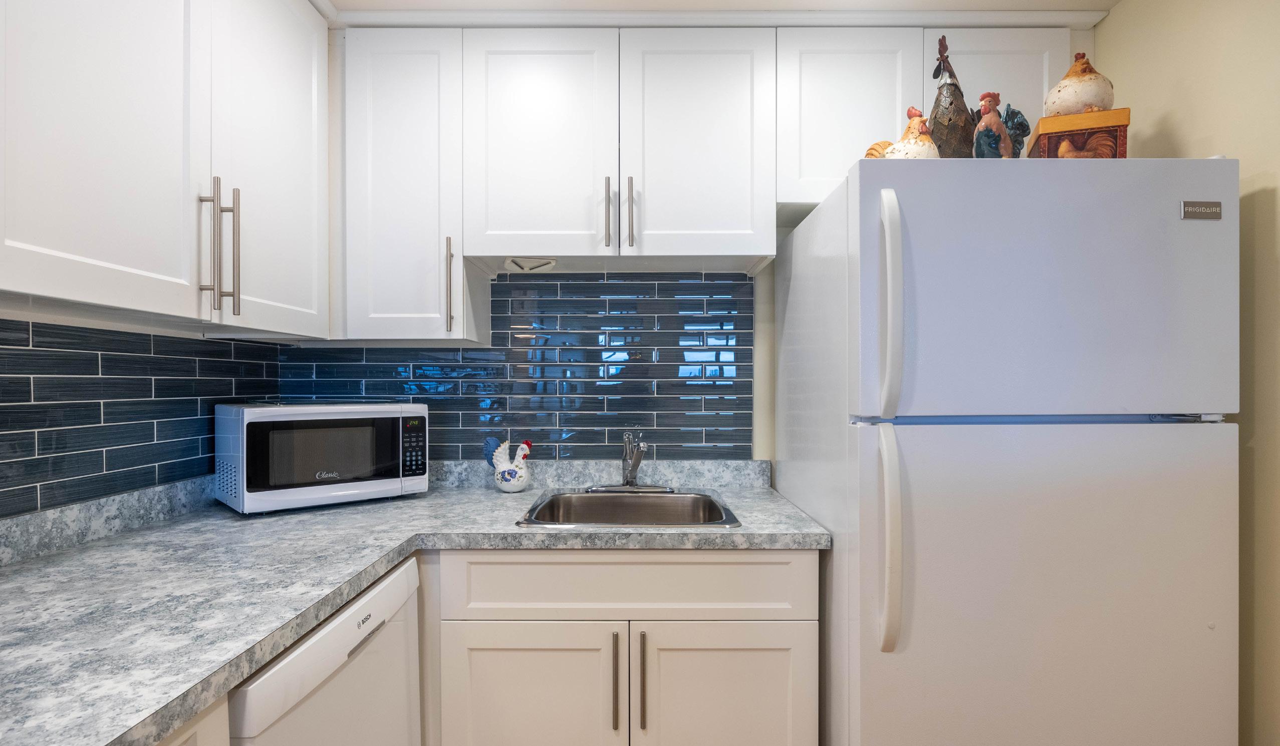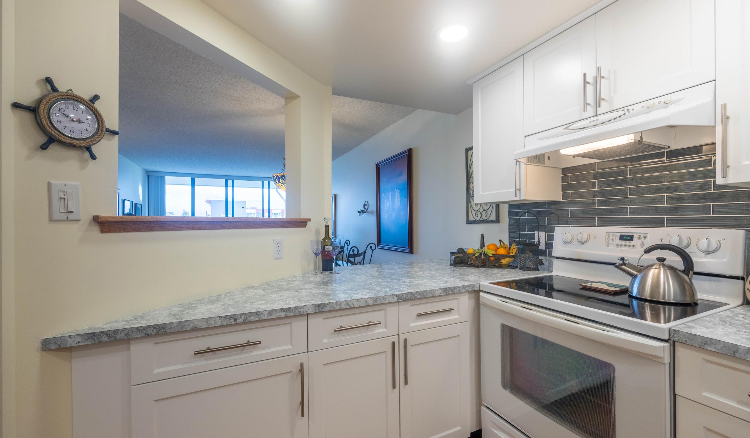 Discover a bright and updated kitchen with glass tile backsplash. the seamlessly