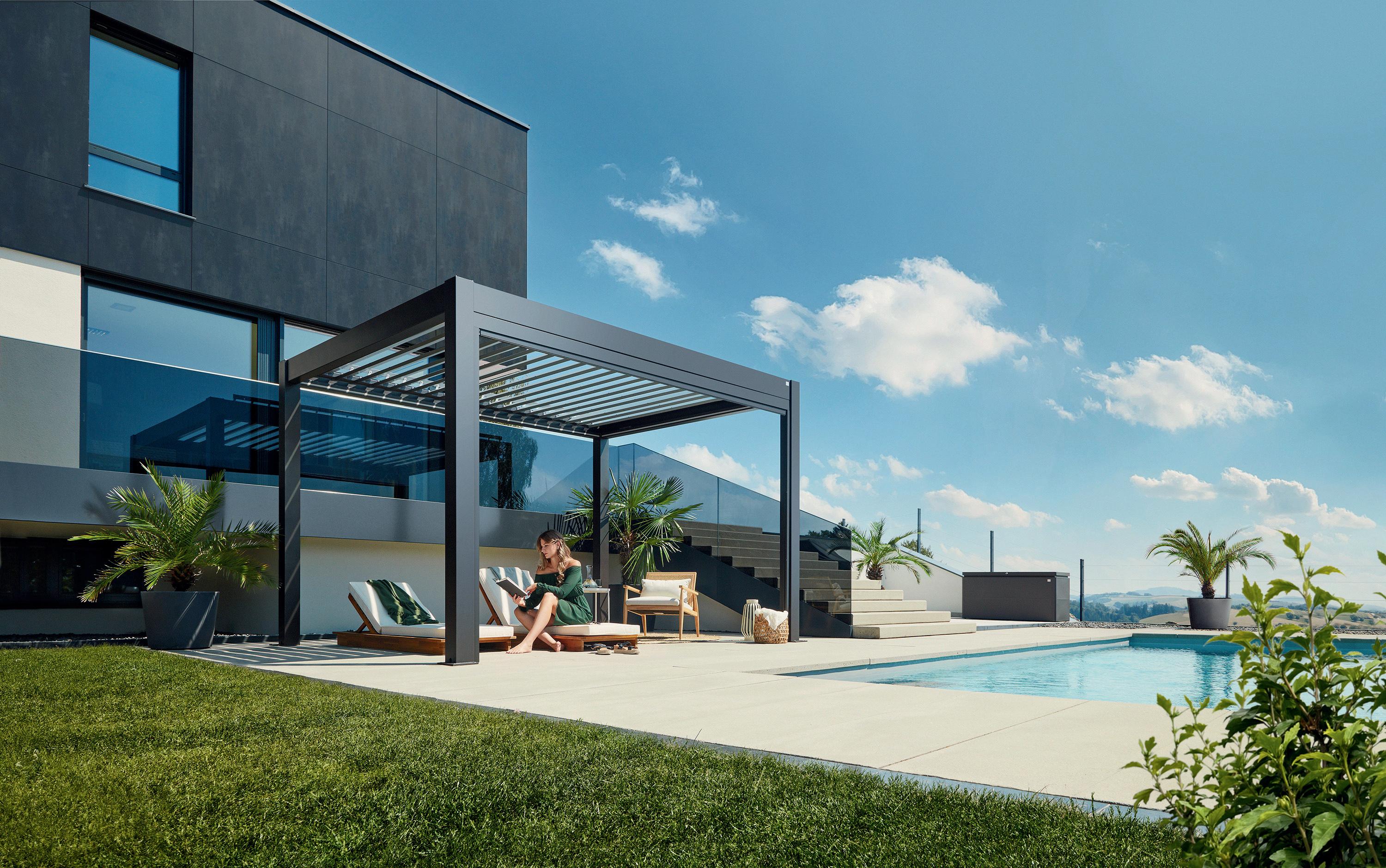 VORZÜGE DER BIOKLIMATISCHEN PERGOLA MIT LAMELLENDACH geringere Wärmeabstrahlung dank durchdachter Konstruktion und Sandwichbauweise der Lamellen deutlich verminderte Geräuschentwicklung robustes Design in Biohort Qualität, Edle Optik und beste Materialien 20 Jahre Garantie 130° verstellbare Lamellen für Komfort bei jedem Wetter und Steuerung des Schattenwurfes Regenwasserabfluss integriert in den Stehern Zubehör unkompliziert nachrüstbar