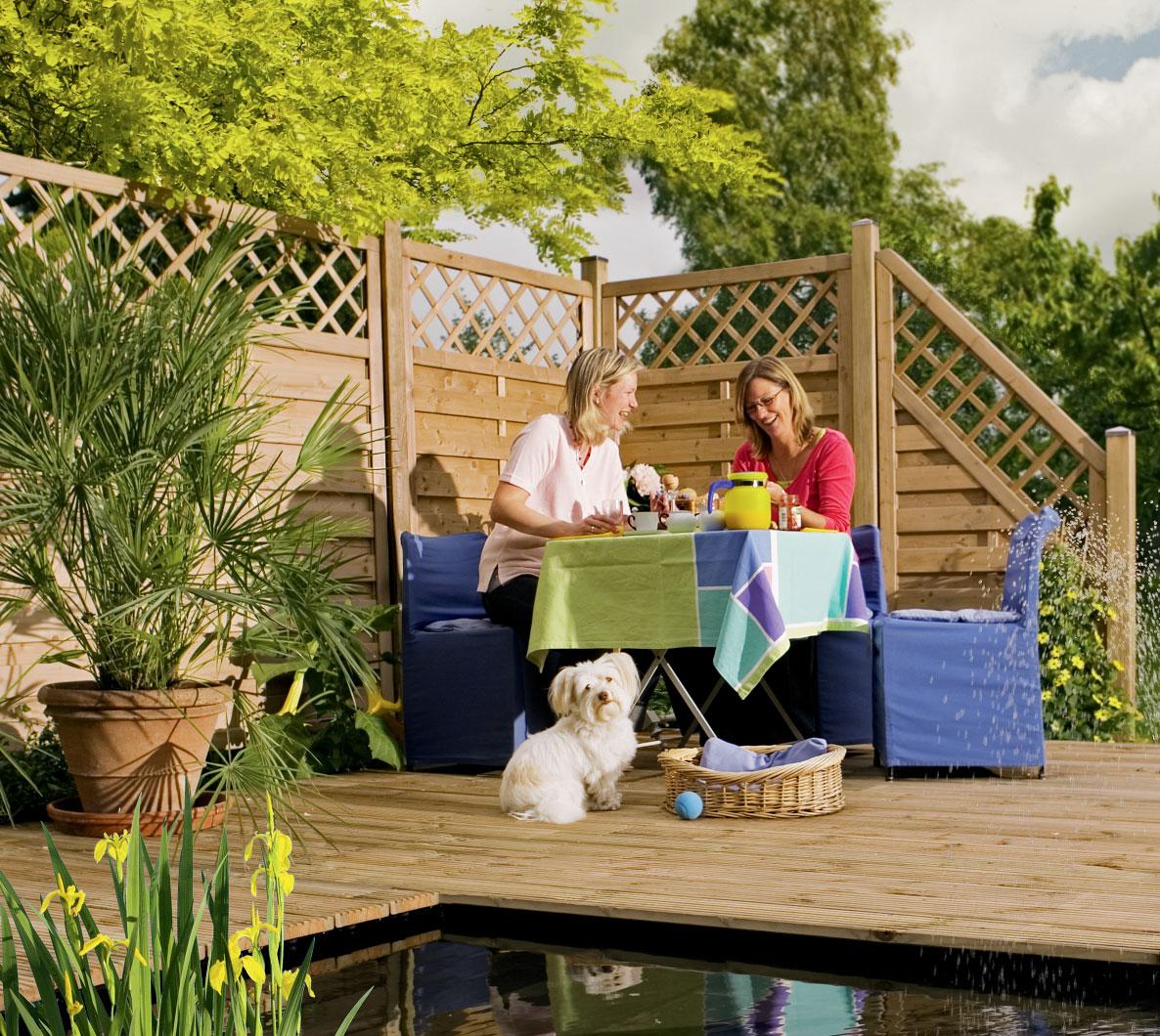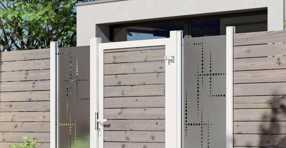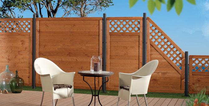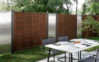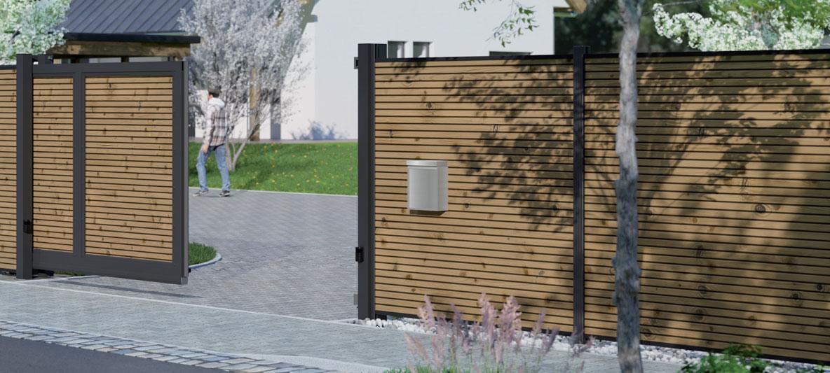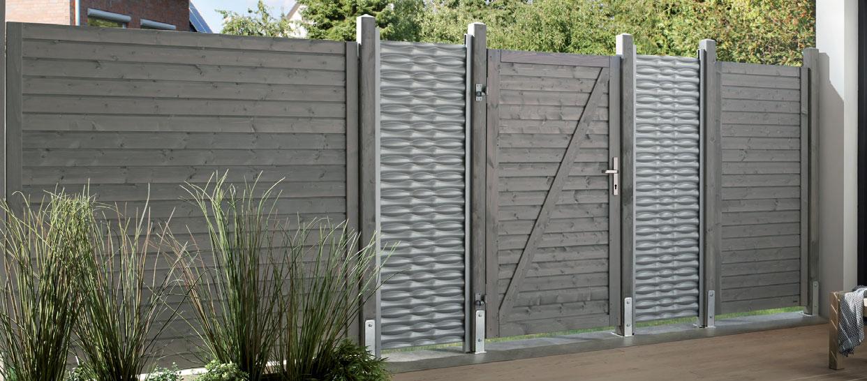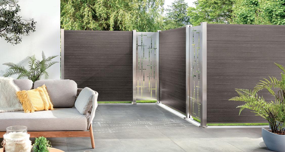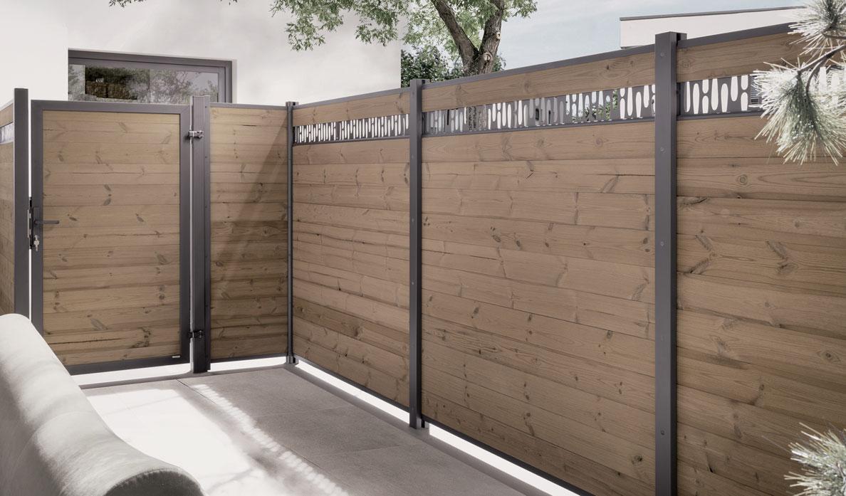 Kombinieren Sie Holzzaun-Elemente mit attraktiven, pflegeleichten Design-Elementen aus Aluminium, Edelstahl, beschichtetem Metall oder Sicherheitsglas.