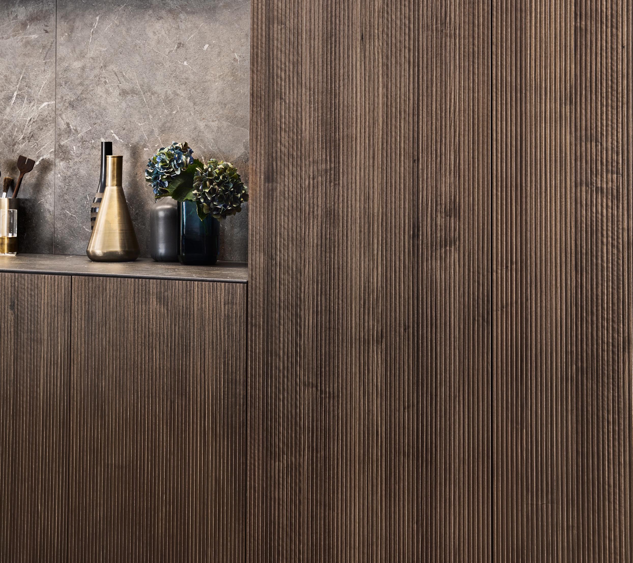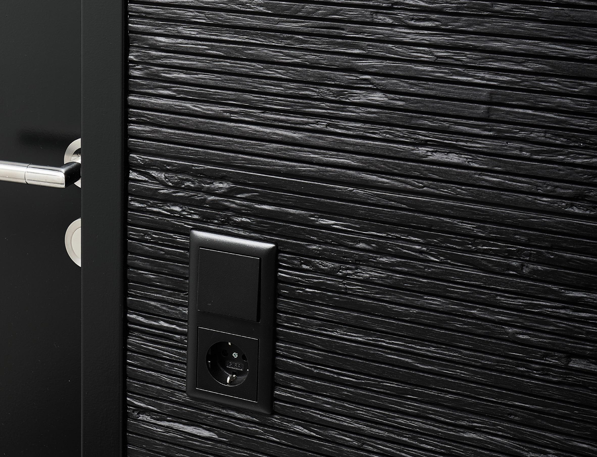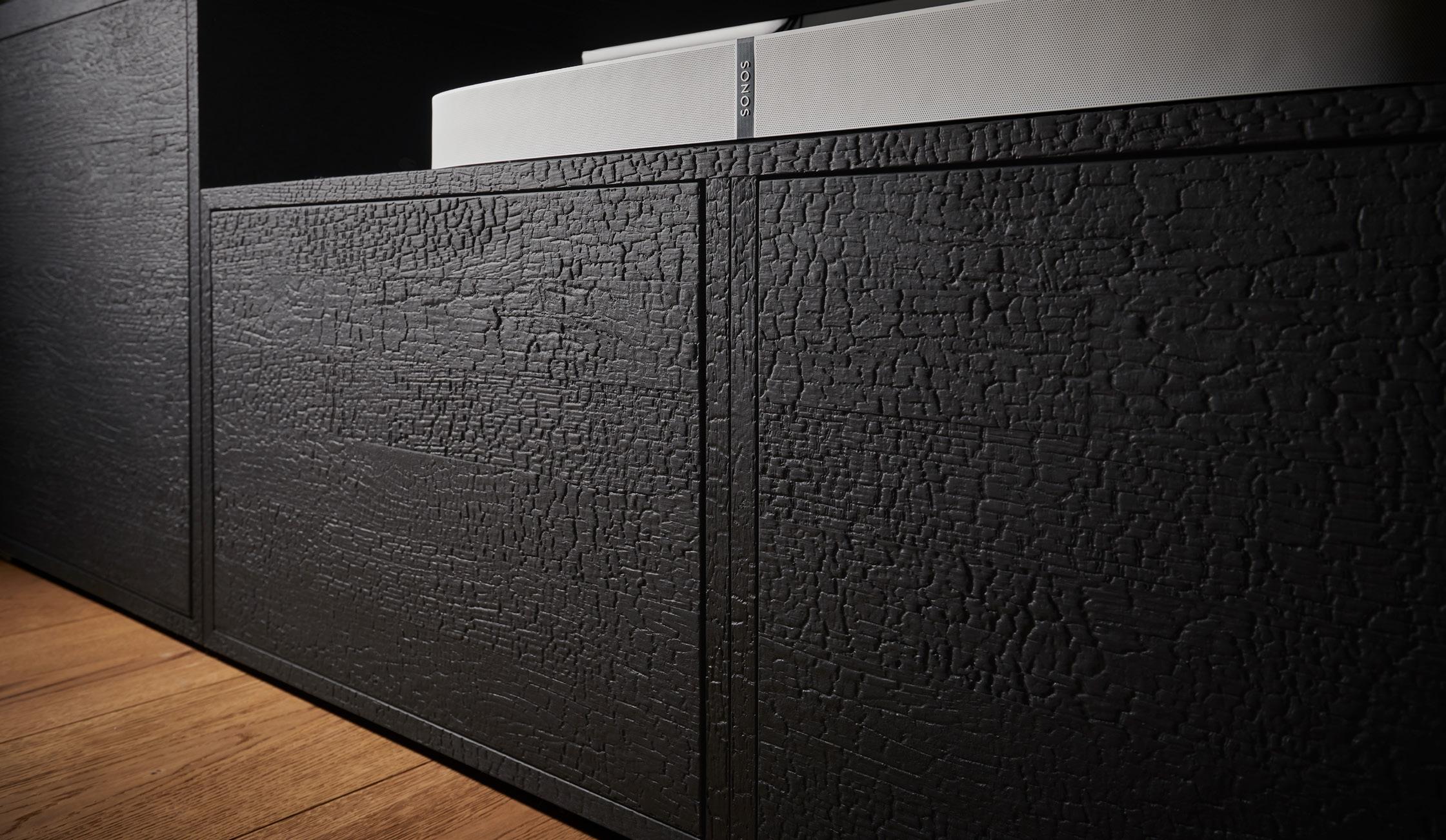 Flamed Wood verkörpert verkohltes Holz detailgetreu, ohne tatsächlich verbrannt zu sein.