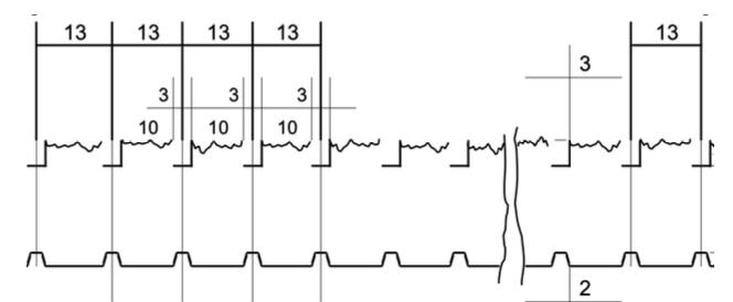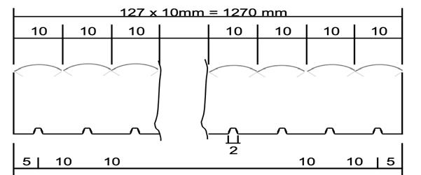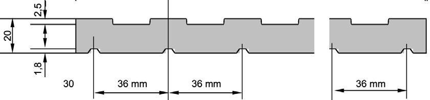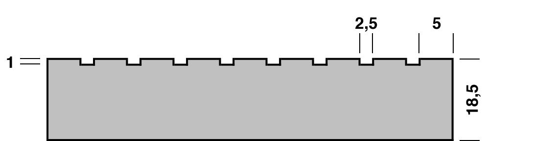 Match ist eine geradlinig verlaufende Struktur in Form eines Stabprofils, mit Verprägungen in einem Abstand von 2,5 mm und einer Breite von 5,0 mm. Die Tiefe der Verprägung beträgt 1,5 mm.