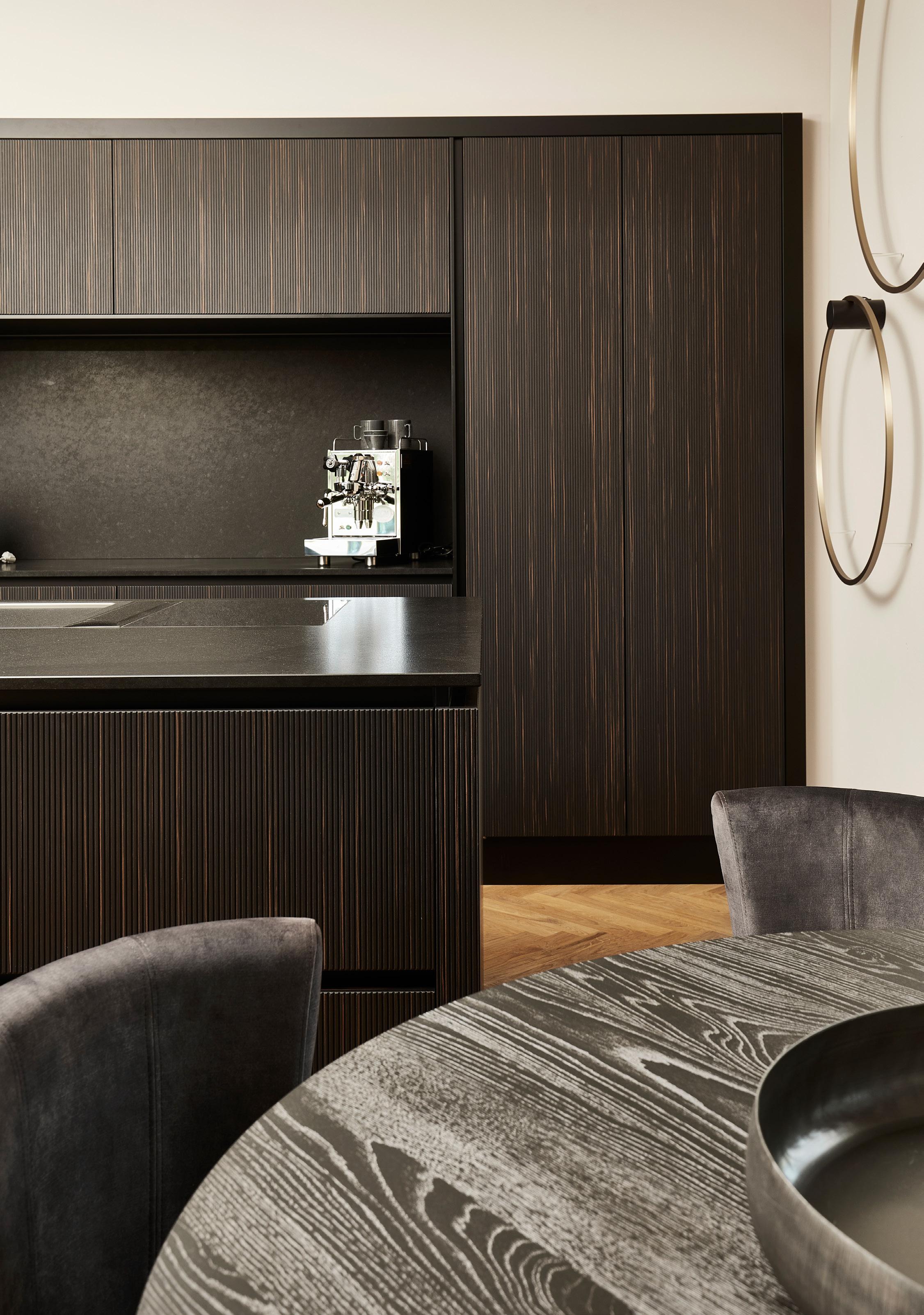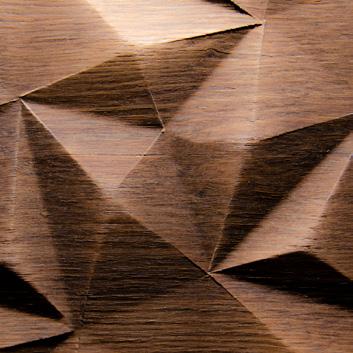 Burned Wood verkörpert verkohltes Holz detailgetreu, ohne tatsächlich verbrannt zu sein. Durch Verprägen der Furnierschichten entsteht eine resistente Oberfläche, ohne verbrannten Geruch.