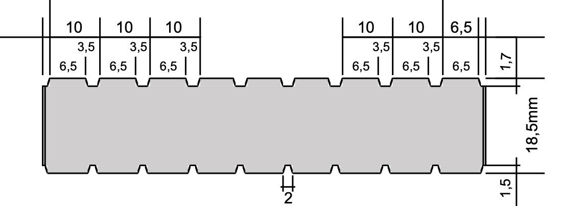 Stripes ist eine geradlinig verlaufende Struktur in Form eines Stabprofils, mit Verprägungen in einem Abstand von 3,5 mm und einer Breite von 6,5 mm. Die Tiefe der Verprägung beträgt 1,7 mm.