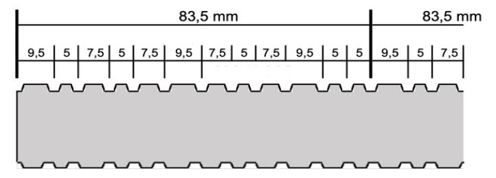 Ribbed ist eine geradlinig verlaufende Struktur in Form eines Rundstabprofils, mit Verprägungen mit einer Breite von 7,5 mm. Die Tiefe der Verprägung beträgt 1,2 mm.