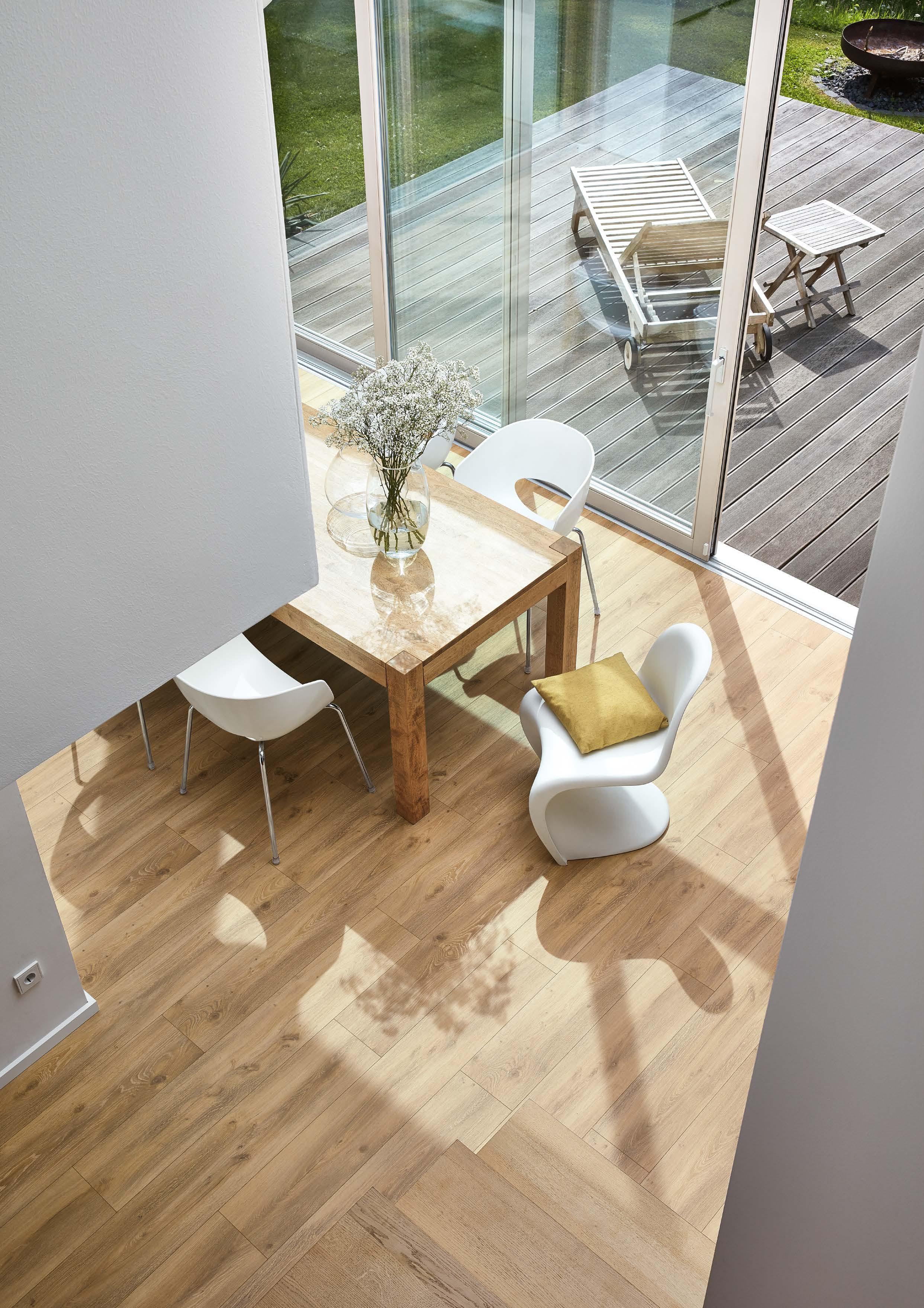 Bei leichten Verschmutzungen genügt einfaches Staubsaugen. Die Oberfläche muss nicht aufwändig geölt oder versiegelt werden, sondern bleibt fast von allein über viele Jahre schön. Auch bei stärkeren Verschmutzungen funktioniert die Reinigung problemlos, denn MEISTER-Laminat ist wischwasserfest – kein Aufquellen, keine Kantenbeschädigung. Die homogene Oberfläche lässt keine Feuchtigkeit durch, die speziell entwickelte und patentierte Geometrie des Klickprofils sorgt für dichte Fugen und die Trägerplatte schützt vor Aufquellen bei Wassereinwirkung.