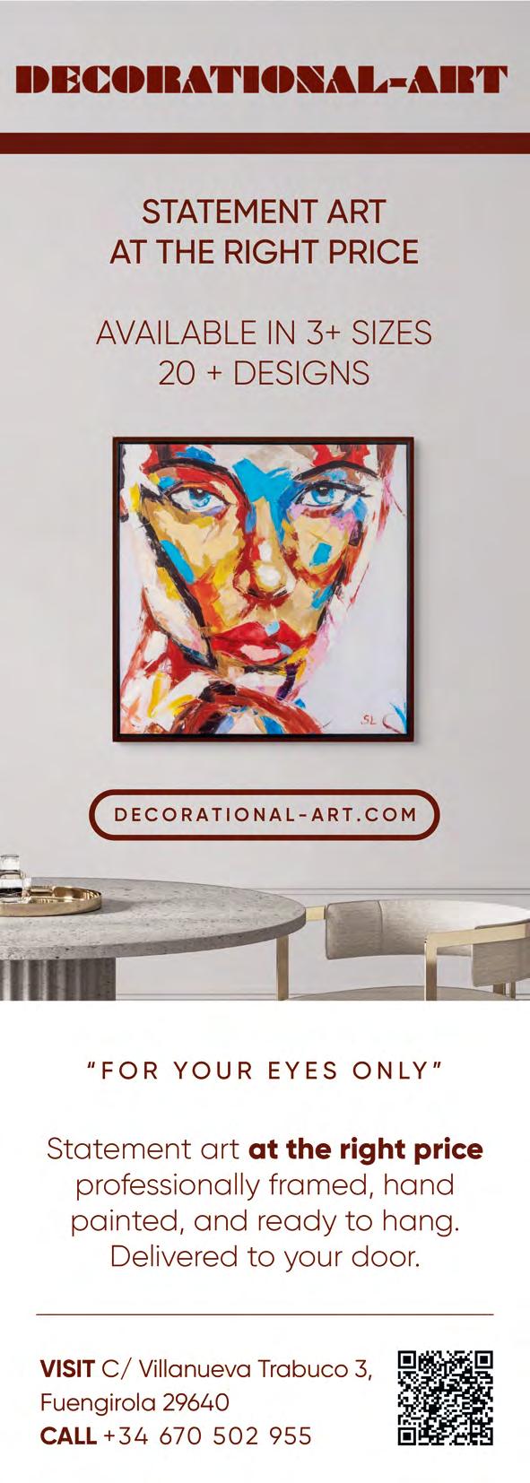 Every piece is hand-finished with acrylic paint, creating a subtle threedimensional, oil-painting effect that ensures no two artworks are exactly alike. It’s an ideal way to add depth and interest to contemporary coastal interiors. Visit the gallery in Fuengirola or explore the full collection at: www.decorational-art.com, T. (+34) 670 50 29 55, Instagram: @decorational.art
