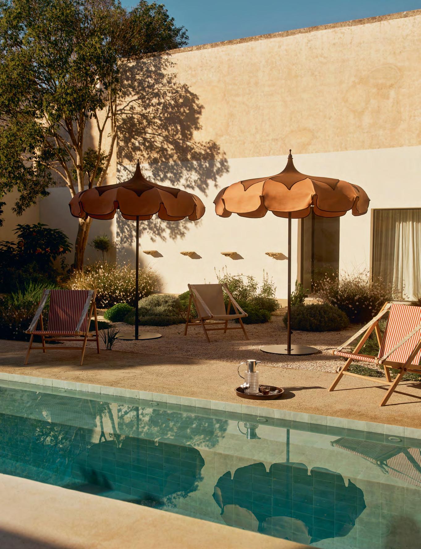 Right The Lotus Pagoda by Crema Outdoor is a refined outdoor parasol inspired by traditional pagoda forms, blending an elegant oriental silhouette with durable, Italian-made materials. Designed for beach, poolside, or hospitality settings, it pairs visual sophistication with reliable performance. Crema Outdoor is available from Alison Bethell Collins situated in San Pedro de Alcántara (www.alisonbethellcollins.com).