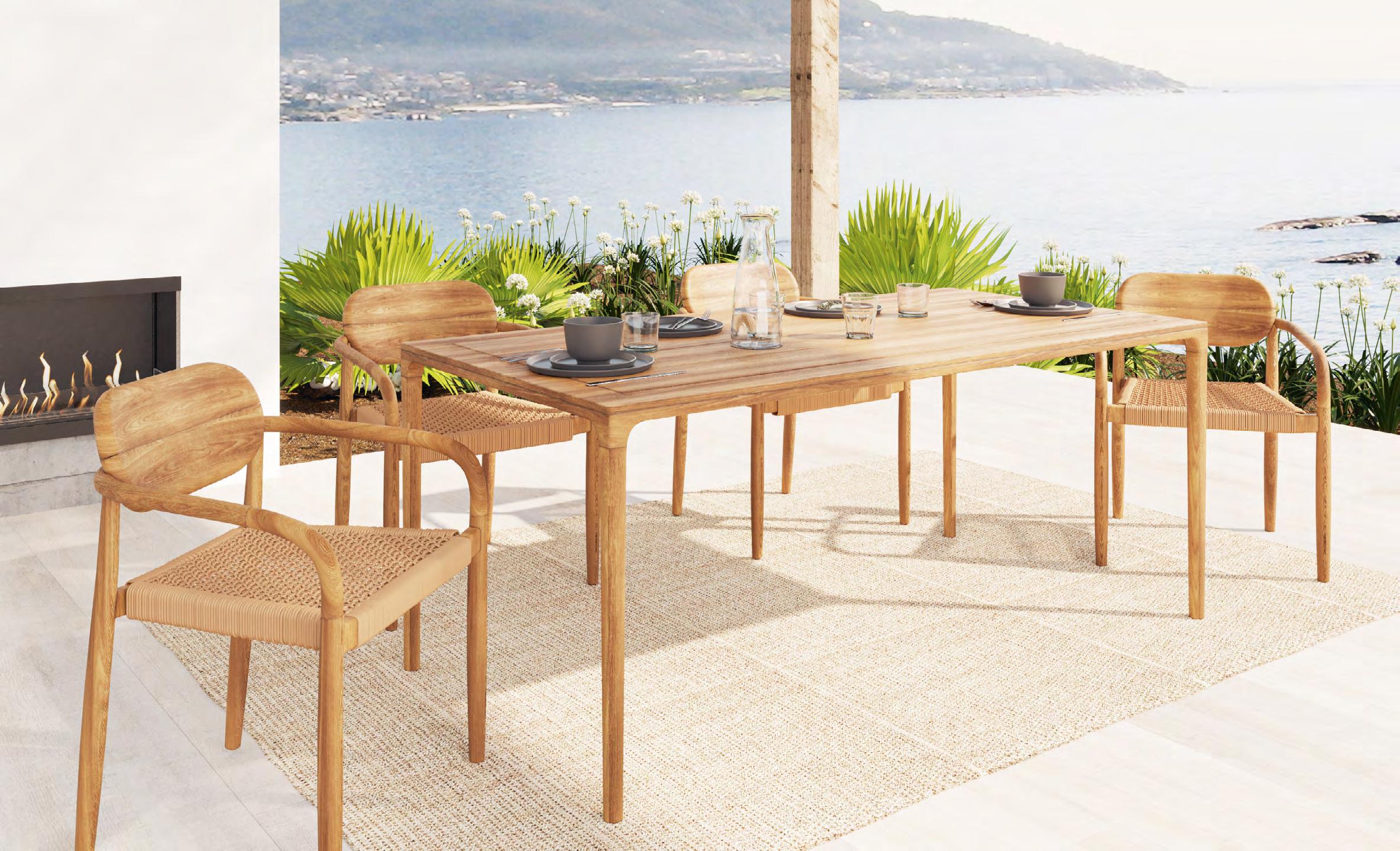 The Amalfi dining table by G&G Italia, crafted from premium teak, comfortably seats eight diners. It pairs seamlessly with the Tivoli dining chair, featuring a teak frame and an elegantly woven rope backrest for a refined yet inviting dining experience (www.gg-italia.net). Contact telephone number for enquiries: (+34) 678 805 870.