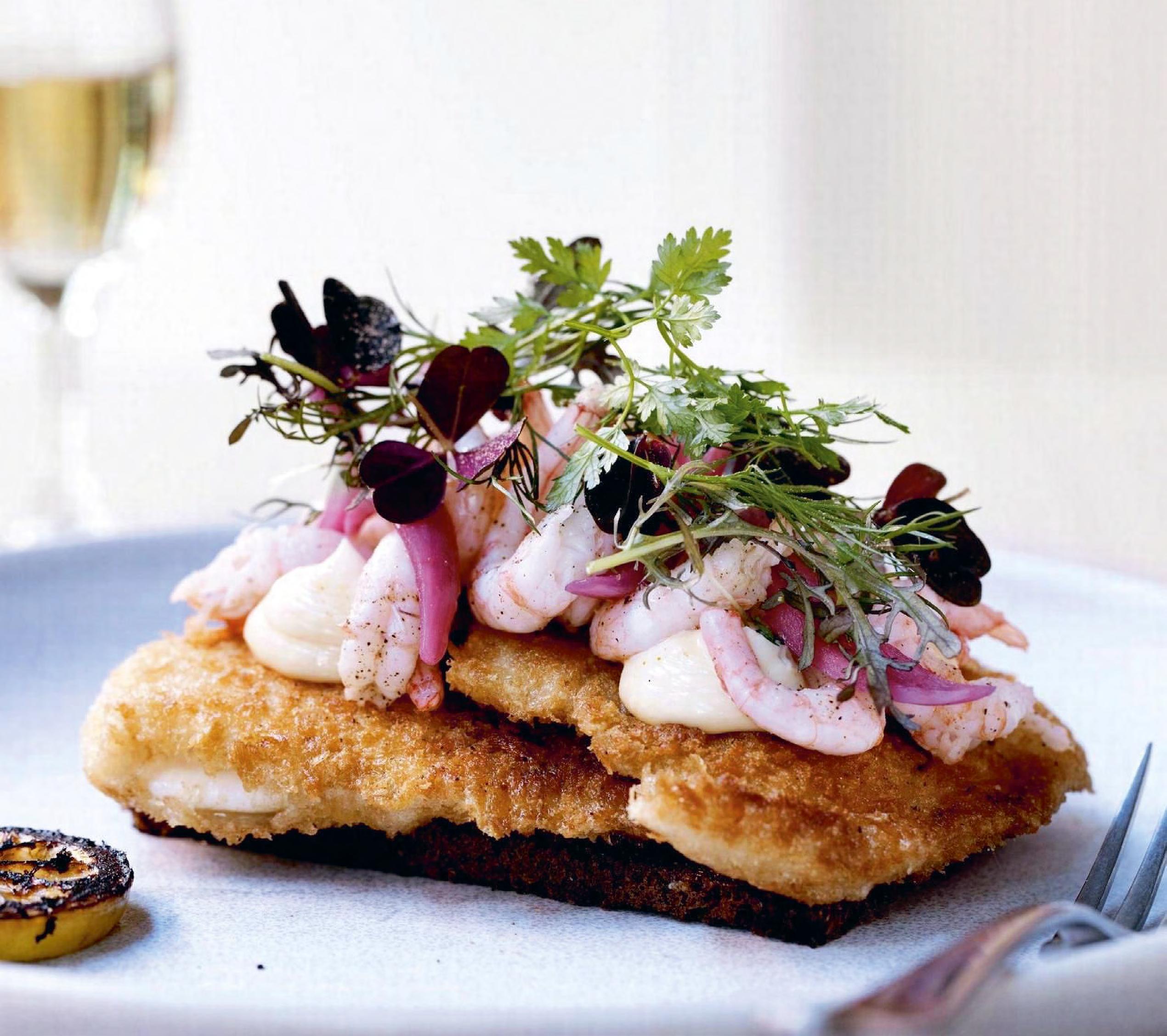 6 Butter the rye bread, put two pieces of fried plaice on each and finish with lemon mayonnaise, prawns, pickled onions, lemon slices, and herbs. Serve immediately.