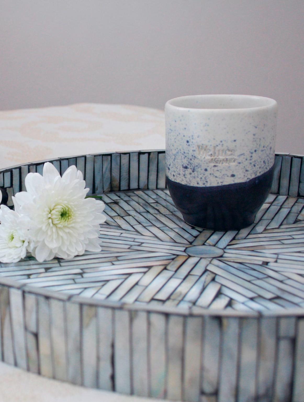 Below Right The refined elegance of We Luca’s round mother-ofpearl tray, featuring a unique design, enhances any space while serving as both a stylish décor piece and a functional accessory. Durable and high-quality, it’s perfect for elevating everyday meals and special occasions alike. Their small ceramic cups are a great way to serve sake, snacks, espresso, or condiments. The We Luca showroom is on Calle Bonanza 2 in El Rosario (www.weluca.com).