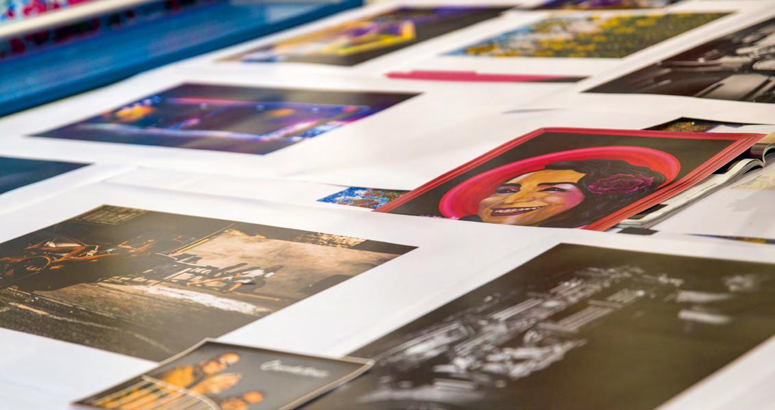 traditional curation. Photographic materials sprawl across his workbench, every inch of wall space is adorned with striking visuals, and dozens of large, expressive paintings command attention, each a testament to Julian’s diverse artistic journey.