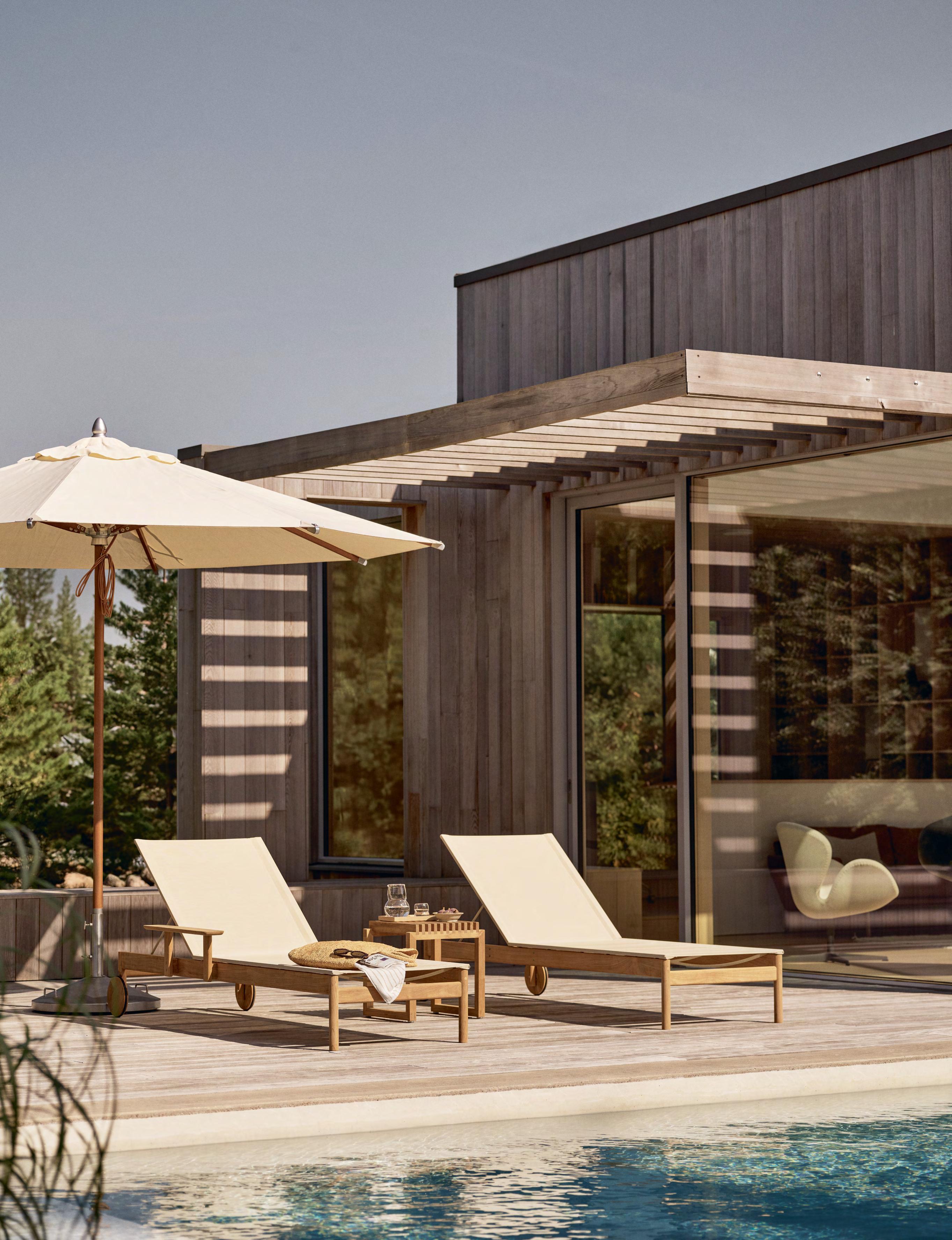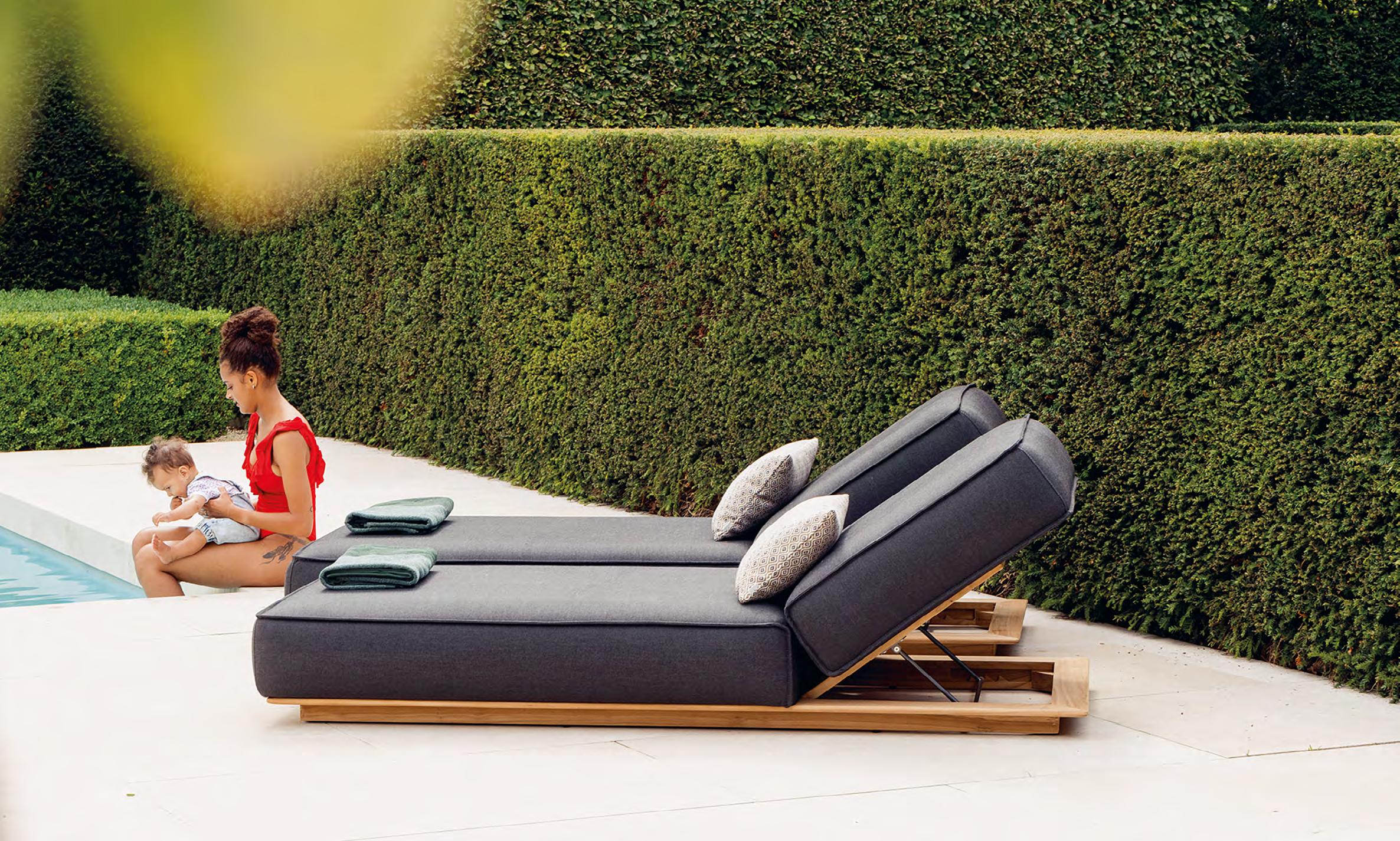 Right The Pelagus sunbed by Fritz Hansen adjusts to five positions for lounging, reclining, or sitting. Its 100 per cent FSC-certified teak frame has classic wooden wheels for easy portability. The weatherproof Sling textile seat adds a modern touch and for extra comfort, you can add up to two teak armrests. Fritz Hansen is available from BoConcept Plus Store on the Mijas Road and C. de Negocios Oasis in Marbella (www.plusstore.es), and through Gunni & Trentino in Marbella Club (www.gunnitrentino.es).