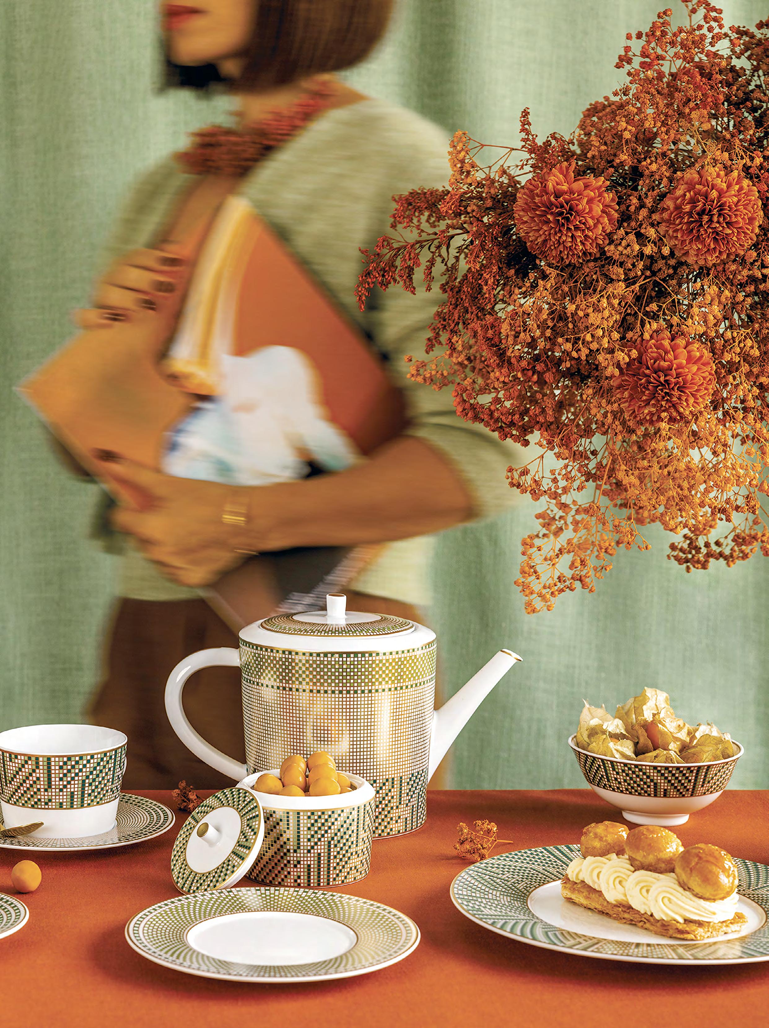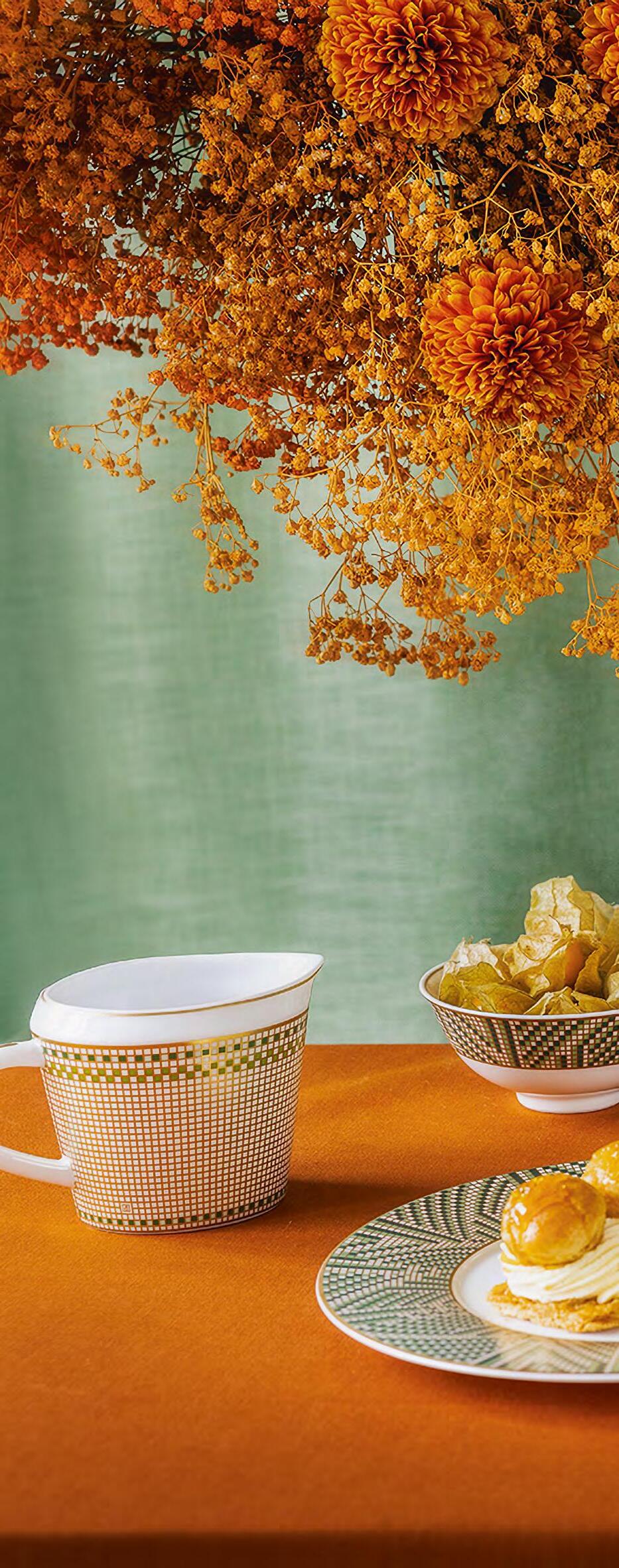 features a mosaic of gold and green in carpet and frieze designs. This era embraced classical precision, simplifying motifs with cubist geometry and GrecoRoman influences. Popular colour pairings included green or yellow with black and white. The name “Augusta” honours Limoges’ Roman-era name, Augustoritum (www.bernardaud.com).