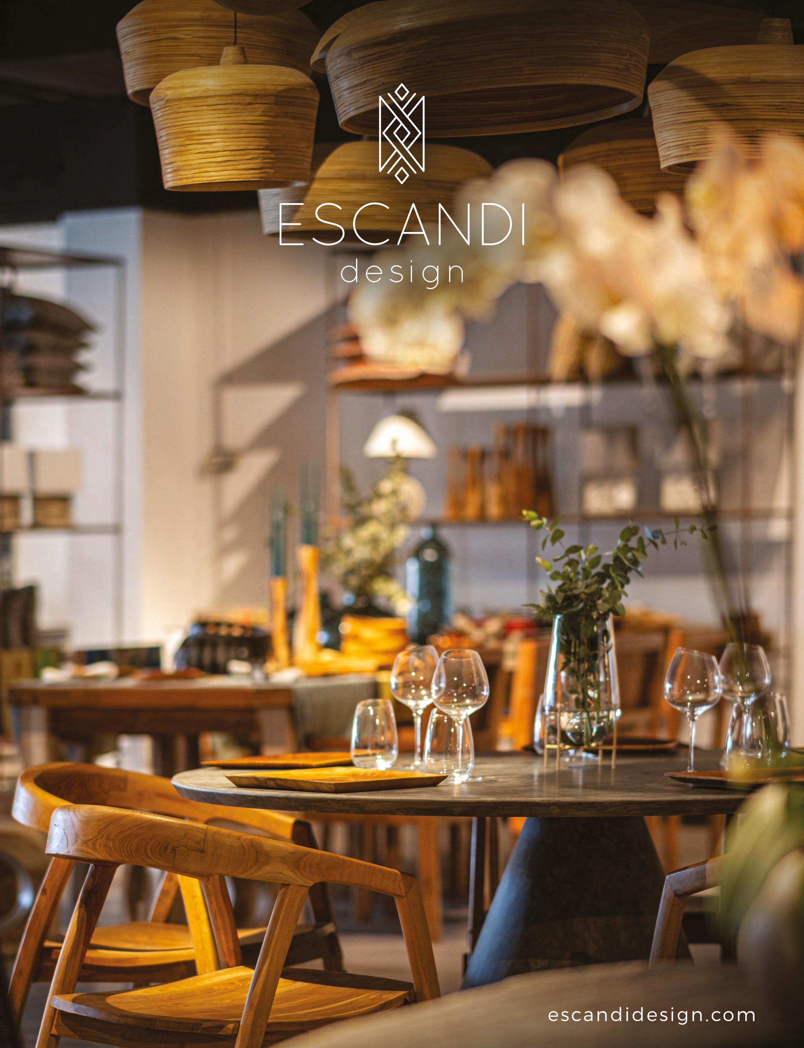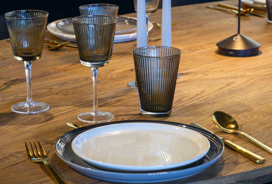 Right The Hoop serving bowl by Stelton is perfect for salads, pasta, desserts, or as a fruit-filled centrepiece, and its 50s-inspired design blends function and style. The smoky glass suits modern homes and pairs well with any dinnerware. Shown here with their Hoop carbonised ash wood salad servers, an ancient Japanese technique that naturally creates a rich, dark glow without stains or chemicals. Available directly from Escandi Design located on the Mijas Road or buy online at www.escandidesign.com
