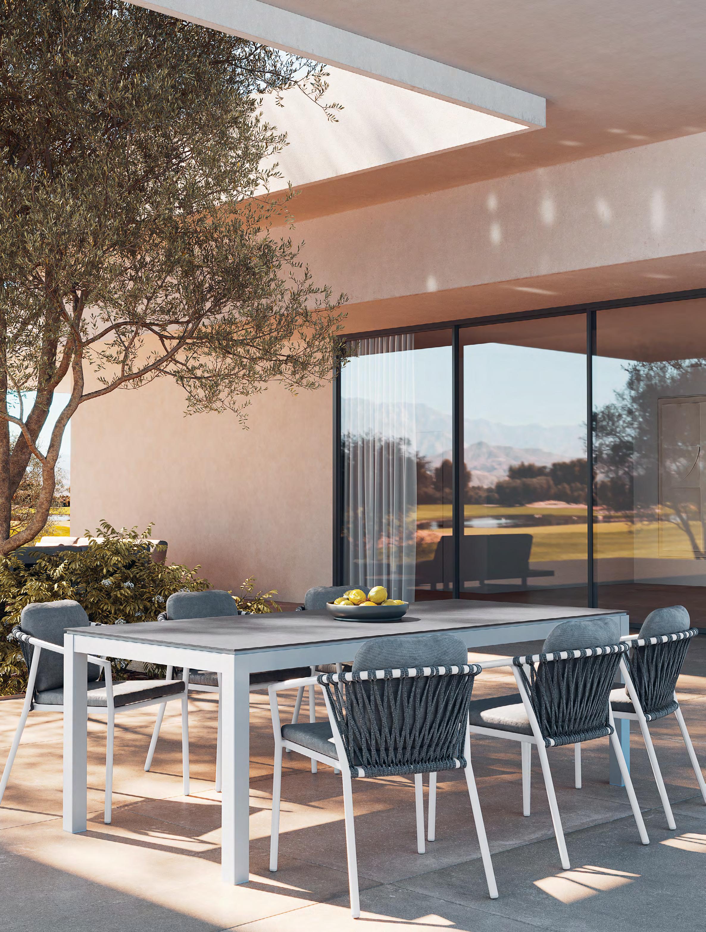 Opposite Page The Danli dining table from Jati & Kebon, shown here with aluminium legs and Palladium Grey ceramic tabletop, has a minimalist design that will pair with most styles of seating. Their Kapra dining chairs, featured here, have premium all-weather cushions made from Sunbrella or Exteria fabrics.