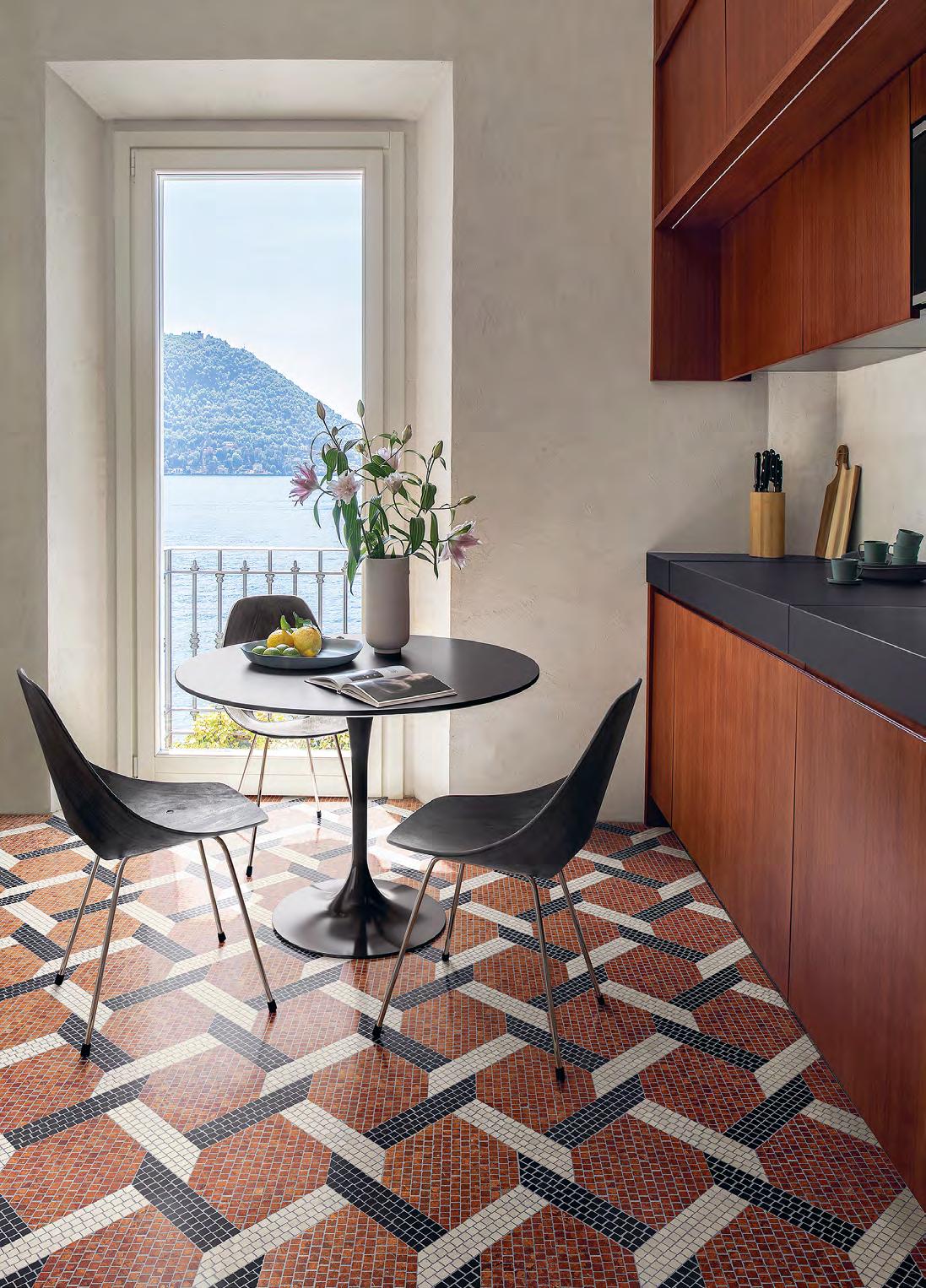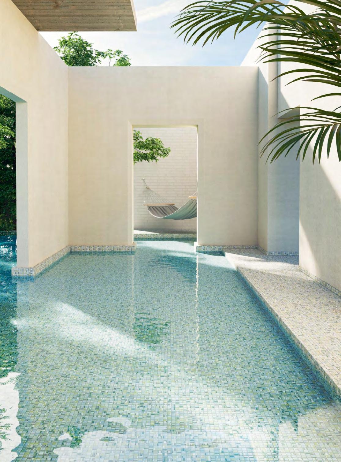 Right The Pigment mosaic tiles from Ezarri’s Aquarelle Collection bring together nature and water to create a stunning watercolour effect. These tiles have a soft, anti-slip texture with a calming mix of chromatic matt tones. Ezarri is available from Guadalmansa in Estepona (www.guadalmansa.es).