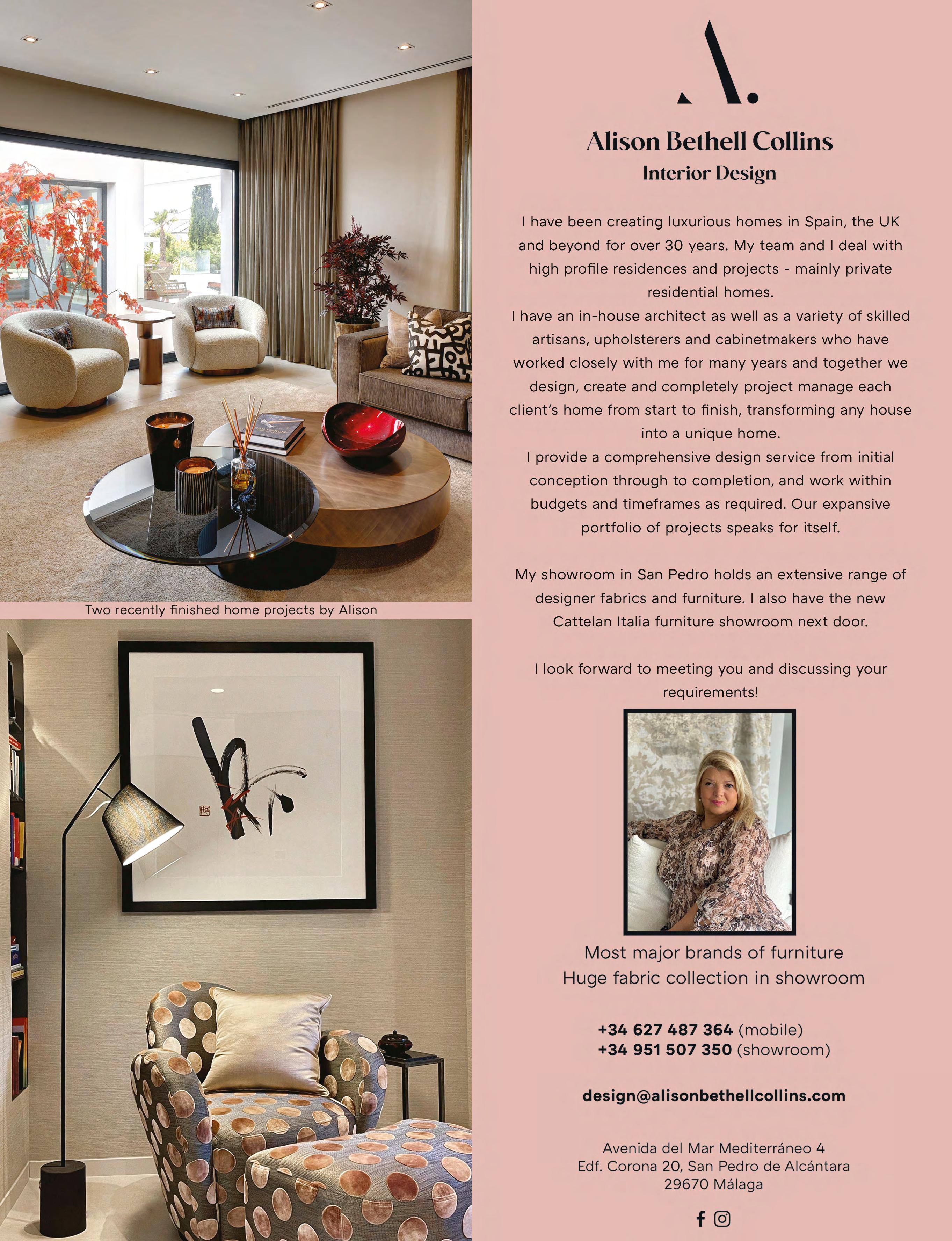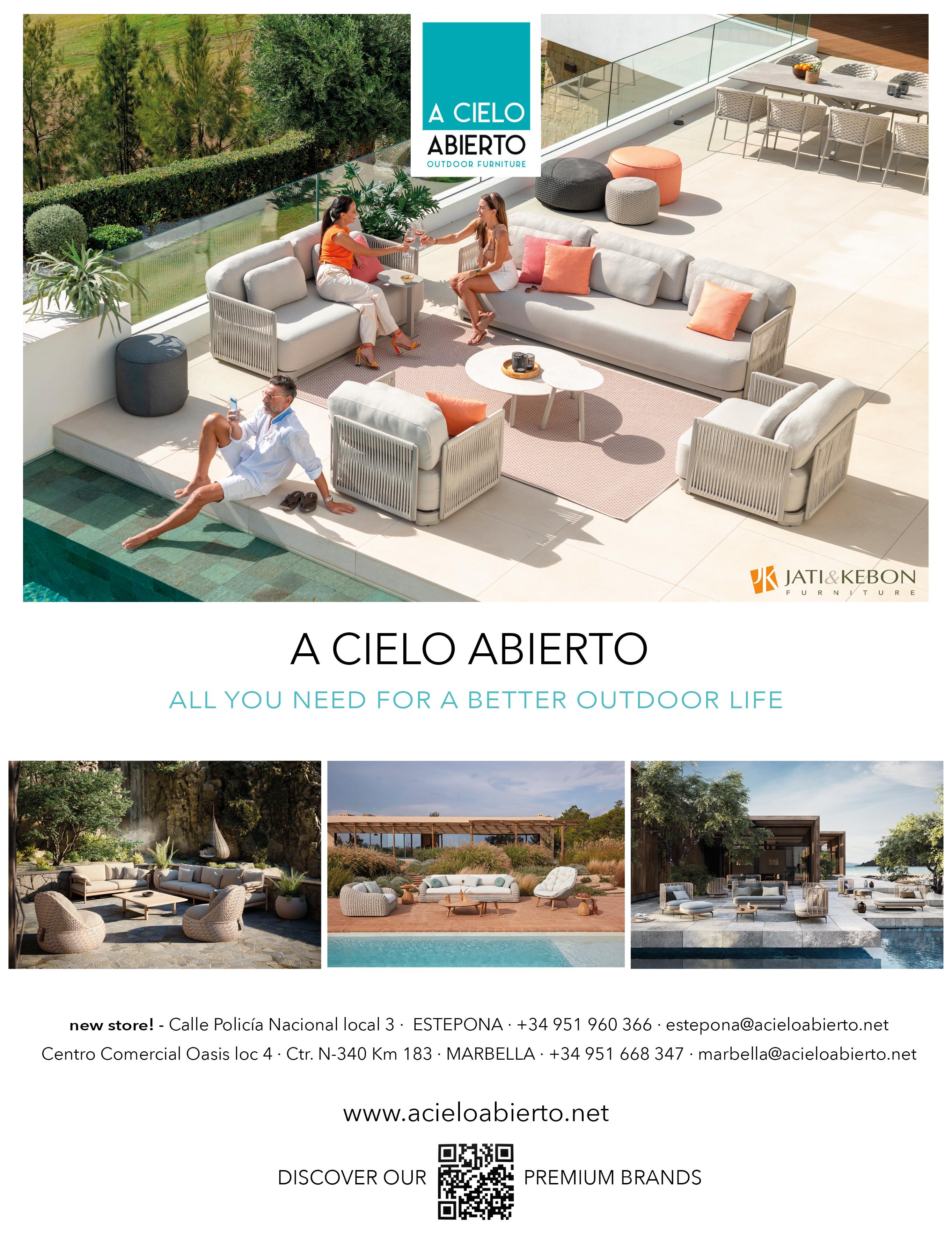 Pedro de Alcántara ( www.acoola.eu ), Fernando Moreno located on Ctra. de Ronda in San Pedro de Alcántara ( www.fernandomoreno.es ), A Cielo Abierto situated in C. de Negocios Oasis on Marbella’s Golden Mile and C/ Policía Nacional 17 in Estepona ( www.acieloabierto.net ), and Ambience Home Design located in Centro Comercial La Poveda in Marbella ( www.ambiencehomedesign.com ).
