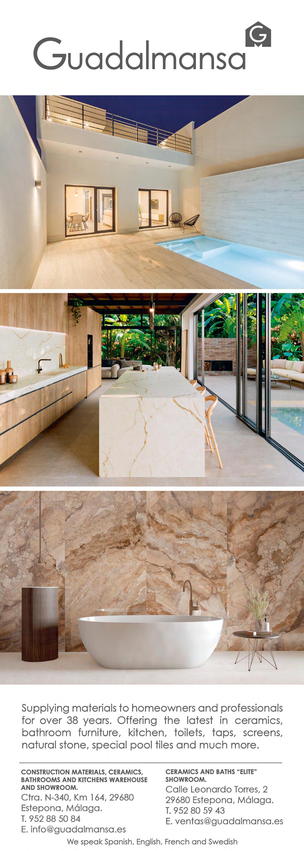 With over 35 years of experience, Guadalmansa is a family-run business specialising in the sale and distribution of aggregates, construction materials, ceramics, bathrooms, and kitchens. They operate from two locations: a 15,000 m2 warehouse and a 2,100 m2 showroom, situated near Cancelada and in the Estepona industrial area. With a recent update of the showroom in the industrial area, both stores now feature the latest trends in ceramics, bathroom and kitchen furniture, sanitaryware, taps, screens, and natural stone, offering a diverse selection of styles and materials and working with high-end brands. At Guadalmansa, personal attention is very important. They are committed