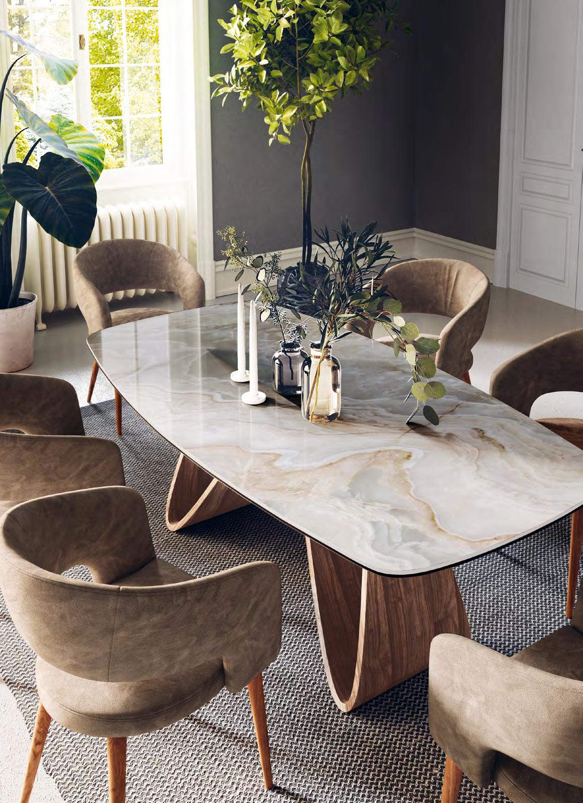 The design behind the Ogado table by Manutti was nature-inspired and comes in an array of organic forms. In the version shown here, the base, in the form of two large feet, is made from brushed teak and features a ceramic tabletop. Manutti’s Sandua chairs are the perfect complement to Ogado, also featuring a teak base supporting a woven shell and voluminous cushions. Manutti is available from Acoola in Pol. Ind. San