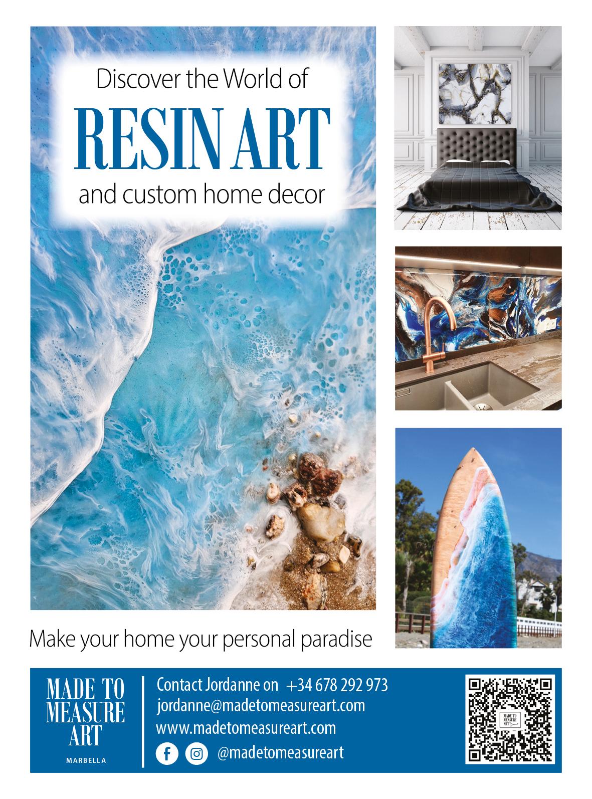 Based between Estepona and Marbella, artist Jordanne Morris is the creative force behind Made to Measure Art, specialising in bespoke resin artworks and home décor. Her portfolio includes a wide range of creations, from abstract wall art to functional pieces such as surfboard tables and coasters. Each item is meticulously handcrafted, allowing clients to select specific colours and sizes to perfectly complement their spaces.