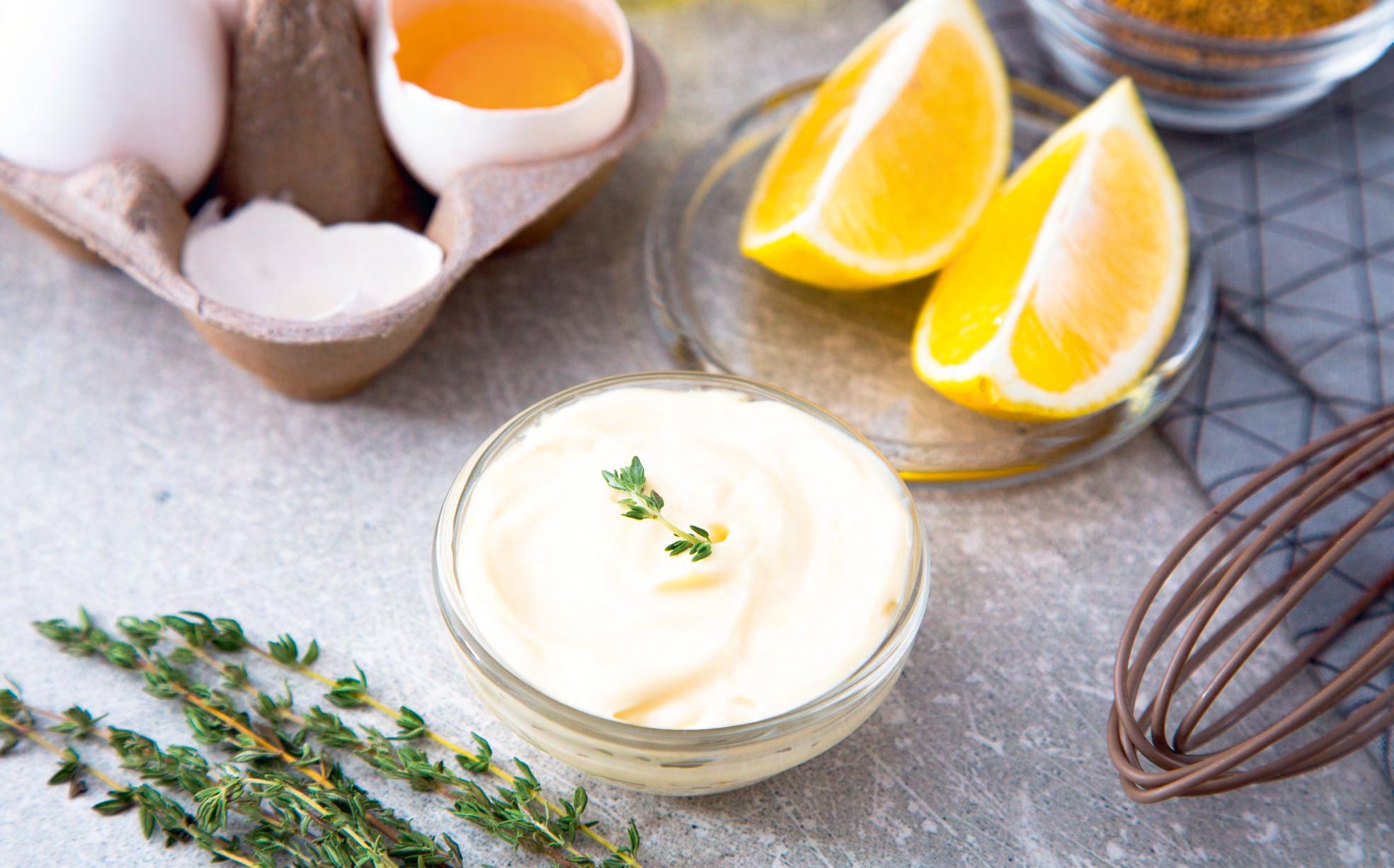 3 To make the mayonnaise, blend egg yolks, half of the lemon juice, mustard, salt, pepper and vinegar with a hand blender. Slowly add the oil so that the mayonnaise doesn’t separate. Once the oil has been added, add the water. Season with salt and lemon juice to your taste and place in fridge.