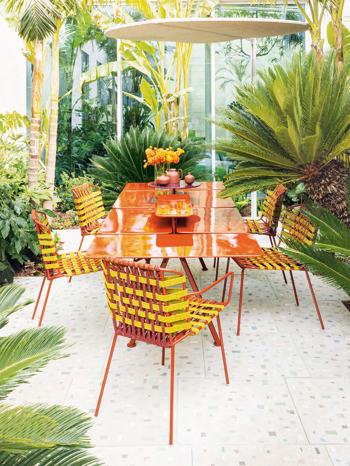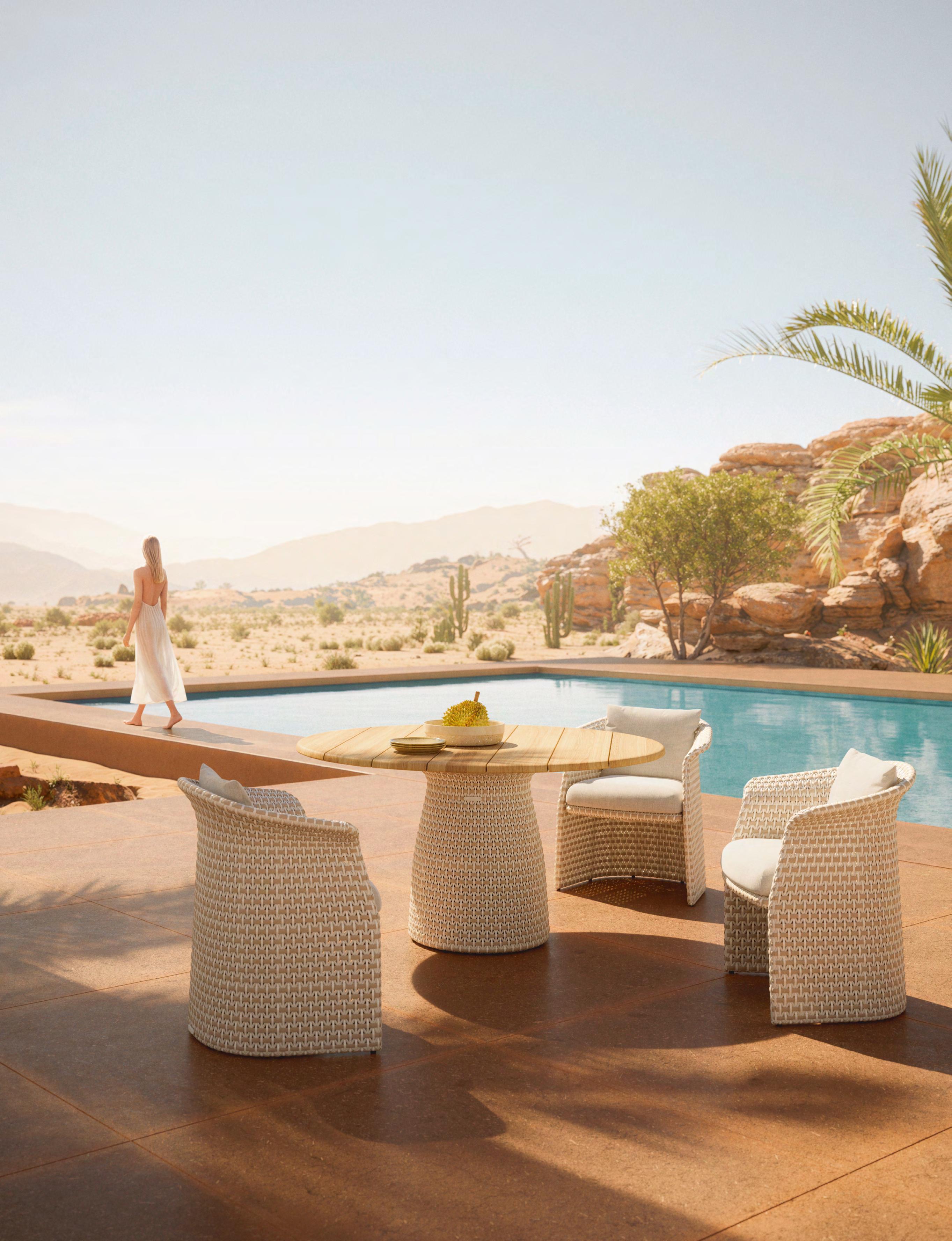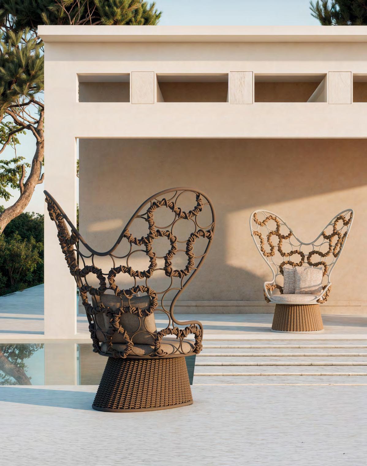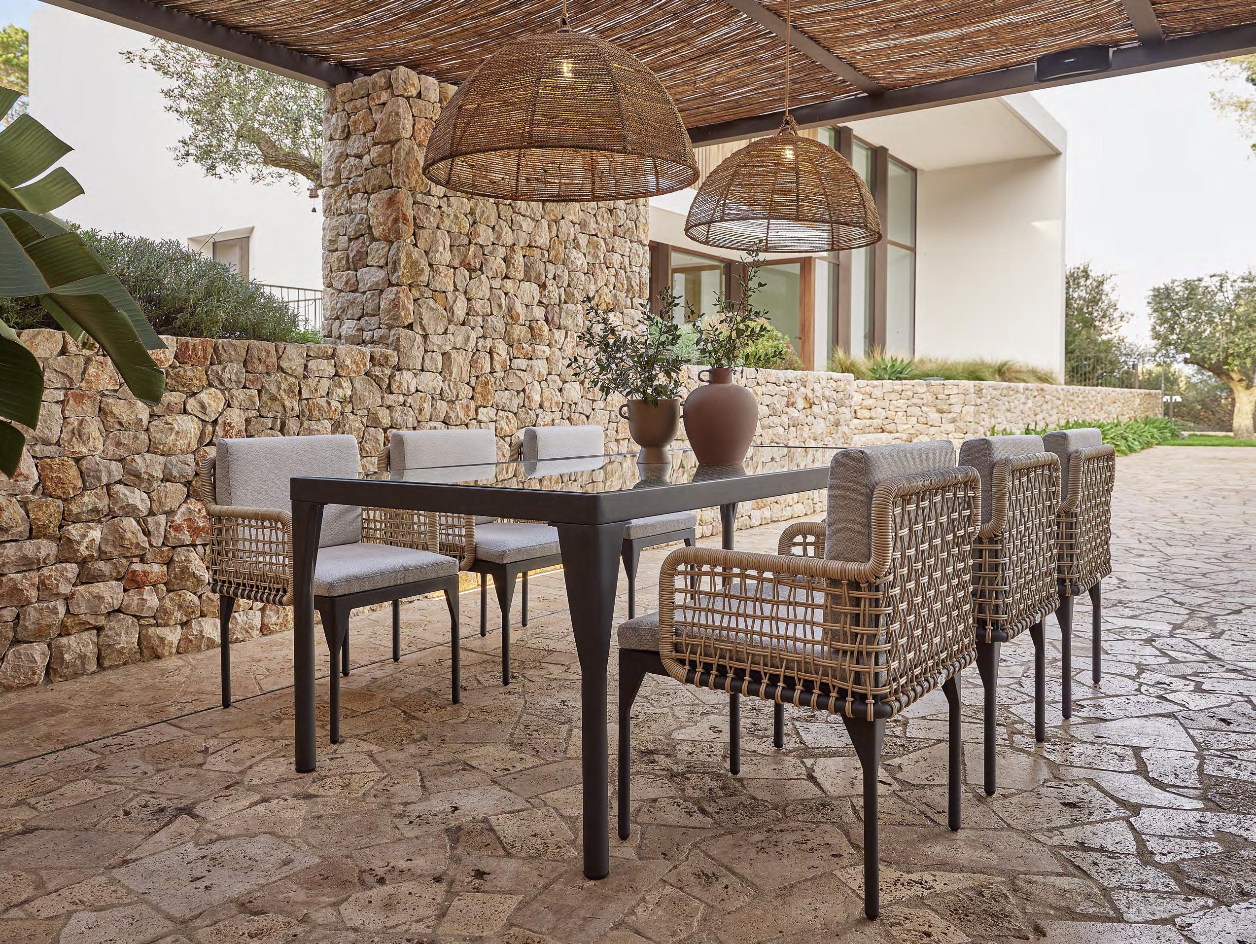 Bottom Left Paola Lenti’s Altopiano sculptural modular table was awarded the 2024 German Design Award “Gold” and the Stylepark Selected Award. With a lacquered aluminium base and tops in glazed stone or textured glass, it can span large dimensions without central legs and features an aluminium frame with adjustable feet and handcrafted tops in various sizes and finishes. The Telar chairs come in an array of colours, made from braided rope and a gloss-varnished stainless-steel frame. Gunni & Trentino in Marbella Club is an official retailer of Paola Lenti (www.gunnitrentino.es).