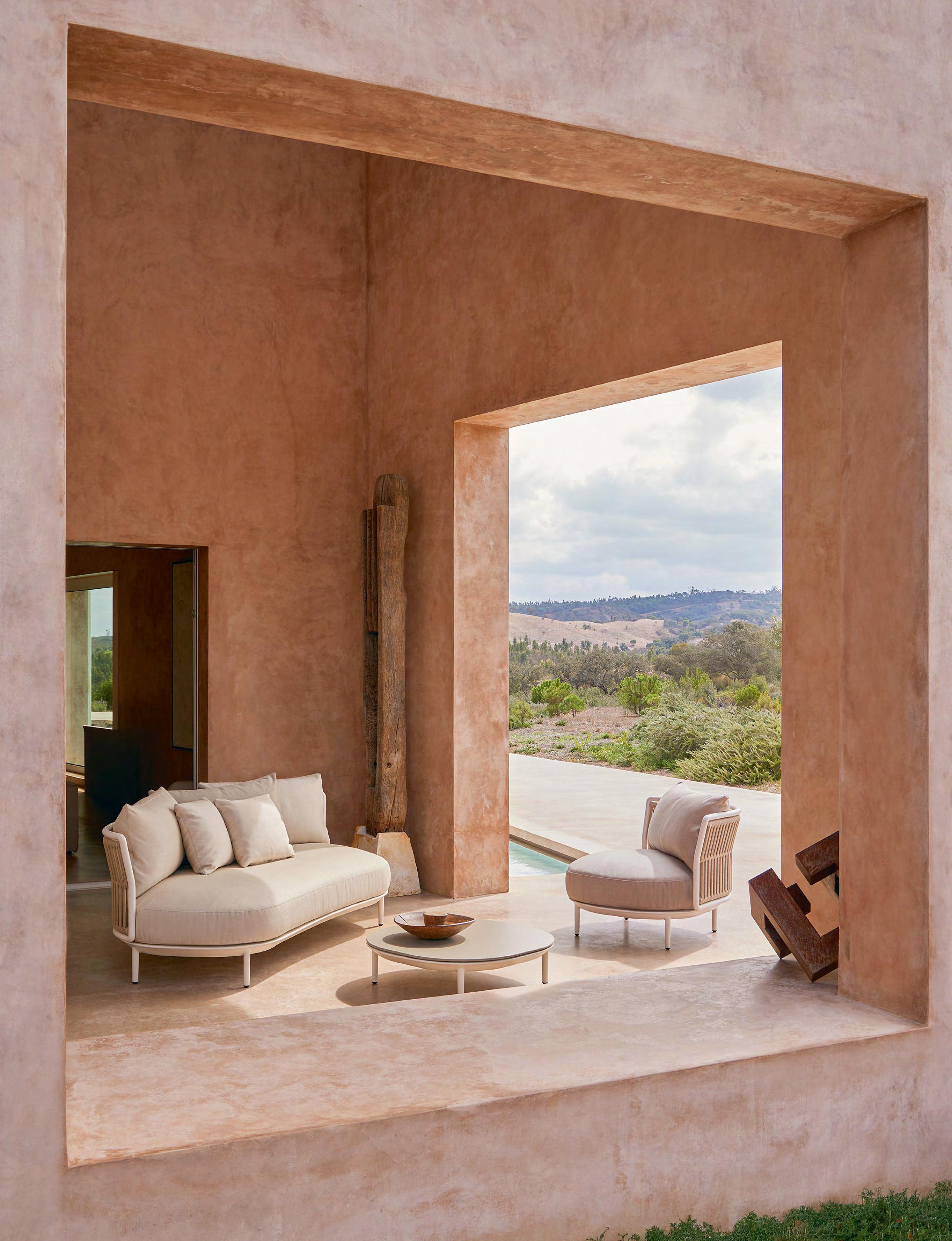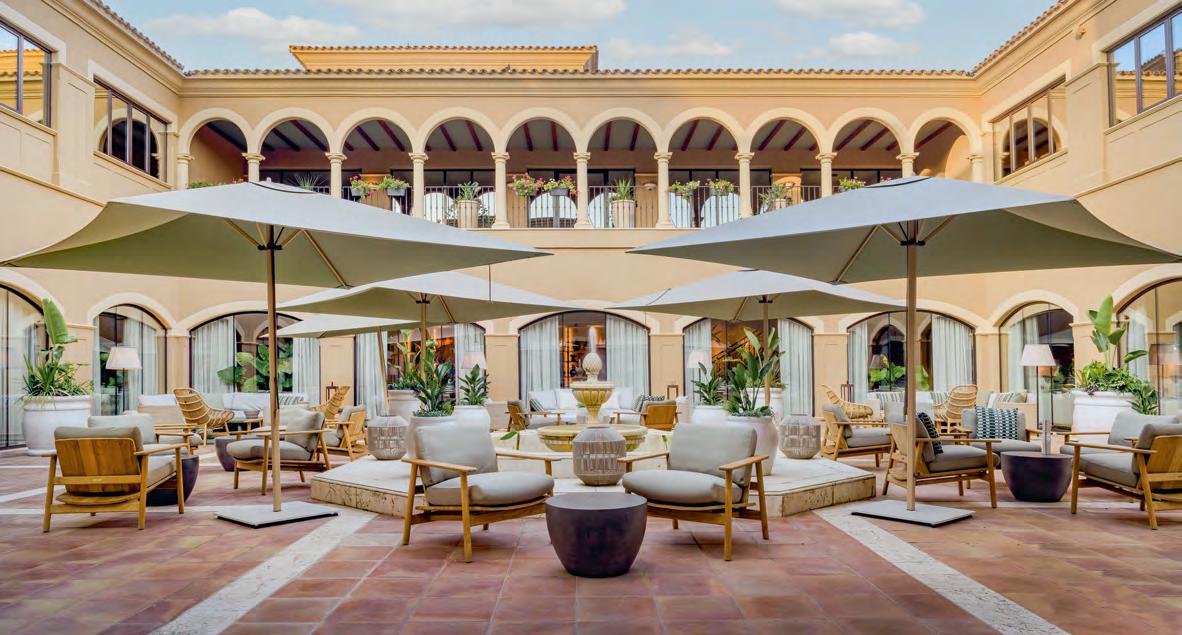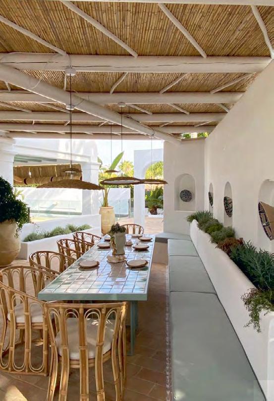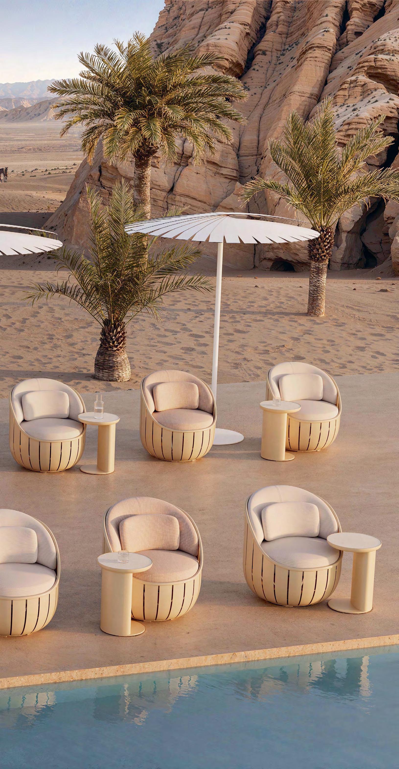 Bottom Left Paola Lenti’s Altopiano sculptural modular table was awarded the 2024 German Design Award “Gold” and the Stylepark Selected Award. With a lacquered aluminium base and tops in glazed stone or textured glass, it can span large dimensions without central legs and features an aluminium frame with adjustable feet and handcrafted tops in various sizes and finishes. The Telar chairs come in an array of colours, made from braided rope and a gloss-varnished stainless-steel frame. Gunni & Trentino in Marbella Club is an official retailer of Paola Lenti (www.gunnitrentino.es).