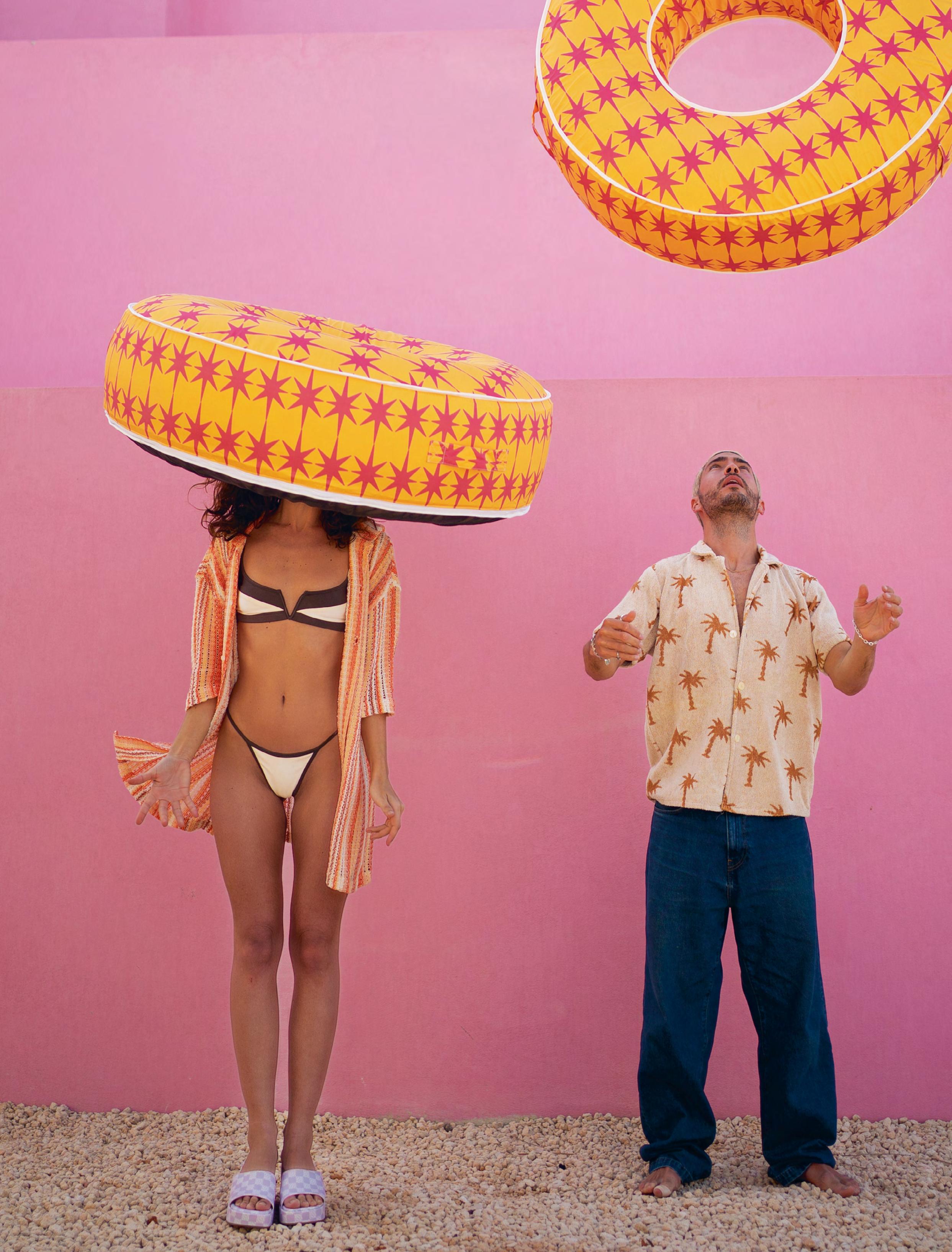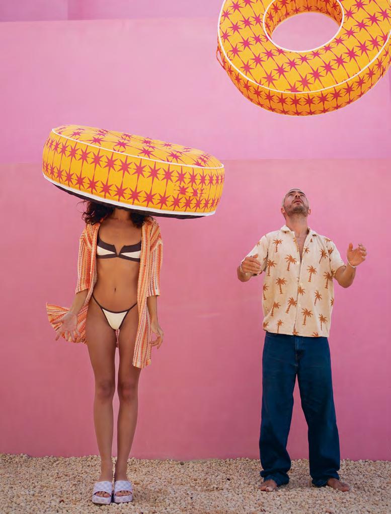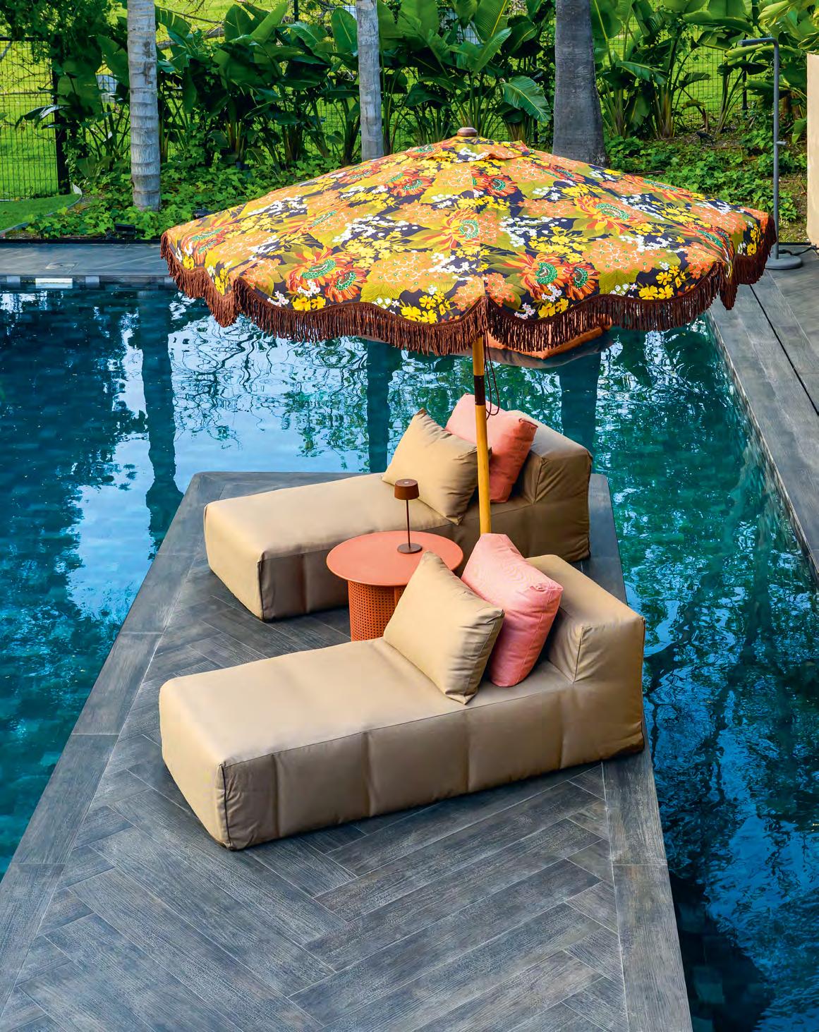 Below Right This striking poolside retreat curated by the Acoola design team features sun loungers by Bed & Philosophy, a warm-toned playful parasol by HK Living, and a complementary side table by IsiMar that echoes the sunset palette. All available from Acoola situated in Pol. Ind. San Pedro de Alcántara (www.acoola.eu). Photo by Johnny Gates.