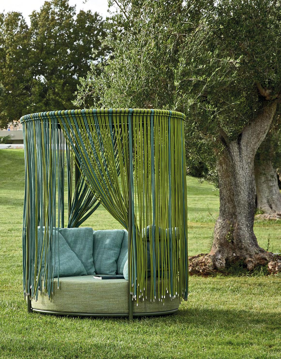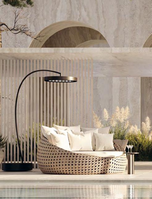 Right This award-winning canopied circular lounger by Roberti Rattan, crafted from powder-coated 304 steel with a Batyline top and hand-woven Round Trendyrope, offers a distinctive blend of design and comfort. Its nestlike form, wrapped in skilfully blended tones, creates a serene haven for poolside or garden relaxation. The circular seat invites restful lounging, while the canopy provides gentle shade. Heidi Gubbins, situated in Urb. Marbella Real, is an official retailer of Roberti Rattan (www.heidigubbins.com).