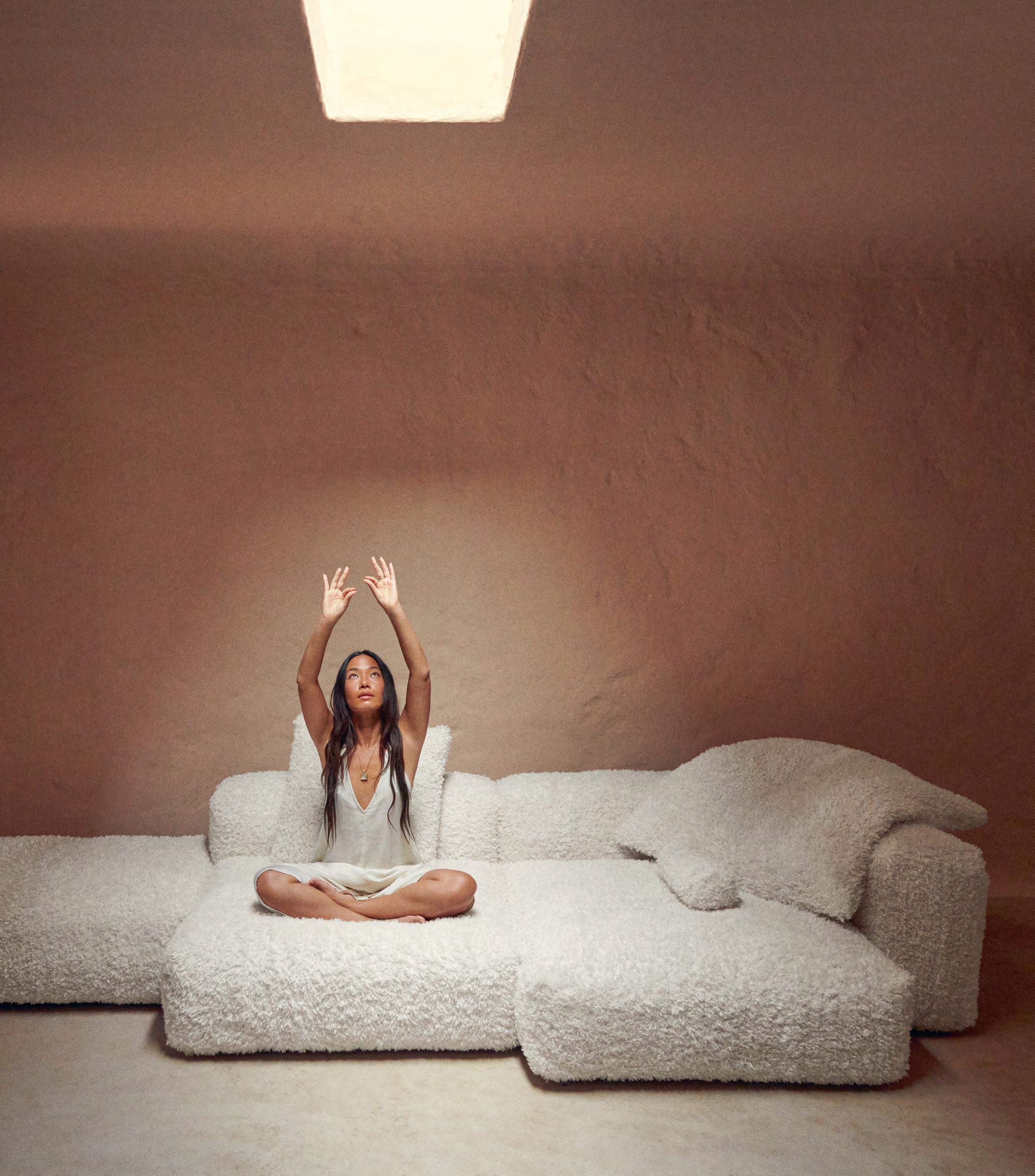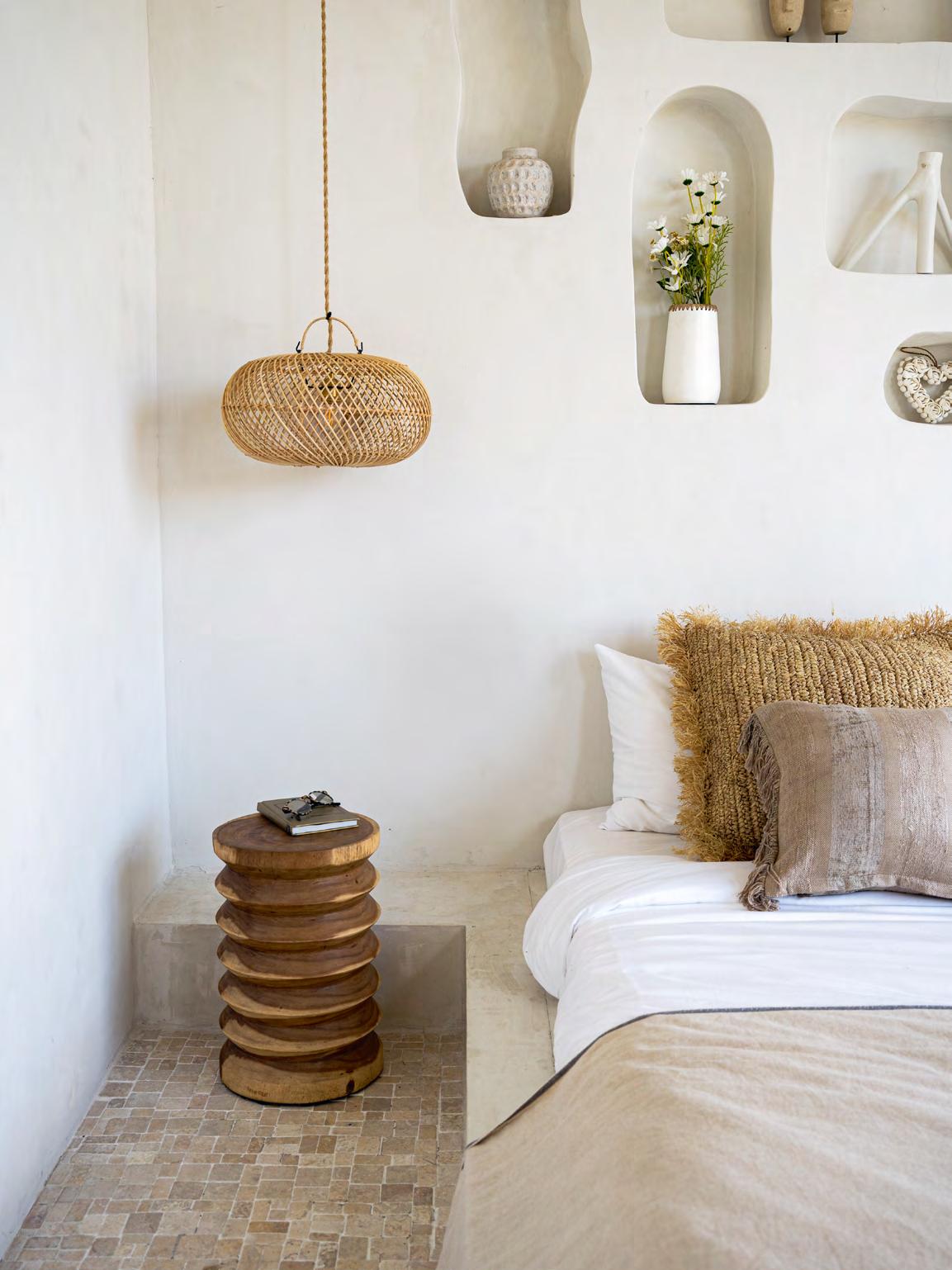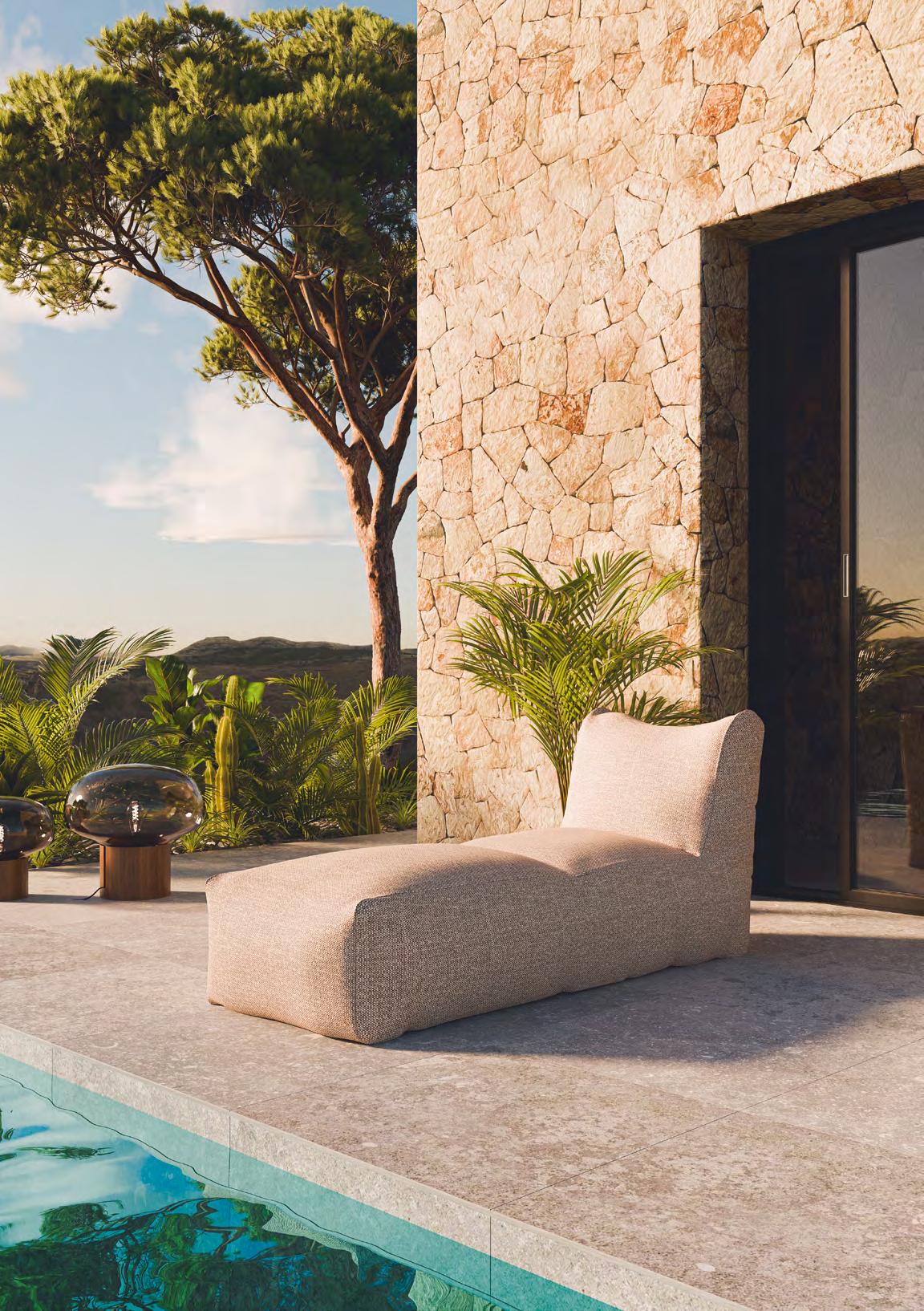 Right The handmade Laui Lounge Boho long chair in white combines luxury with durability. Suitable for indoor and outdoor use, its water-repellent fabric and eco-friendly recycled EPS filling keep it weatherproof year-round. A safety locking YKK zip prevents unintentional opening. Laui Lounge is available from Metamorfoza in Pol. Ind. Nueva Campana in Nueva Andalucía (www.home-metamorfoza.com).