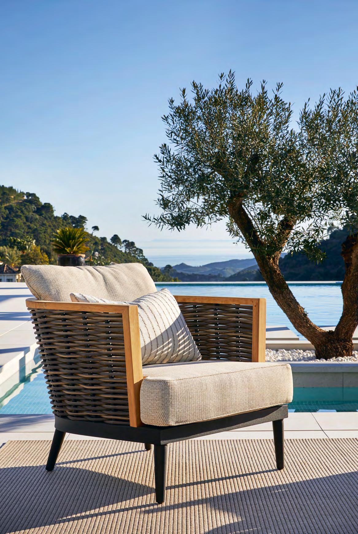 Right The Tivoli armchair by G&G Italia showcases a refined blend of premium materials and expert craftsmanship. Its solid teak wood frame offers natural warmth and durability, while the seat and backrest feature a striking mix of full weave and net weave rope for structure and breathability. A soft, quick-dry cushion adds an extra layer of comfort, making it as practical as it is stylish. Shown here with the Zen 2 Seat sofa with teak frame and weaved rope backrest. The Harp coffee table – also with weaved rope around an aluminium frame - finishes the look. Available now for QuickShip delivery. Tel. (+34) 678 805 870 or visit www.gg-italia.net