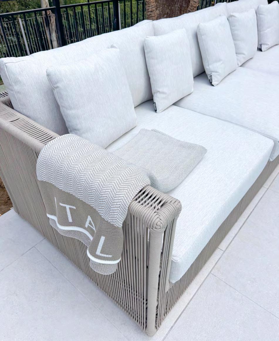 Introducing the new outdoor blanket by G&G Italia, crafted with premium solution-dyed Italian yarn for superior durability and style. Engineered for the outdoors, it offers 100 per cent resistance to mould and bacteria, excellent UV protection, and outstanding performance in dry and wet friction tests. It also resists common liquid stains including sunscreen. Available in two elegant colours, this blanket combines style, comfort, and long-lasting quality for any outdoor setting. For enquiries call (+34) 678 805 870 or visit www.gg-italia.net