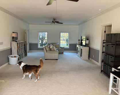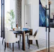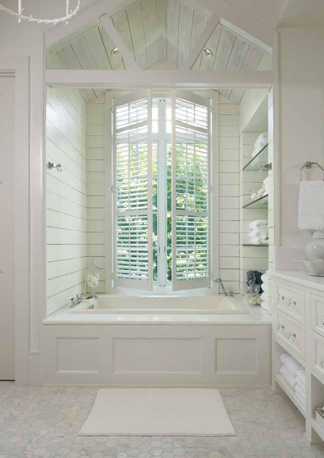 Kitchen: Furniture-style cabinetry detailing nods to tradition, offset by airy glass-front uppers. At the heart of the room, the Cambria island in Montgomery commands attention. The kitchen features Pompeii quartz countertops, sourced from UMI Stone, providing a modern concretelook surface. This blend creates space for statement pieces like the farmhouse sink and full-height glass herringbone backsplash. “The crown moulding draws the eye upward while giving the kitchen a classic undertone, allowing us to experiment more with tile and color,” shares Nicklas.