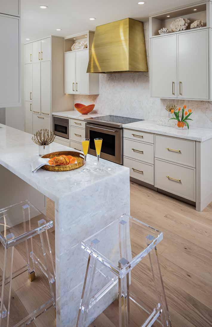 This jewelry box of a home has been transformed to a chic and elegant space overlooking sparkling waters. Upon entering is a gorgeous stairway with continuous hardwood floors, and at the top of the stairs is a gorgeous view of the main living area. The once dark galley kitchen has been given new life with a taupe gray cabinet by Crystal Cabinet Works, accented by a stunning custom gold hood vent and gold hardware throughout. New fully integrated appliances by Sub-Zero, Wolf, and Bosch blend seamlessly with this kitchen design. The premium cabinet storage has two decorative open cabinets with recessed lighting that illuminate the gorgeous natural coral, flanking the brass hood, and includes a coffee station and pantry storage. The Cristallo quartzite waterfall over the exposed bar edge coupled with Lucite counter stools add elegance and make this the perfect place for guests to have cocktails while their host is working in the kitchen. u