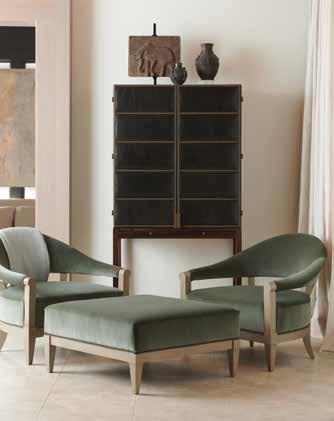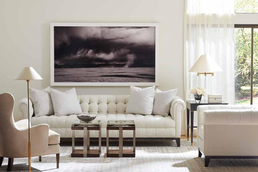 The great room is the epitome of elegant entertaining. The dry bar with hand-painted gold cabinets and a stunning metallic marble backsplash creates the perfect space to prepare cocktails without leaving guests. The mini fridge has been beautifully camouflaged with a wooden door front, blending seamlessly with the surrounding cabinetry. The sofas and swivel chairs are from Hickory Chair and have a neutral tone to complement the rust, ochre, and beige tones in the rug and throughout the space. The client wanted her Hermes tray and throw blanket to be the stars of the show in the living space; they make a statement while not feeling out of place. Serving as the entry console is a custom 102” locally made floating cabinet in a metallic linen finish, which assists in keeping the small space open and airy. u