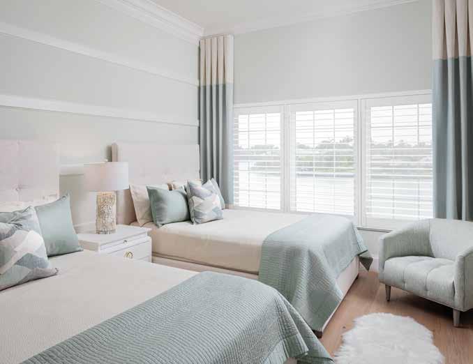 With a coastal appeal, this guest bedroom is a symphony of seafoam green. The wall color, bedding ensemble, and drapery all play off each other, creating a serene retreat for visiting family and friends. The Bungalow 5 nightstands and dresser are covered in white lacquered grasscloth, keeping with the light coastal feel in this space. Accommodating two queen beds for guests while maintaining an open and inviting space was accomplished with the use of simple moldings applied to the headboard wall, making the wall feel longer than it is while also adding interest. u