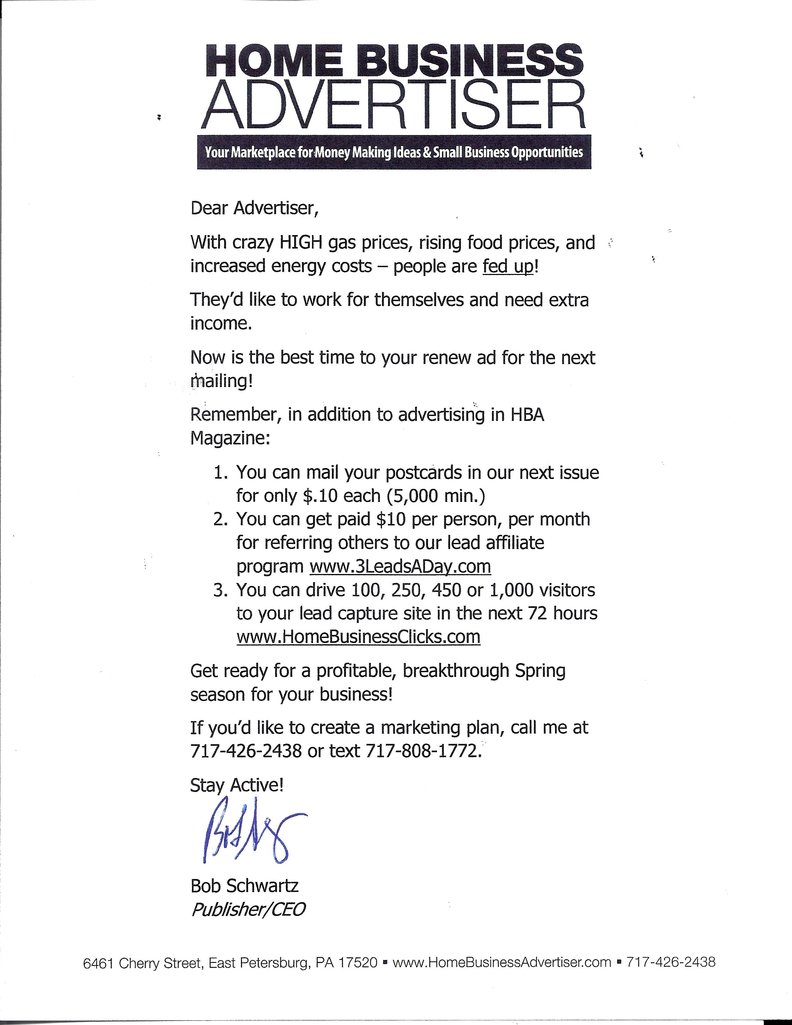 AUGUST 11TH is the day to remember Circle the date on your calendars, August 11th, for an opportunity you won’t want to miss. Don’t miss out on September advertising! As summer winds down, it’s the perfect time to target back-to-school shoppers, get ahead of the holiday rush, and tap into increased consumer spending! We’ve got you covered! SEPTEMBER marks a fresh start! Actfast to take advantage of this exclusive deal and give your business the boost it deserves! To Place Your Ad – Call 717-808-1772 Email: Bob@3LeadsADay.com www.HomeBusinessAdvertiser.com Run a full-page ad ($795) with us and get a ½ page press release for free! ----------------------------------Or run a half-page advertisement with a $100 discount, reducing the price from its regular cost of $495 to only $395. We’re also offering a free one-hour ad design service to make your ad stand out from the crowd. 11