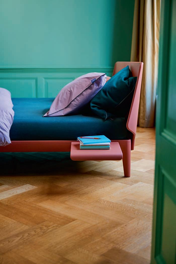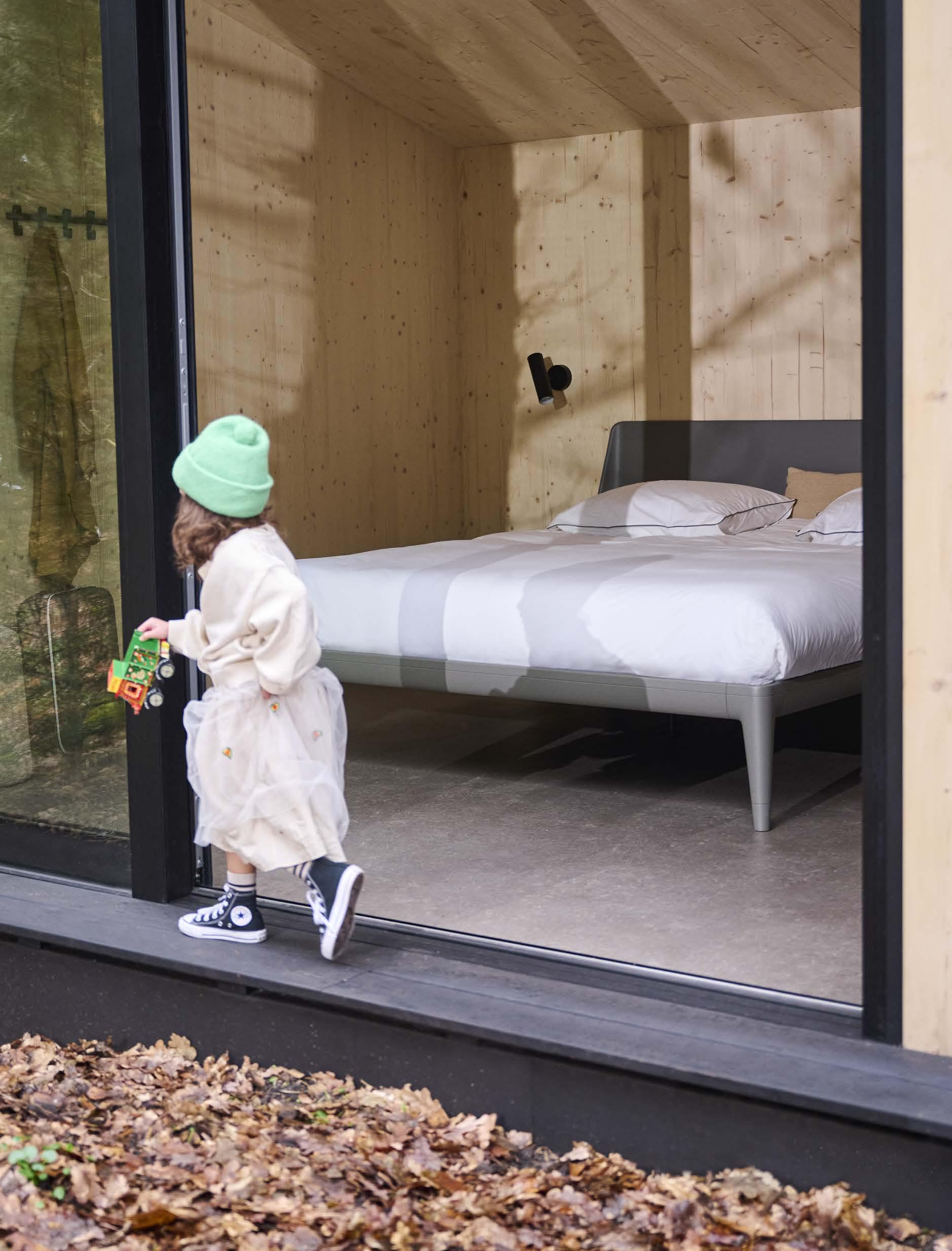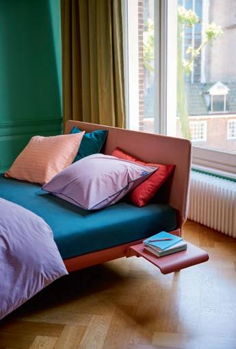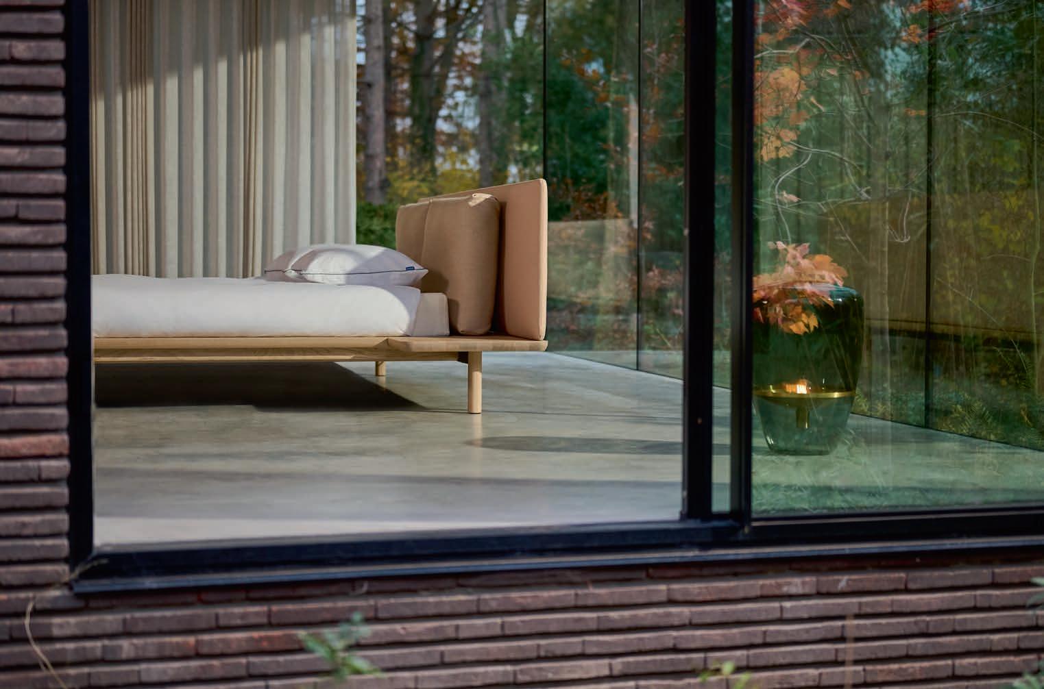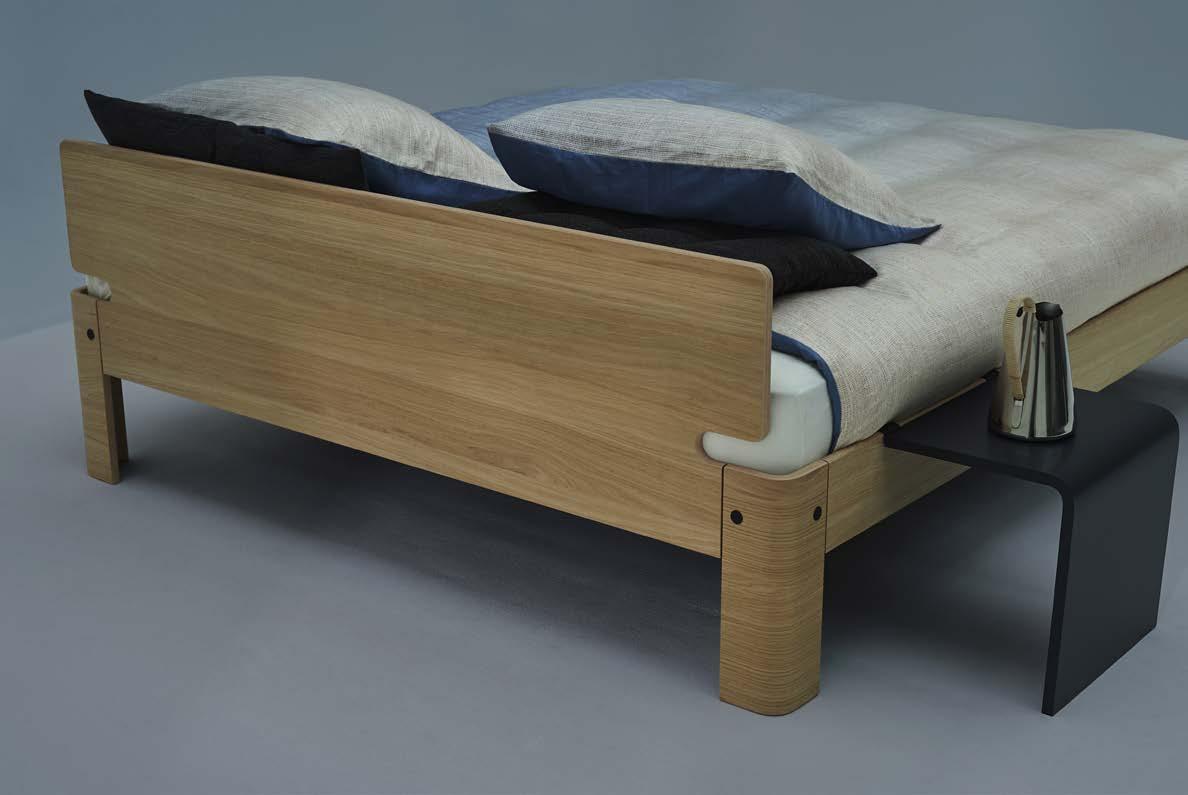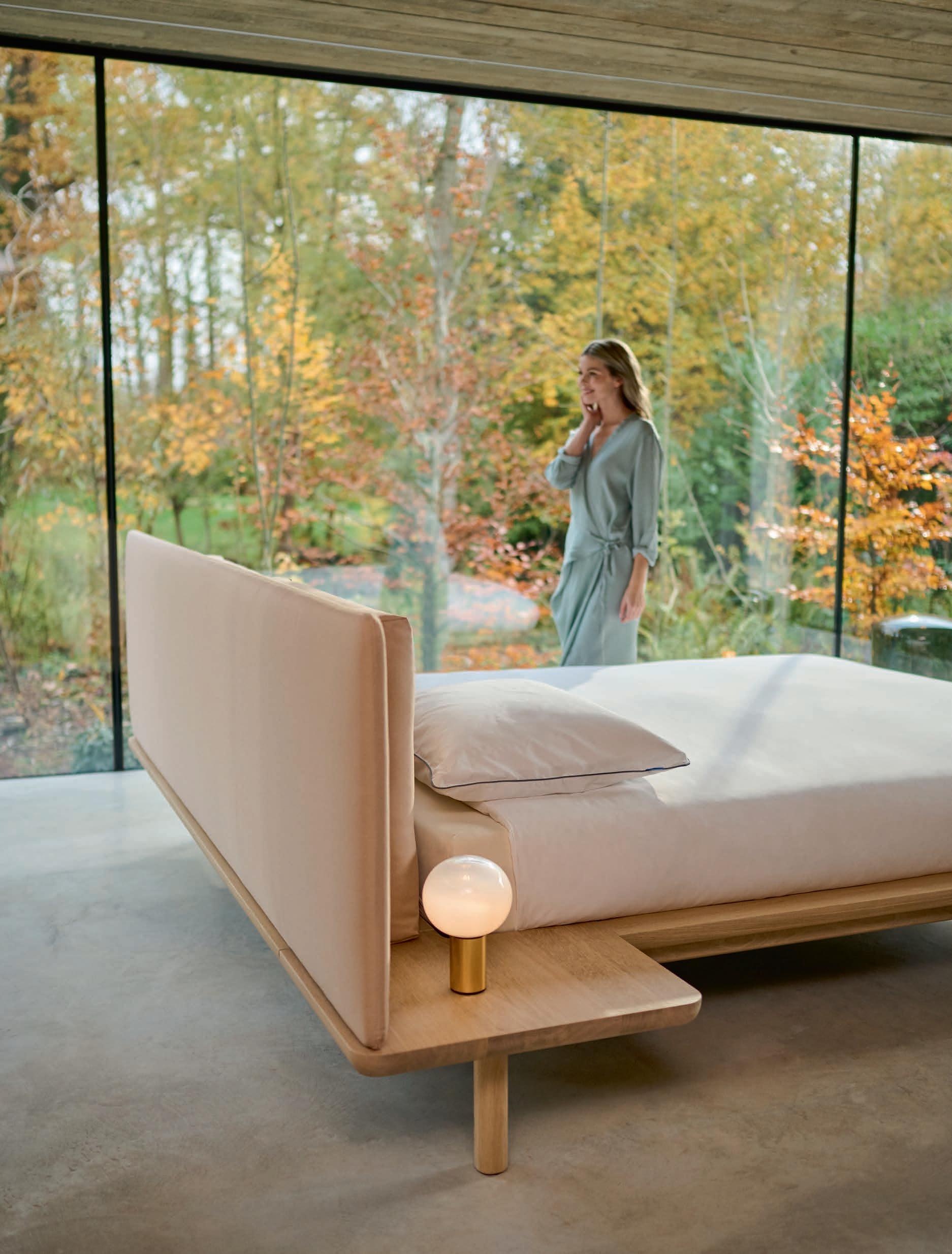 “Tijdens het ontwerpen heb ik gefocust op ingetogen luxe, functionaliteit en geborgenheid. Voor mij zit luxe ook in het gebruik van hoogwaardige en natuurlijke materialen; vandaar de keuze voor massief eikenhout. De afgeronde hoeken voelen zacht en stralen vakmanschap en kwaliteit uit. Er ontstaat mooie gelaagdheid doordat de tafeltjes aan het bed vastzitten en de zachte loungekussens van het brede hoofdbord rusten op het houten plateau. Dat zorgt voor balans in dit tijdloze ontwerp.”