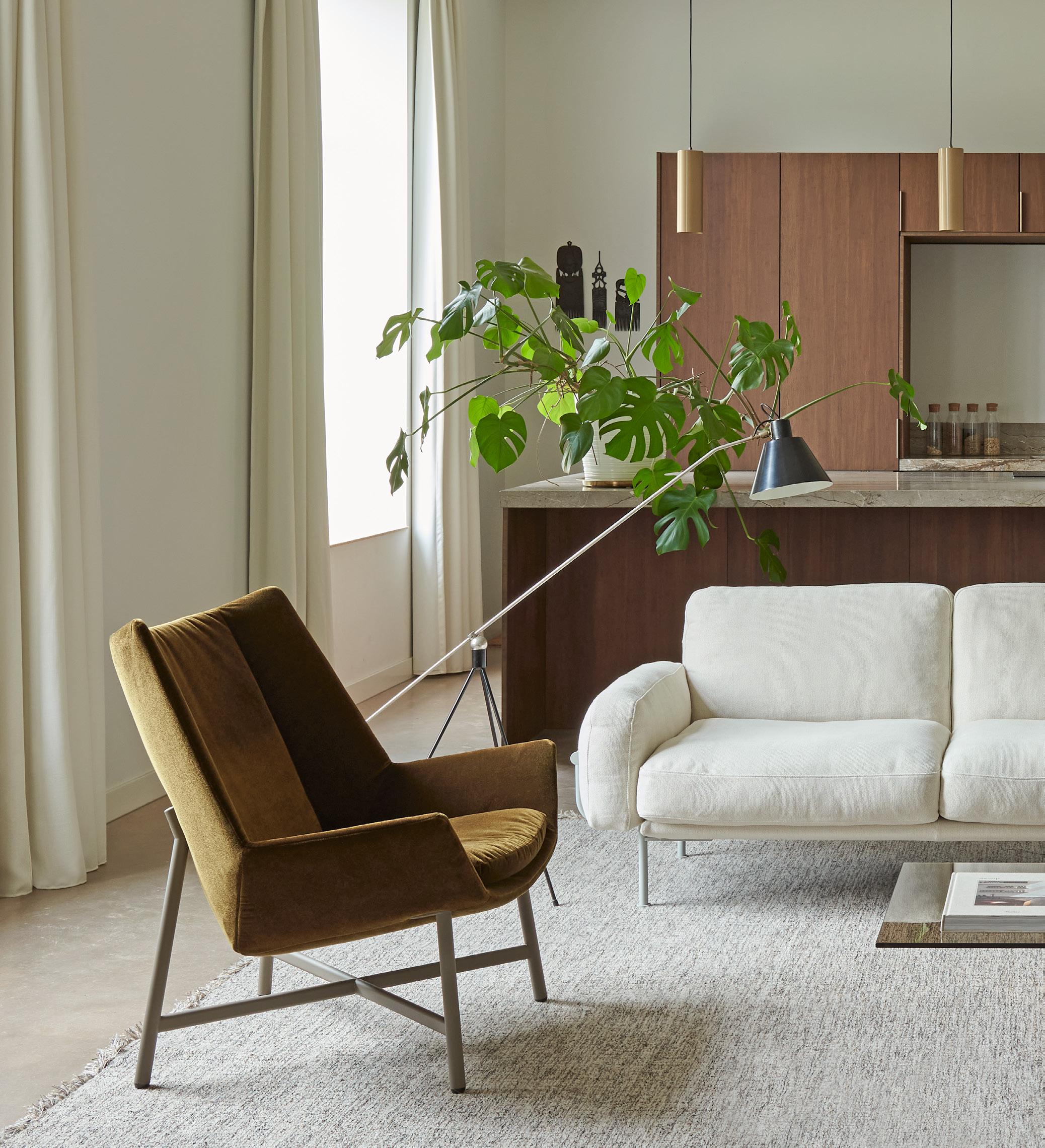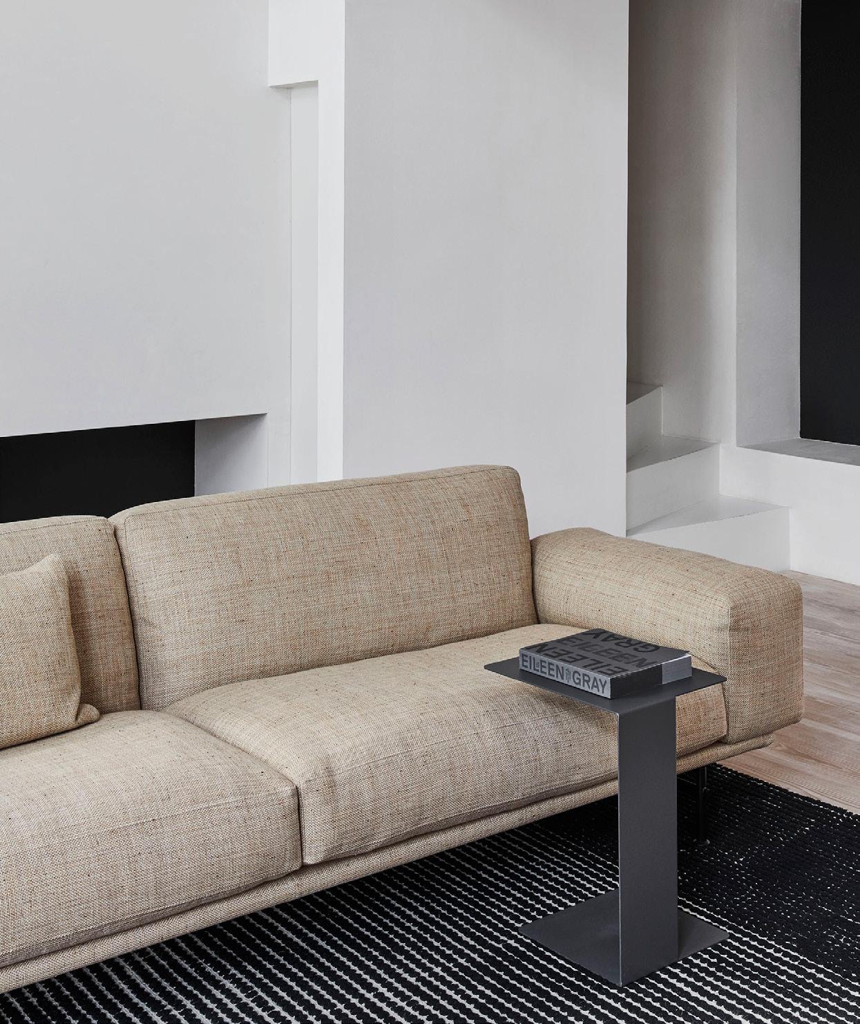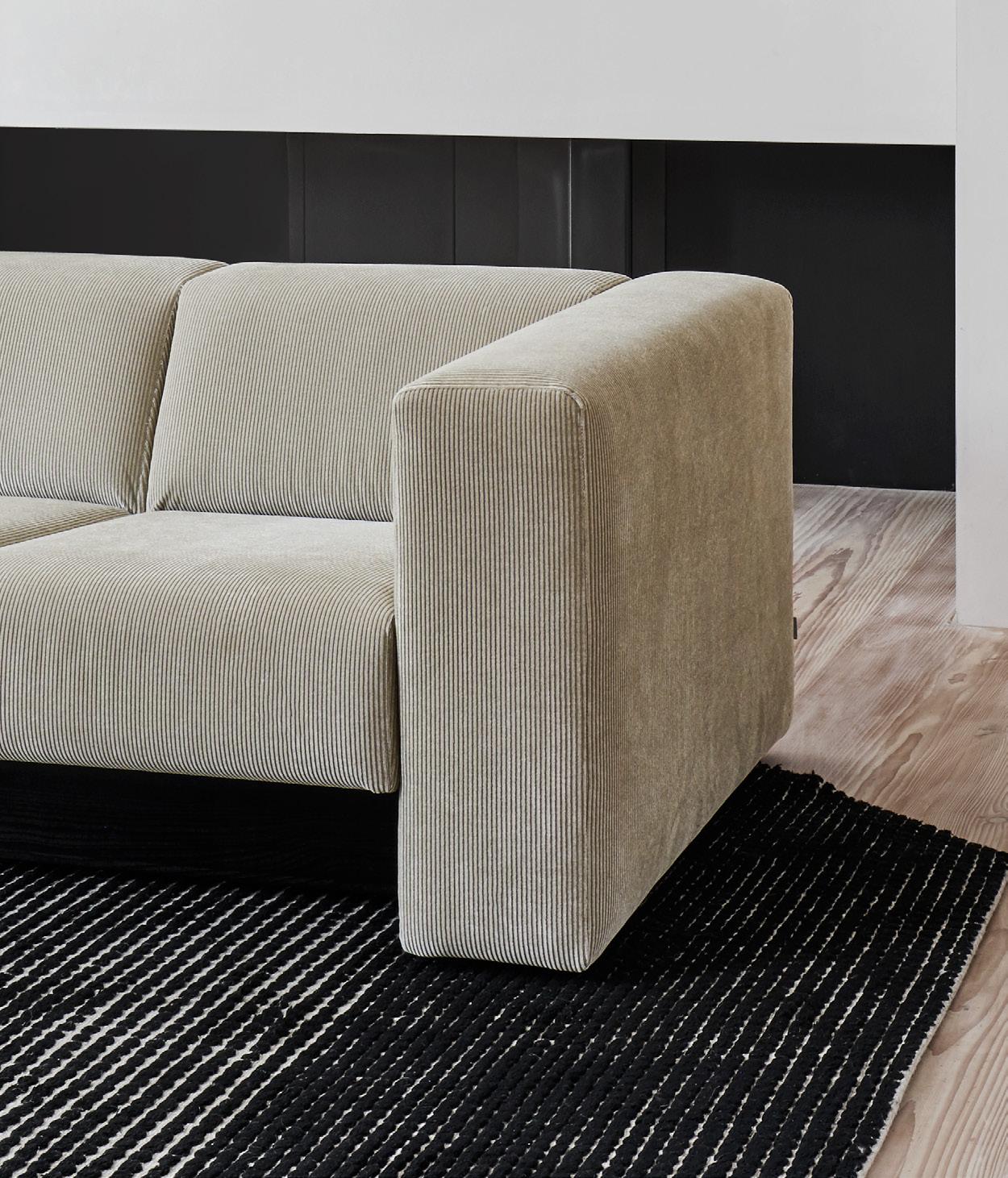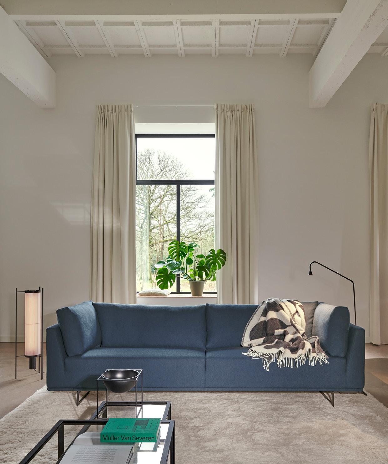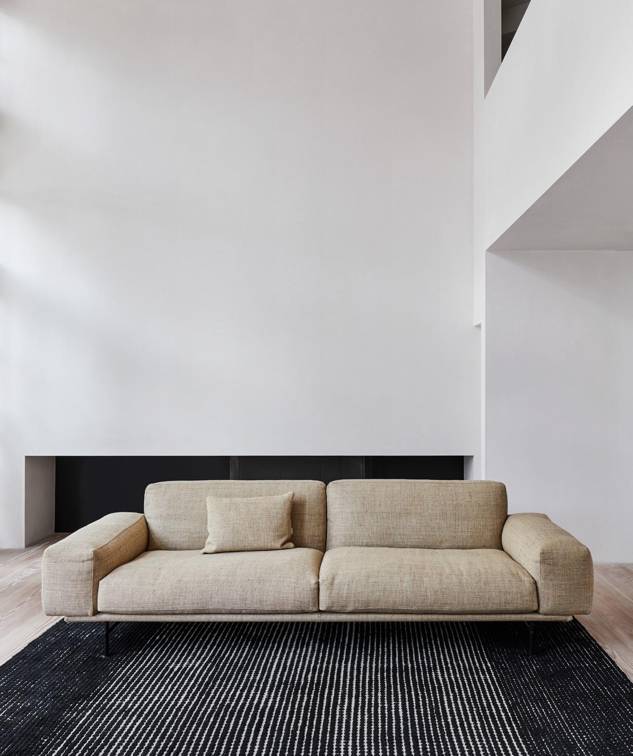 The 10010 Prime was designed by Studio Truly Truly in 2020. The sofa is comfortable, and its thick, almost voluptuous seat makes it look soft yet architectural. The arm cushions hang just slightly over the edge of the slender base, giving the design character.
