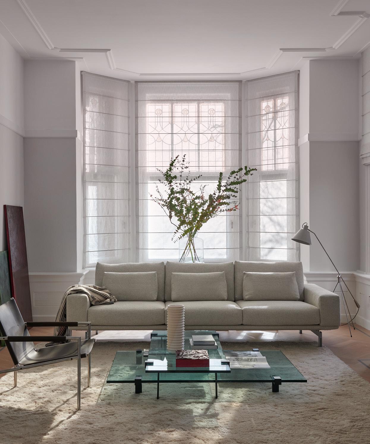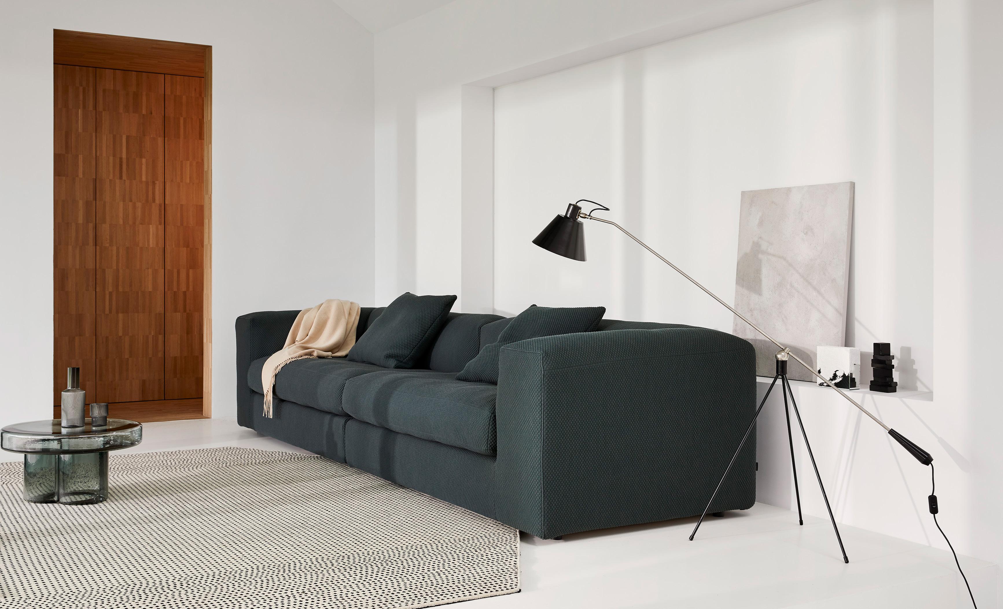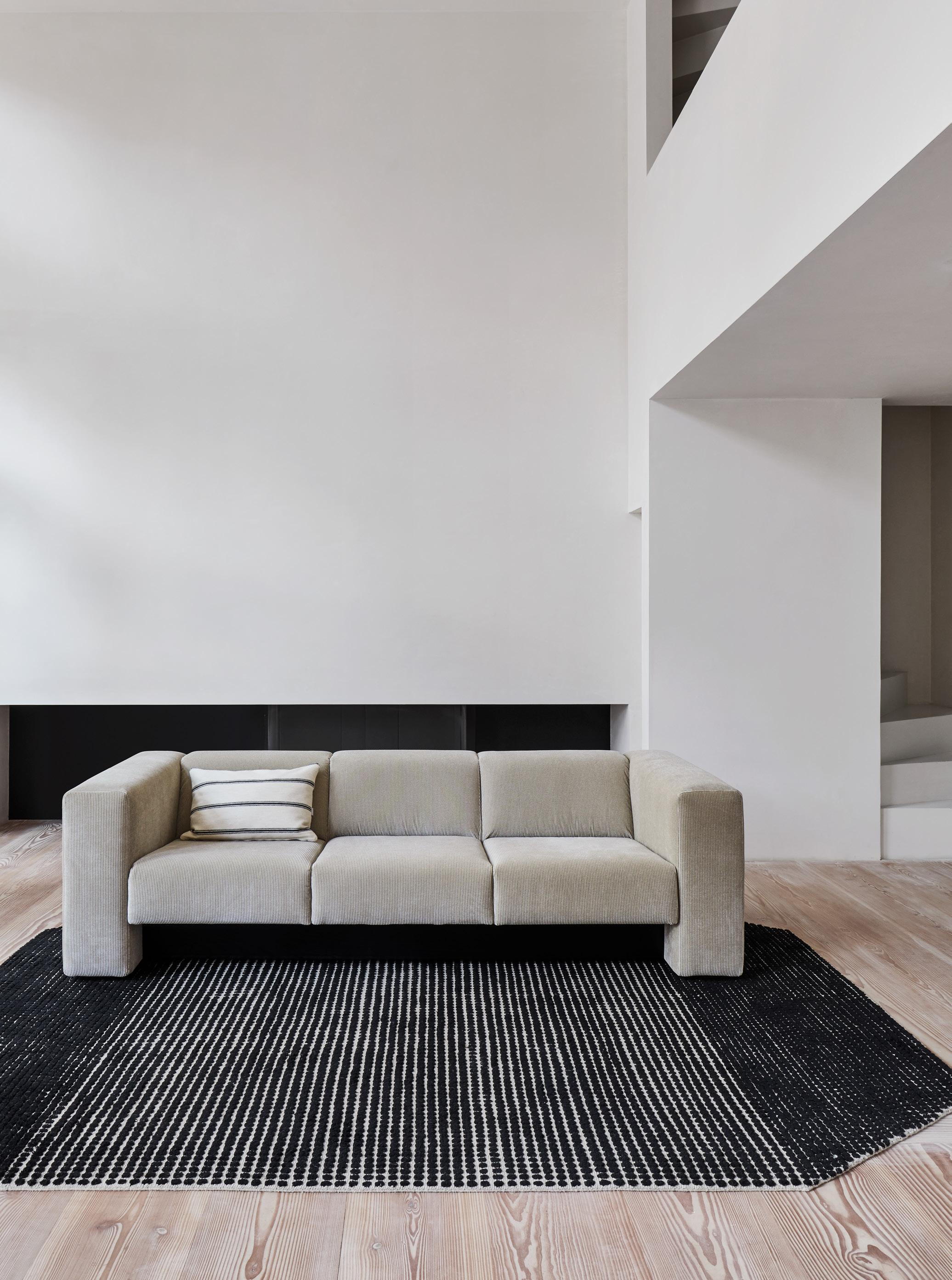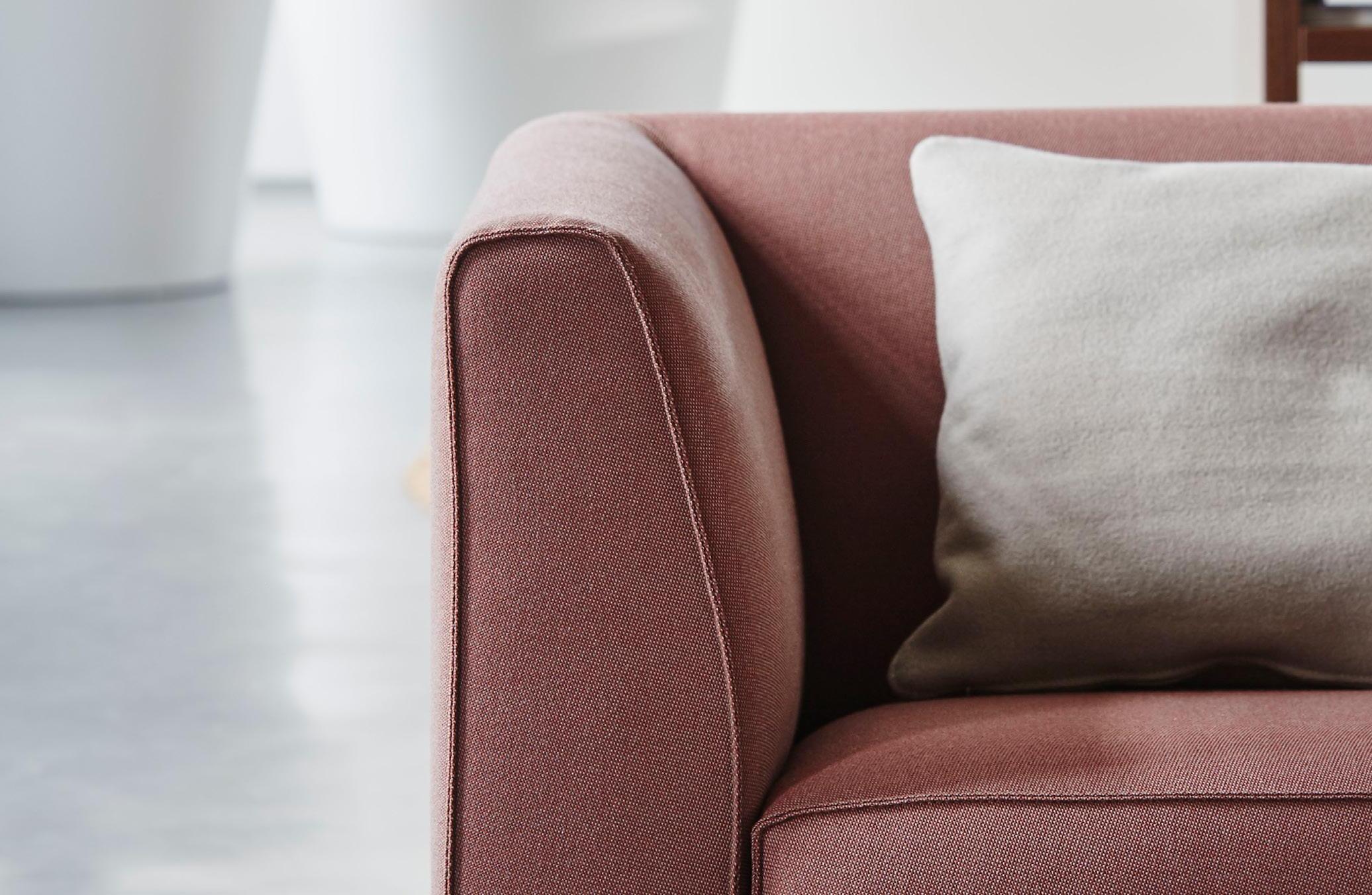 The 10010 Prime was designed by Studio Truly Truly in 2020. The sofa is comfortable, and its thick, almost voluptuous seat makes it look soft yet architectural. The arm cushions hang just slightly over the edge of the slender base, giving the design character.